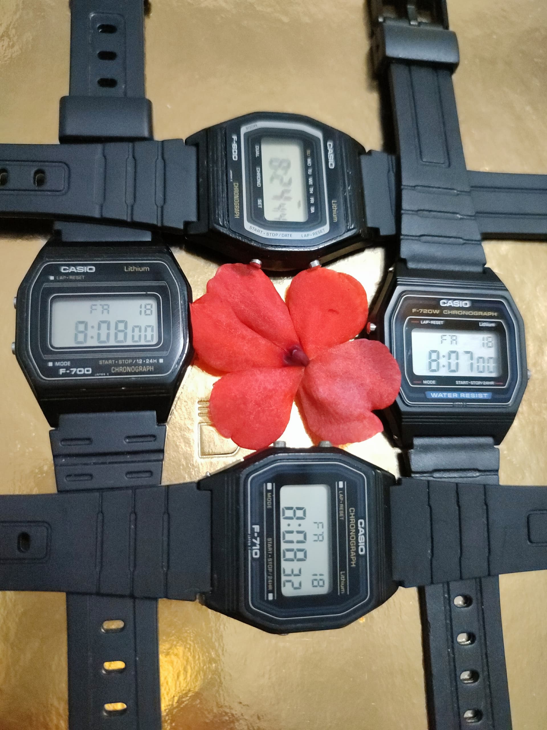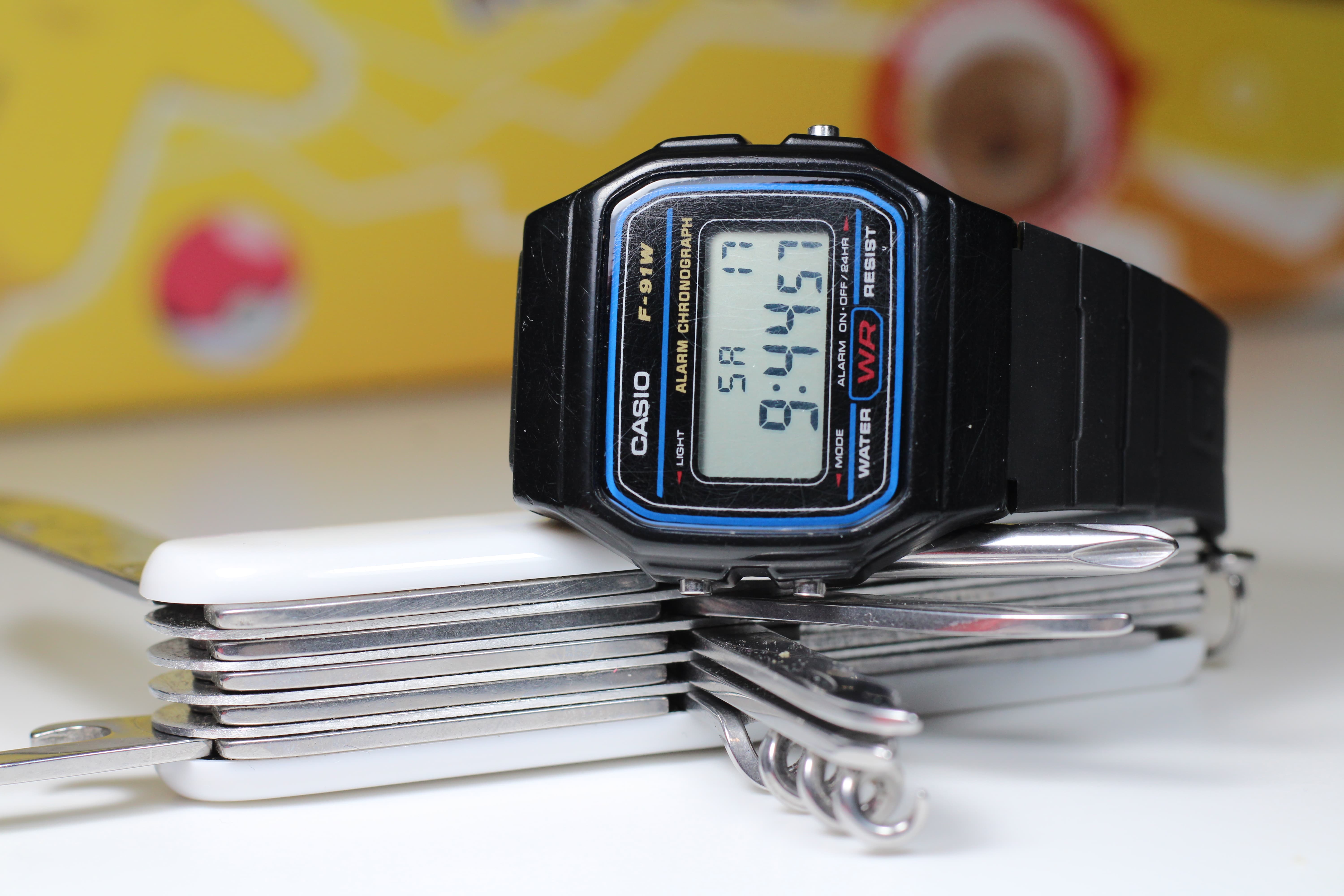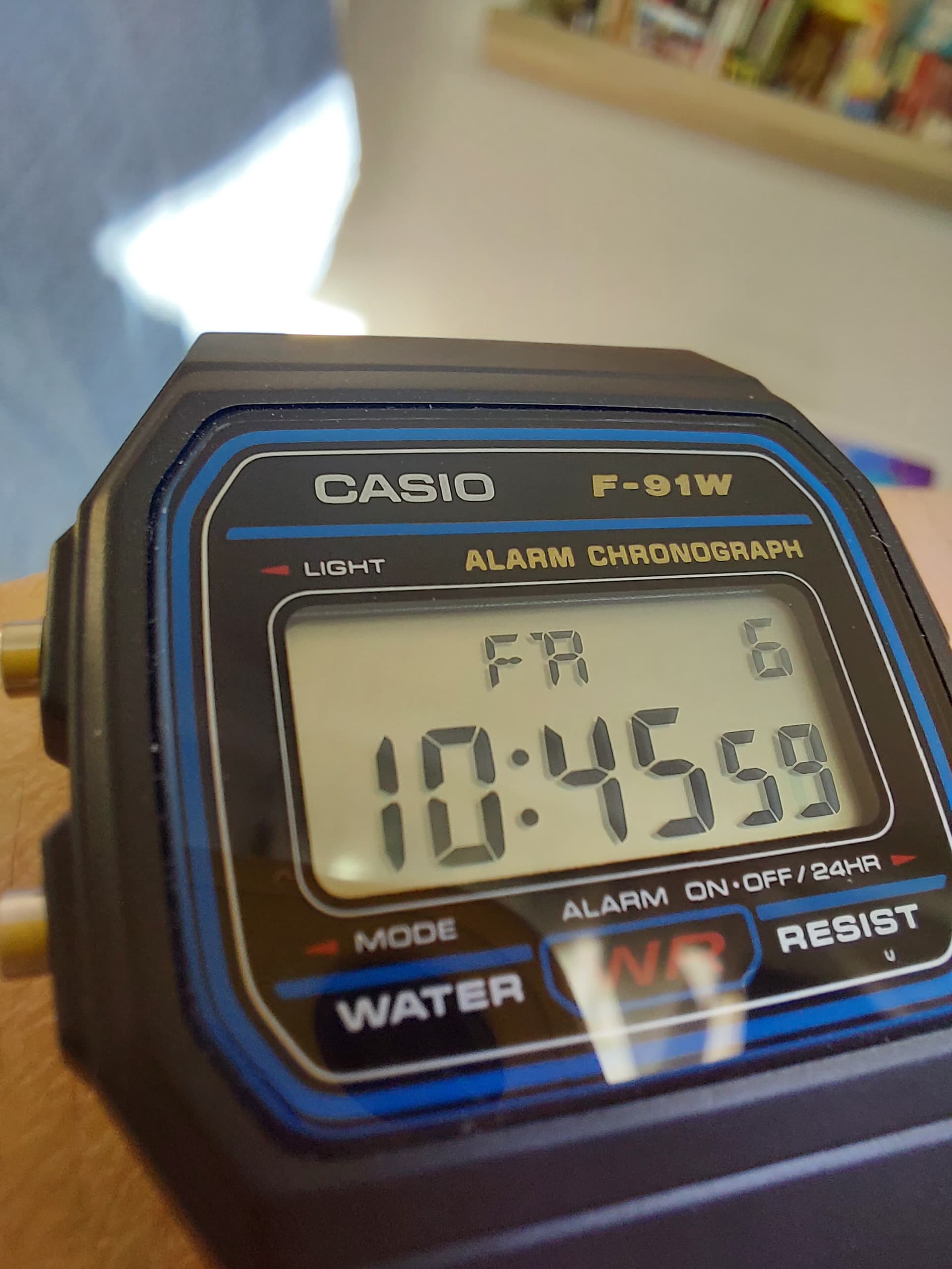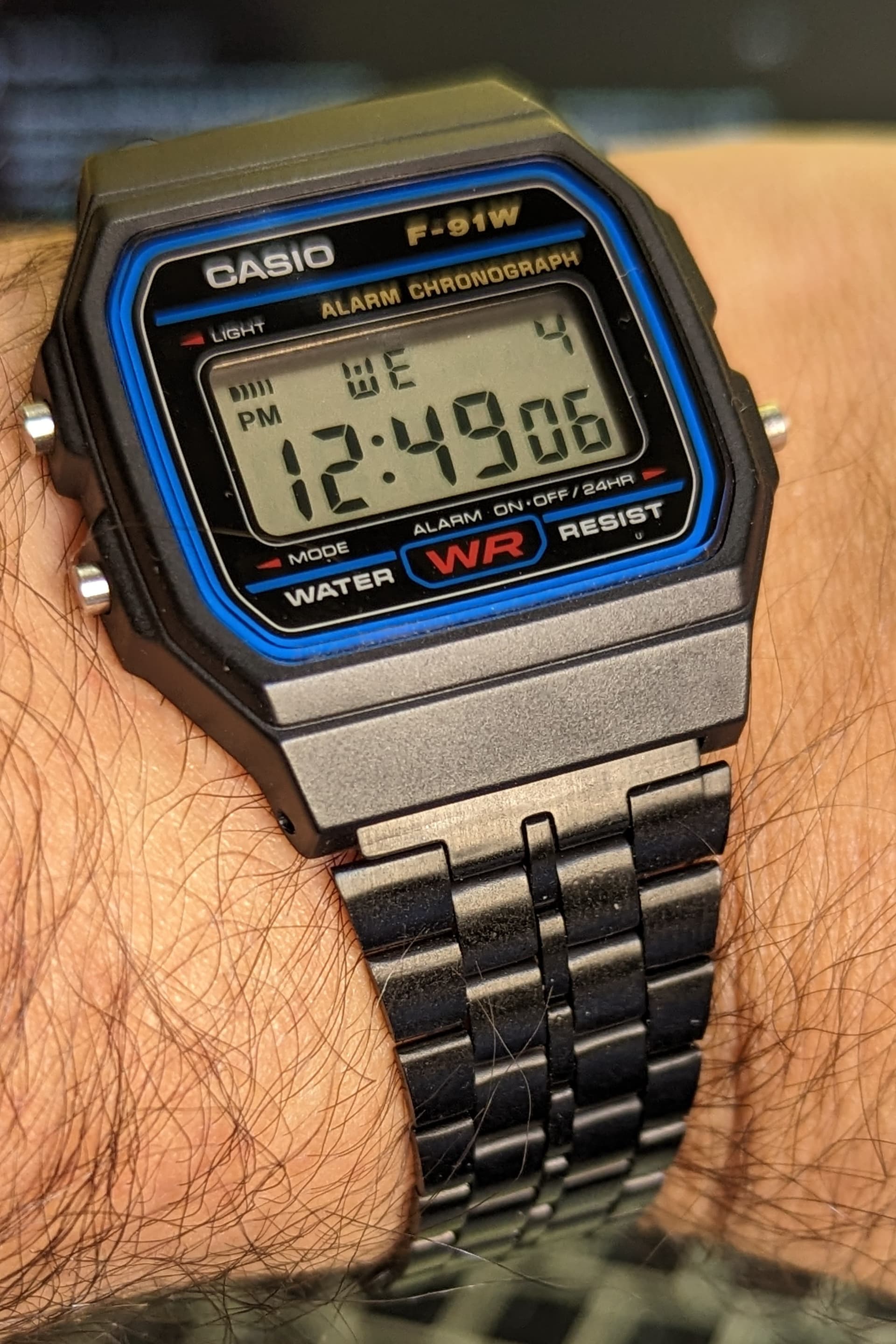 Buenos días, el Casio F-91W es el Casio más famoso de todos los F, creo que incluso ha superado al icónico F-100 pero el diseño del display y el tipo de caja está inspirado en el F-84, F-86 y F-87 y antes que estos Casio fabricó relojes que eran iguales pero no tenían alarma.