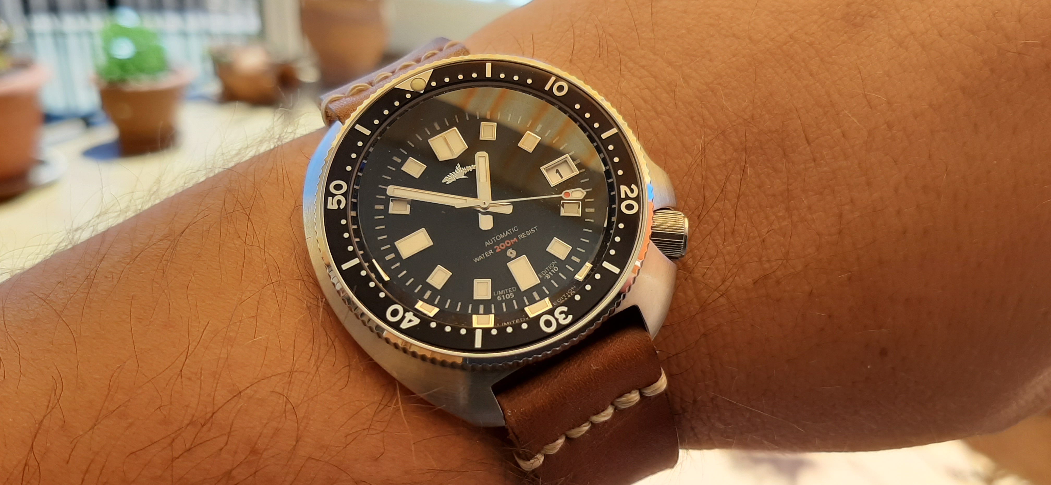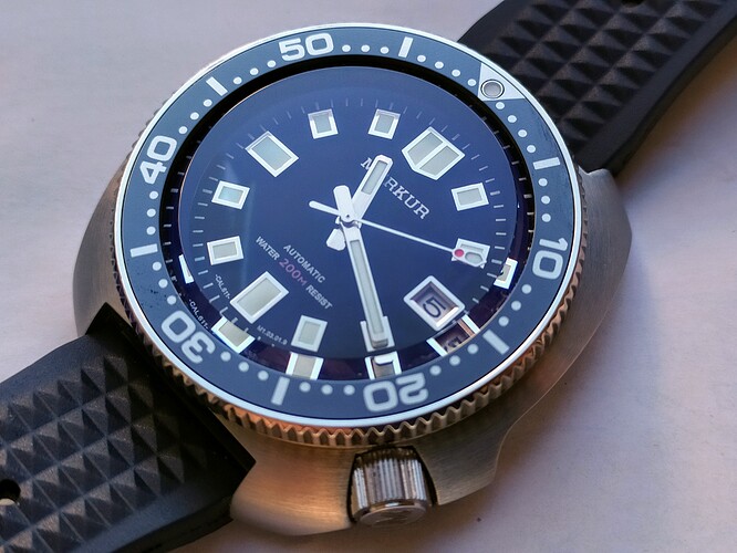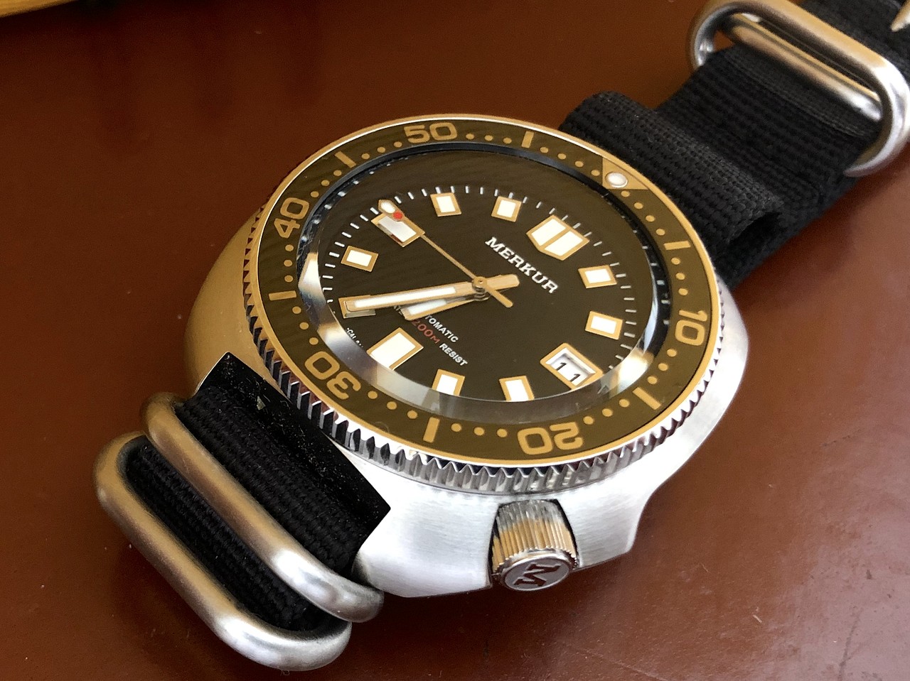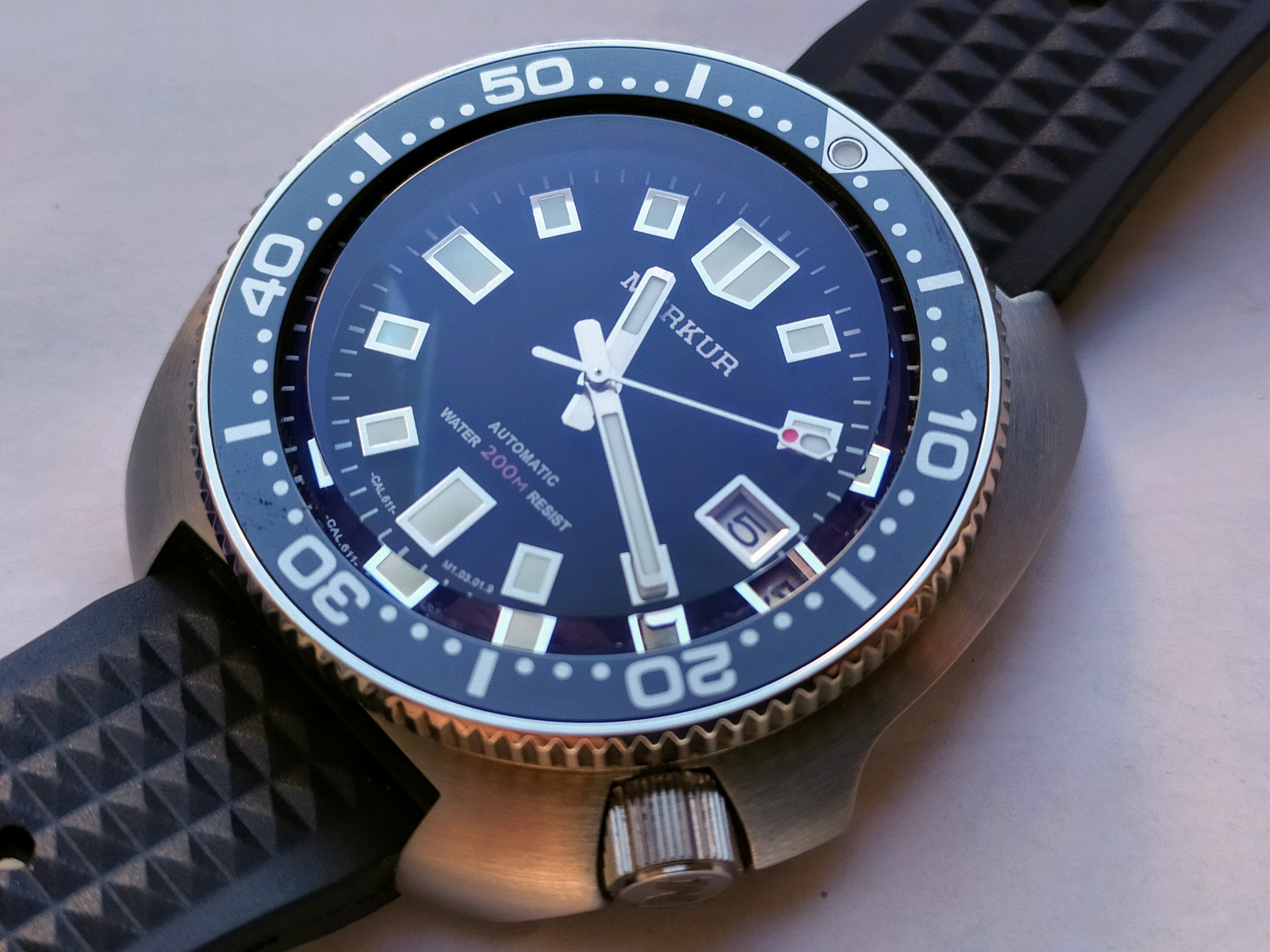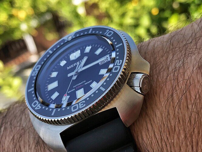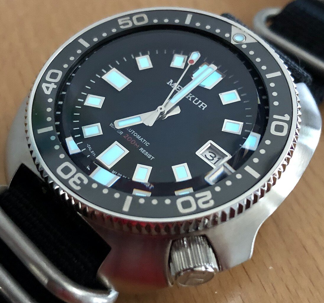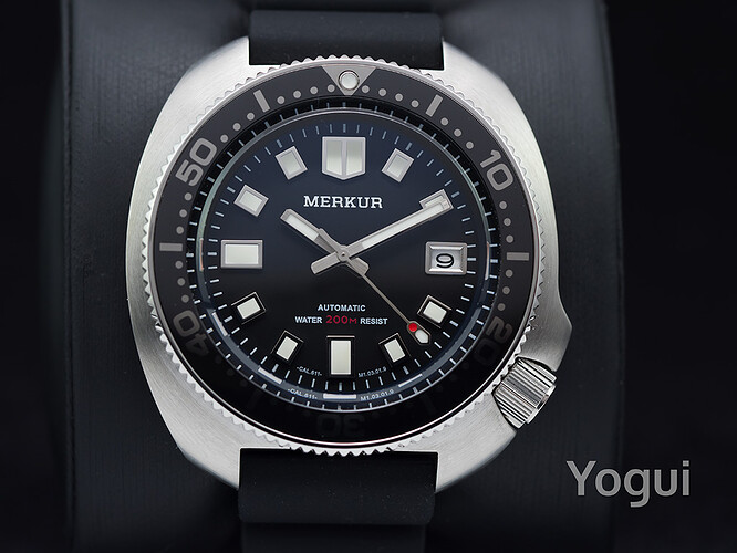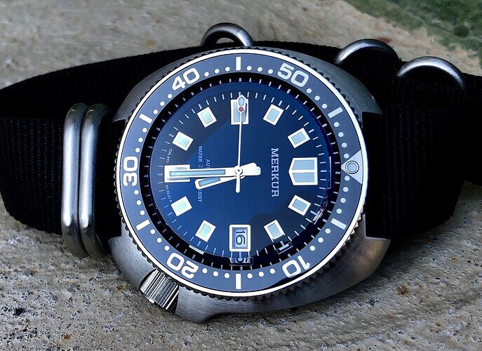 el merkur muy buena calidad, en todo, agujas bisel ceramico, dial muy bien realizado, calidad sorprendente de veras, lo malo es que ya no hay, en su dia tuvimos siuerte unos cuantos en una promo de ali… y no volvieron a salir mas, tampoco creo que salgan de segunda mano. una cosa que me sorprendio fue su AR interno, bastante bueno en su cristal abombado