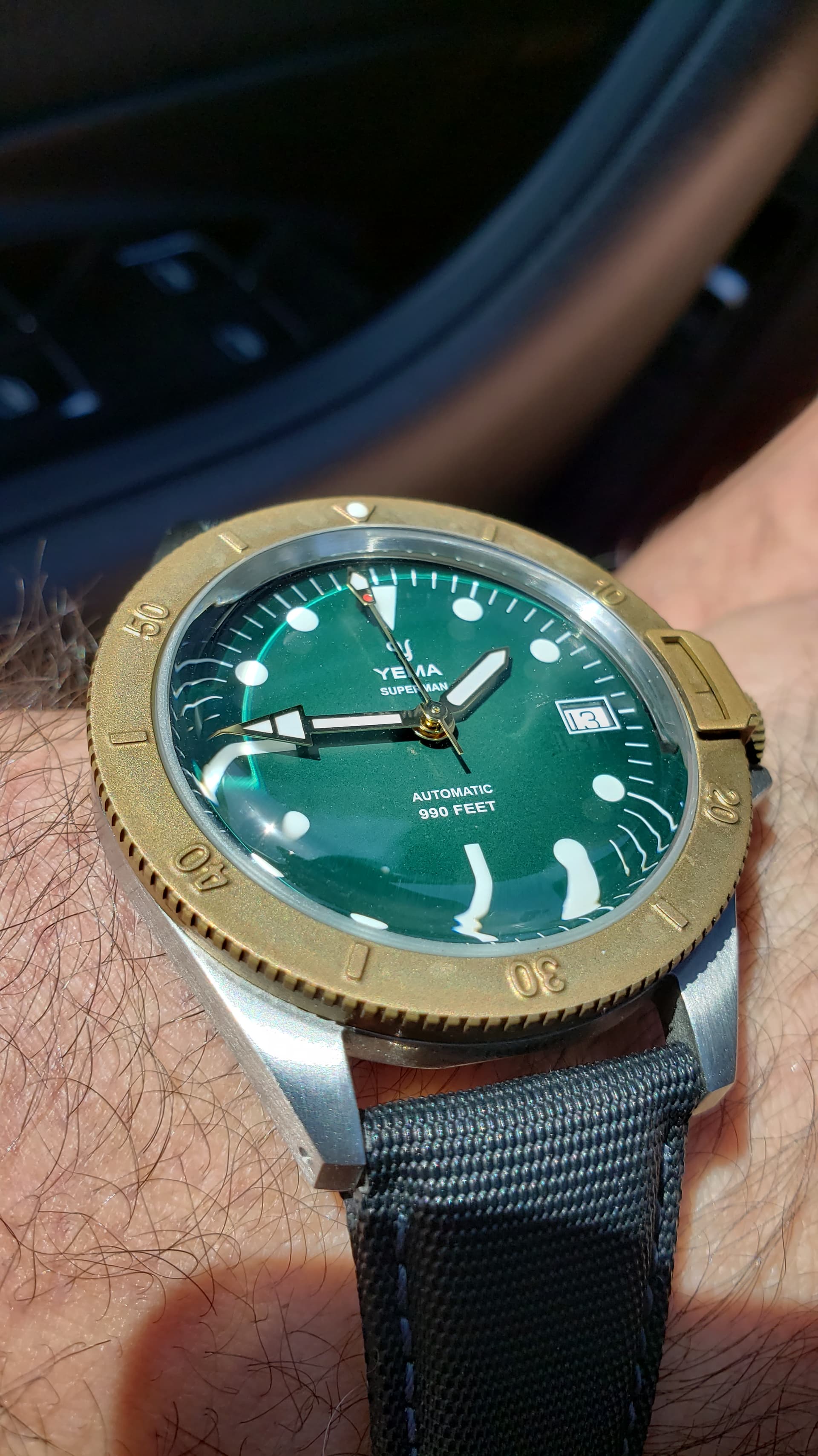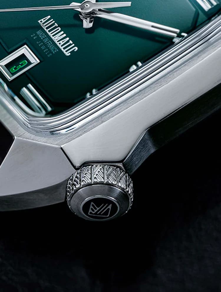 En la foto se ve también el zafiro, cuadrado y abombado con efecto plexy, y una corona a las 4 que le da personalidad al diseño, y que se ve impresionante. Y otro detalle. Por capricho del diseñador, el número 3 del fechador está en verde.