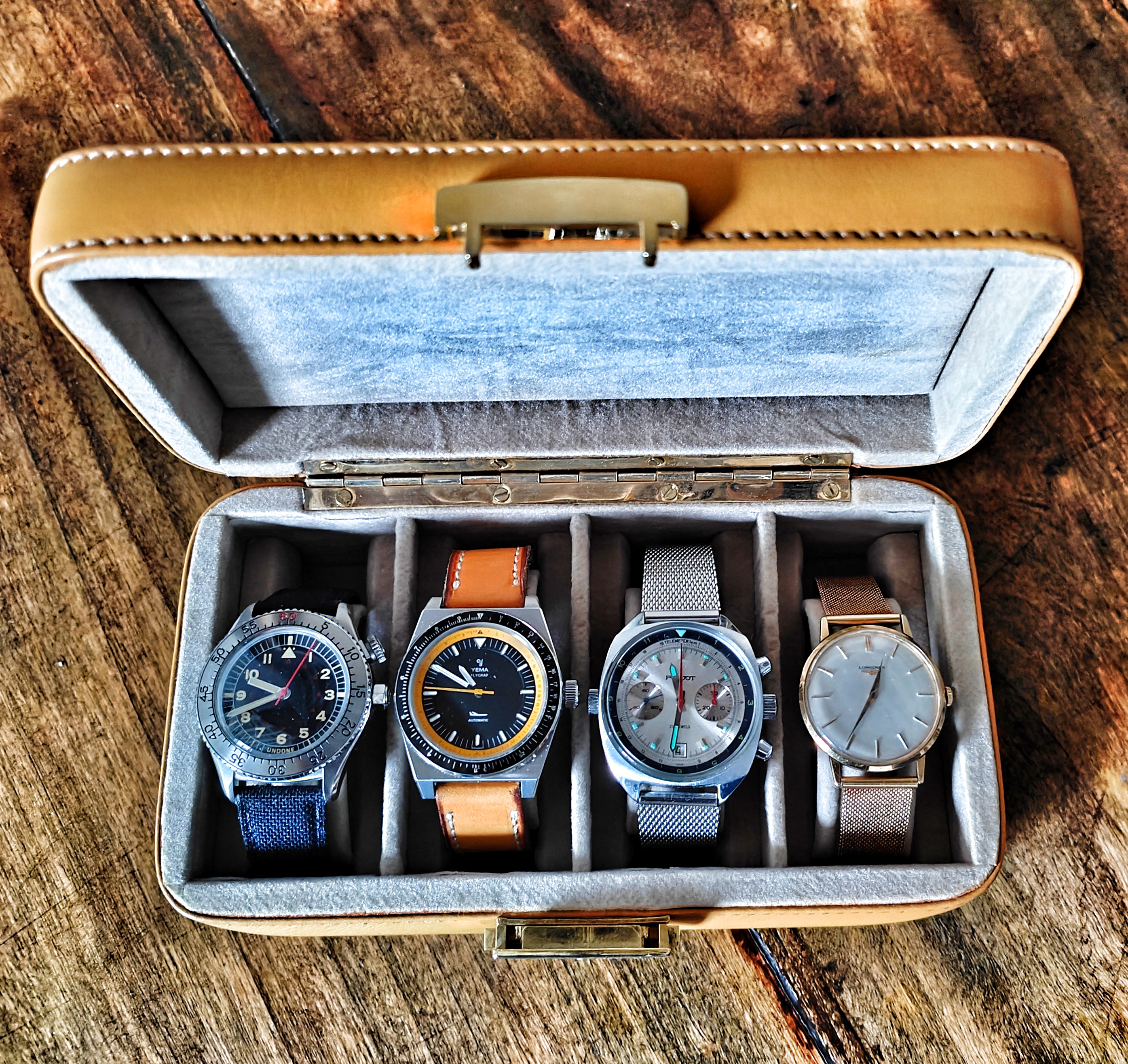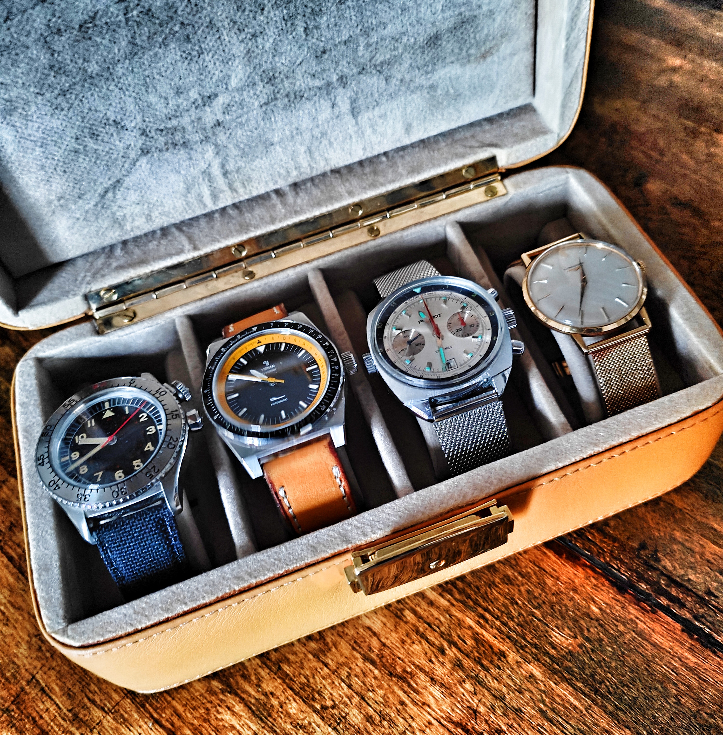 Cómo tenía que hacer sitio en mi caja principal de dieciocho relojes para algunas nuevas llegadas voy a usar este estuche para los cuatro relojes más pequeños, que van de entre los 37 y los 39 mm. de caja.