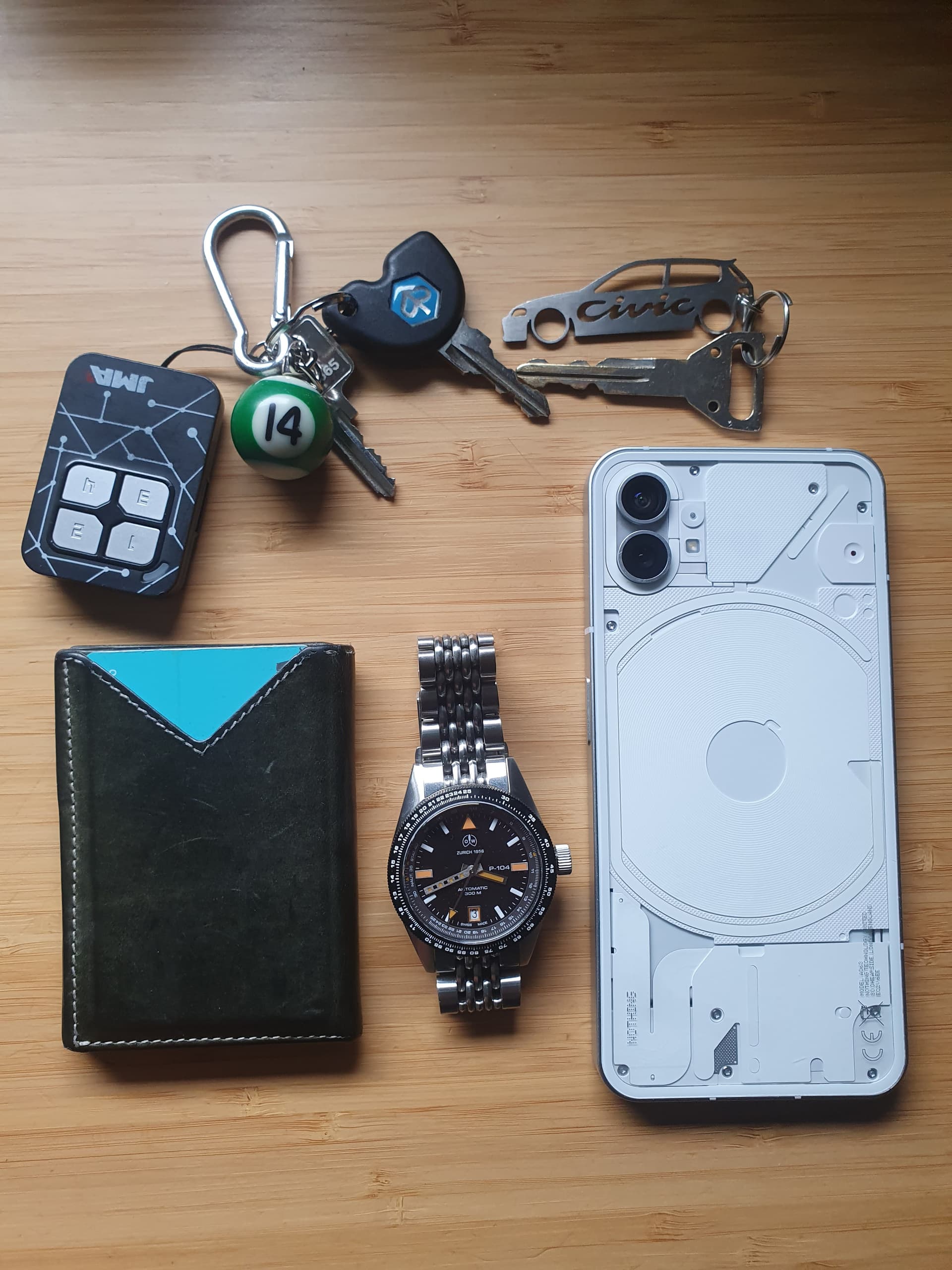 Aunque tengo un poco de todo lo anterior, dado que no llevo pantalones multibolsillos, bolsos o bandoleras, usualmente sólo suelo llevar encima lo de la foto de arriba (móvil, auriculares, reloj y peine), mas un paquetito semivacío de kleen-ex, el monedero y las llaves, que tengo sin llavero.