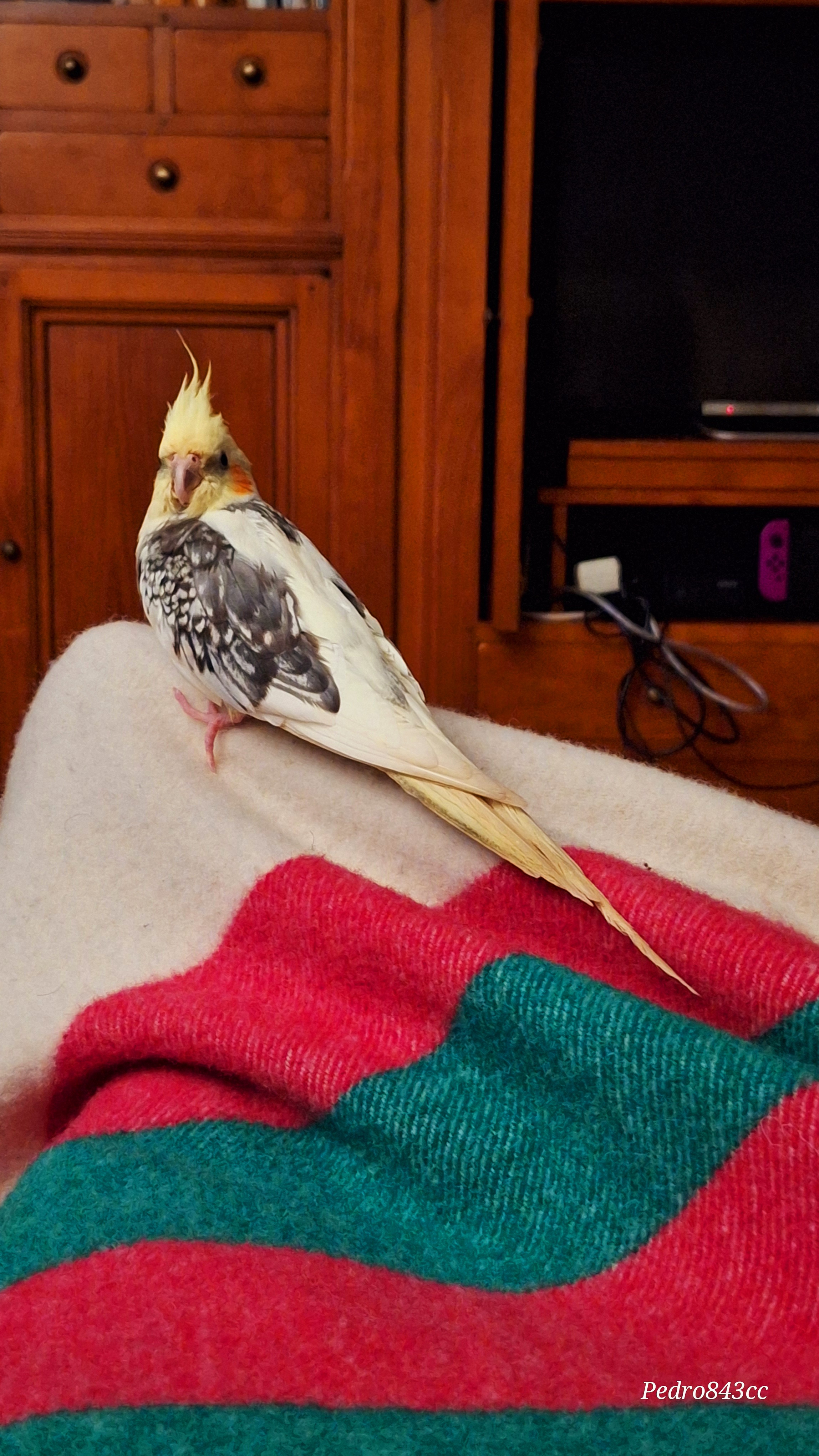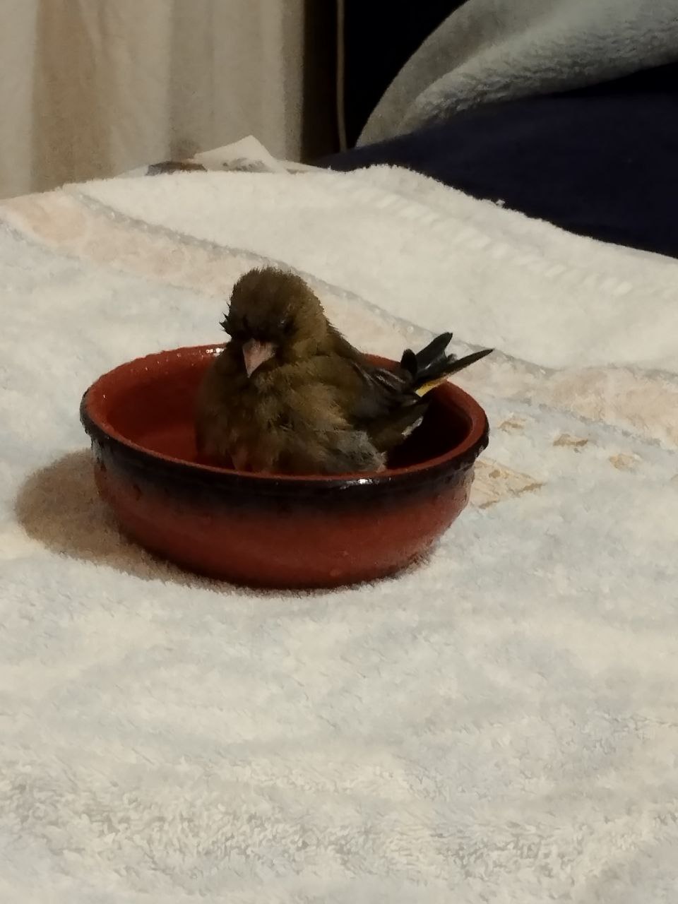 Verderón, se lo encontró mi mujer el la puerta del supermercado recién caído del nido, no encontramos el nido para devolverlo y nos lo llevamos a casa para que no se muriera.