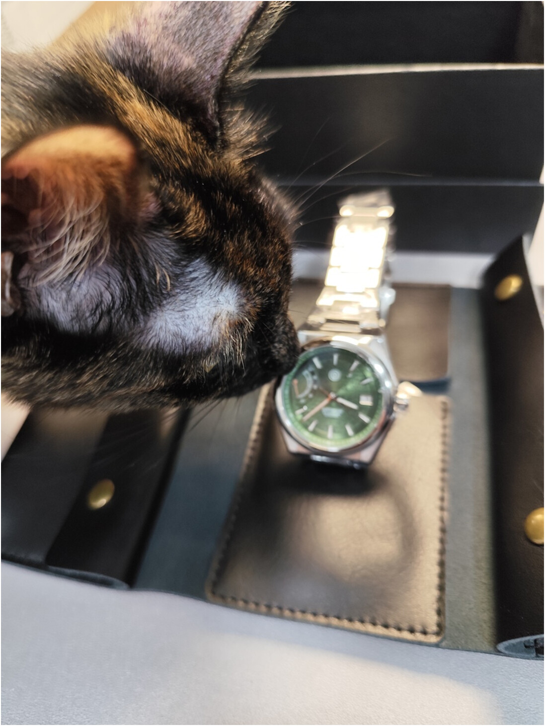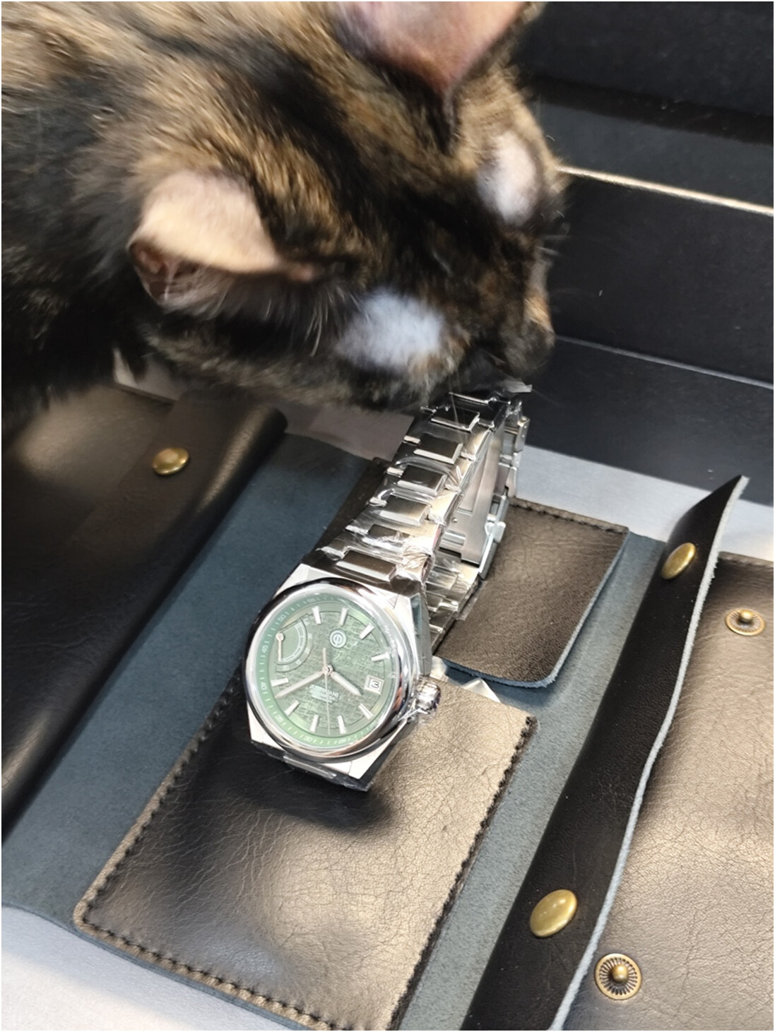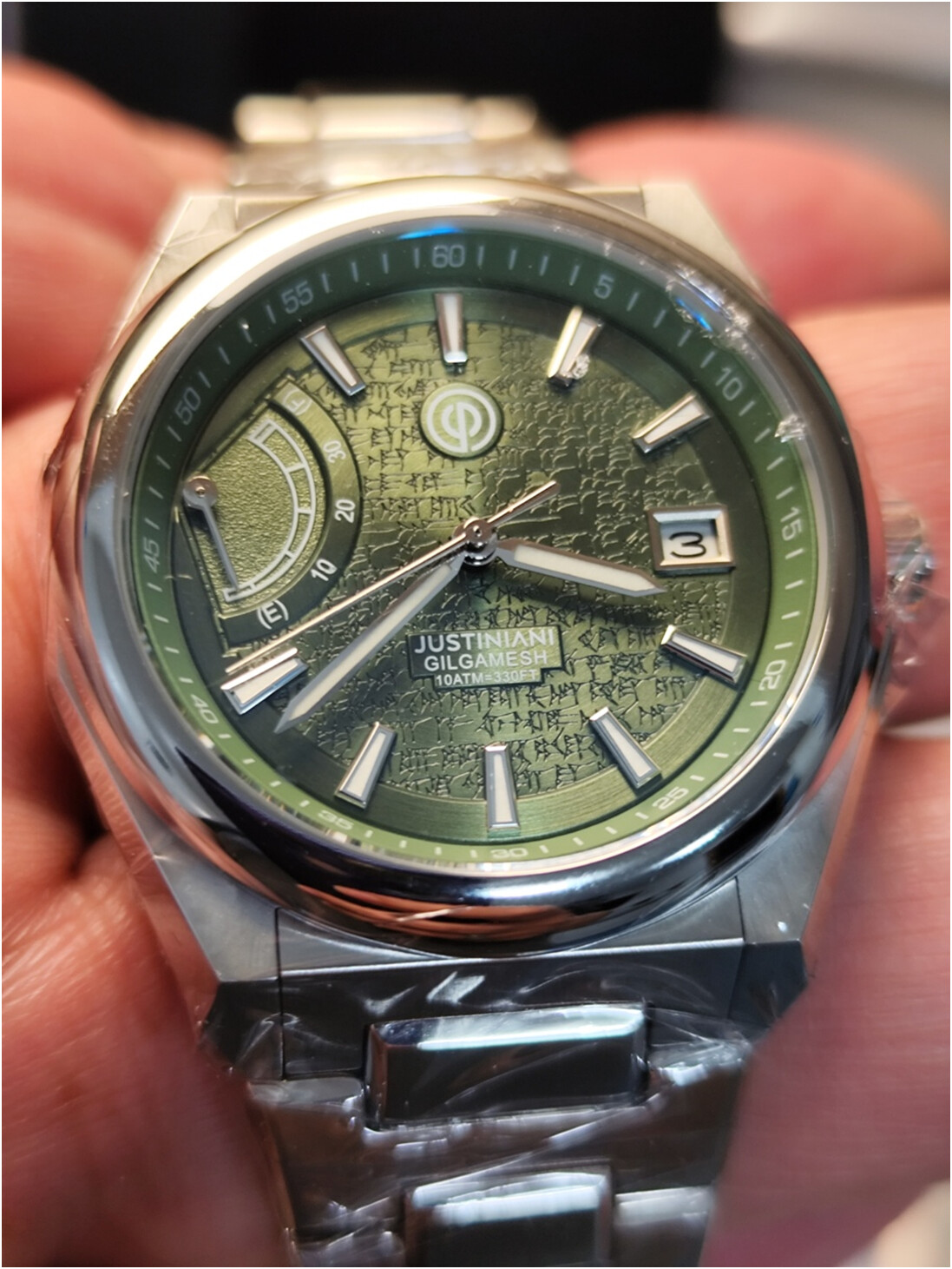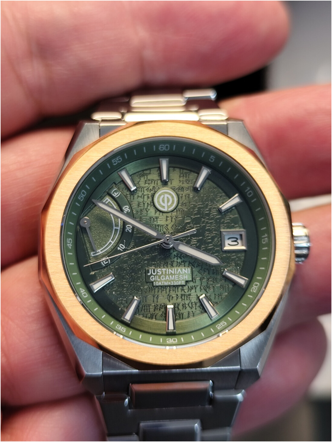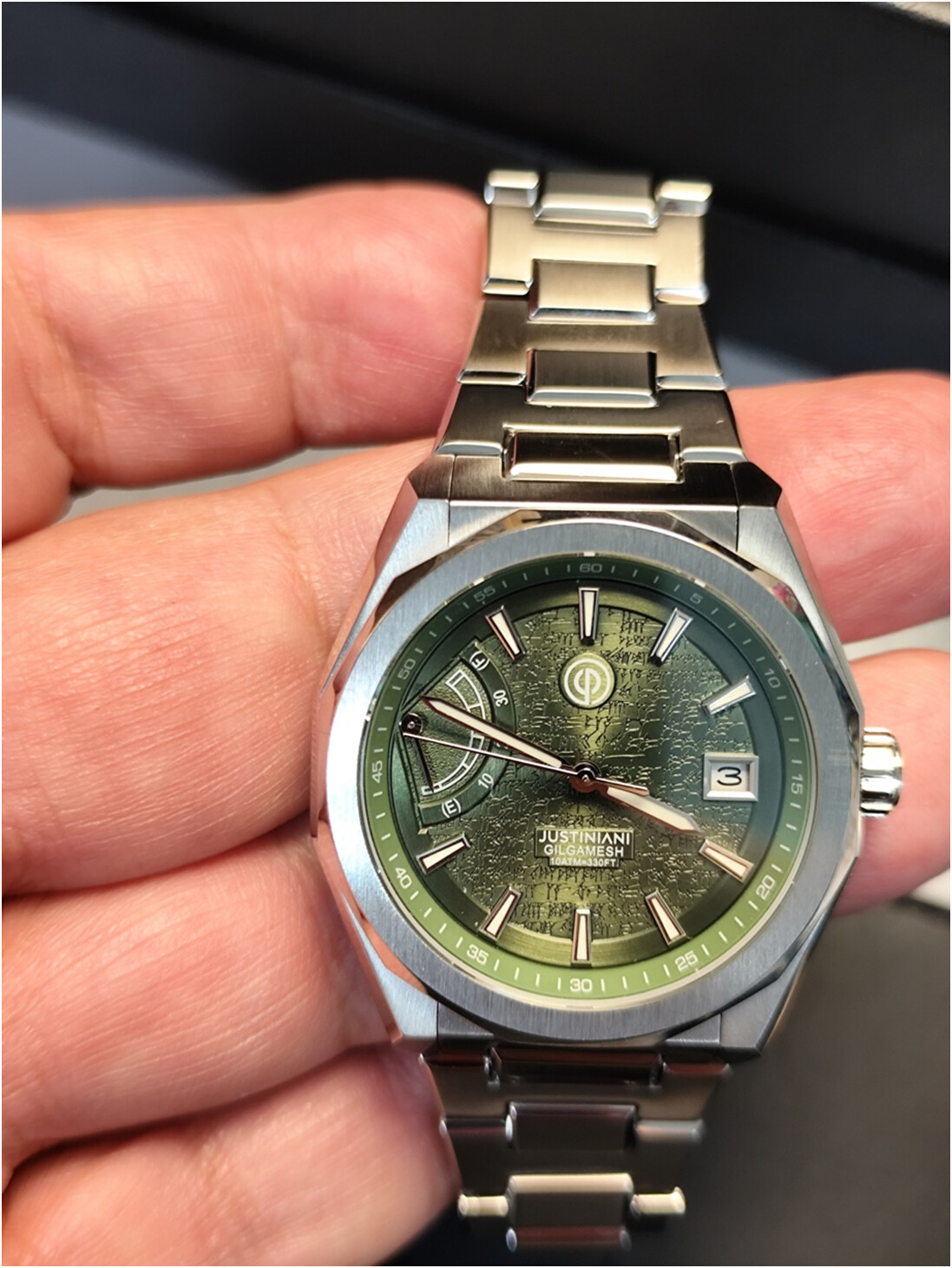 Finalmente, el reloj con el bisel redondo y los dos octogonales intercambiables. De las versiones disponibles, opté por la versión verde por parecerme que es en la que más destacaría el grabado cuneiforme en la esfera.