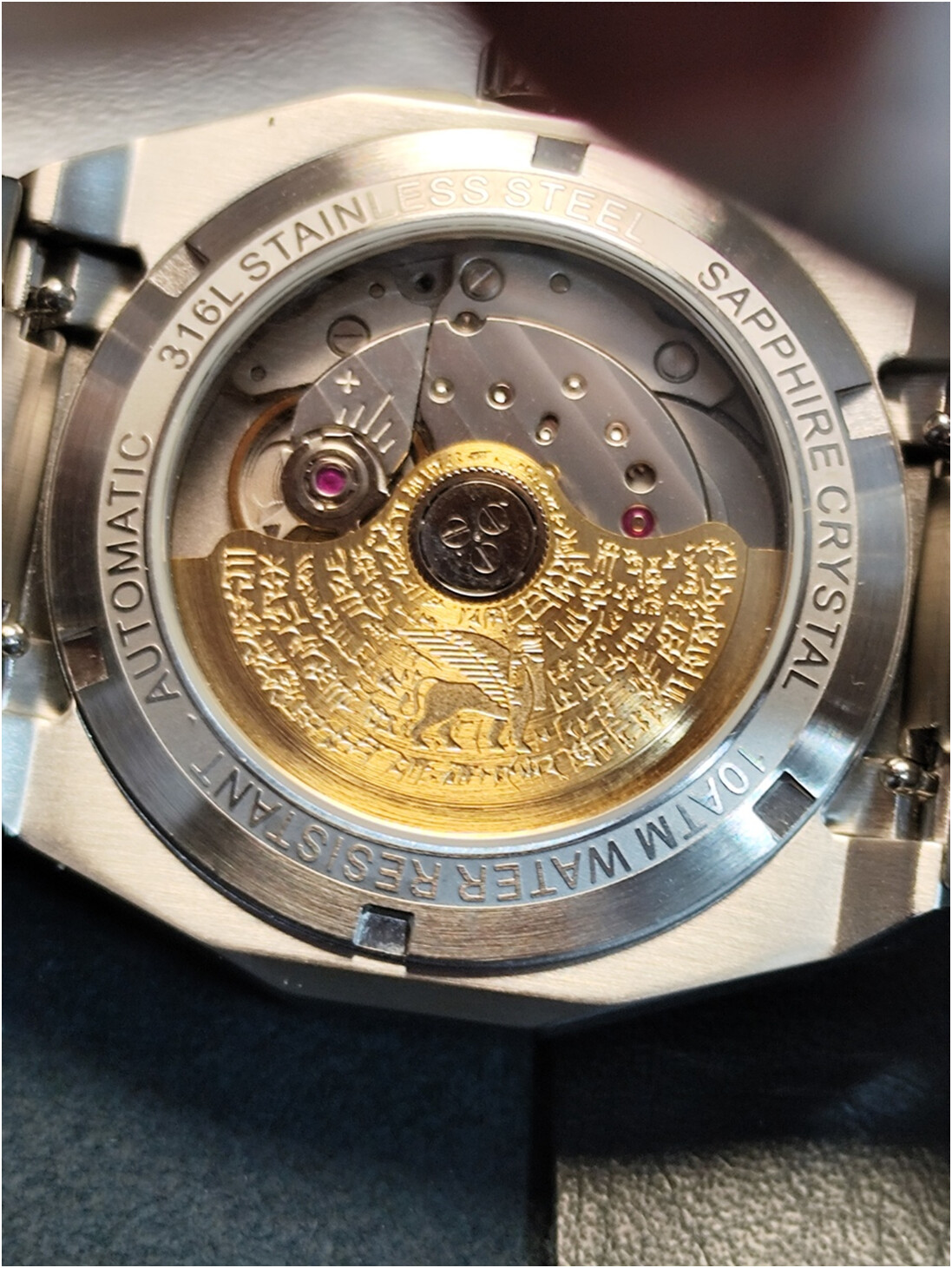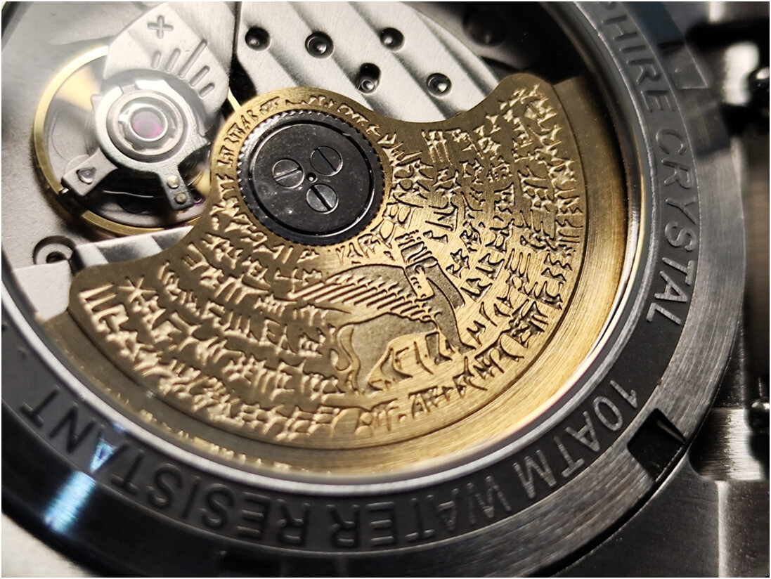 También el movimiento está personalizado. En concreto el rotor, que también presenta un fragmento de escritura cuneiforme y la figura de un lamasu, animal mitológico de la zona, aunque un tanto anacrónico, al aparecer en época posterior a Gilgamesh. Pero mola.