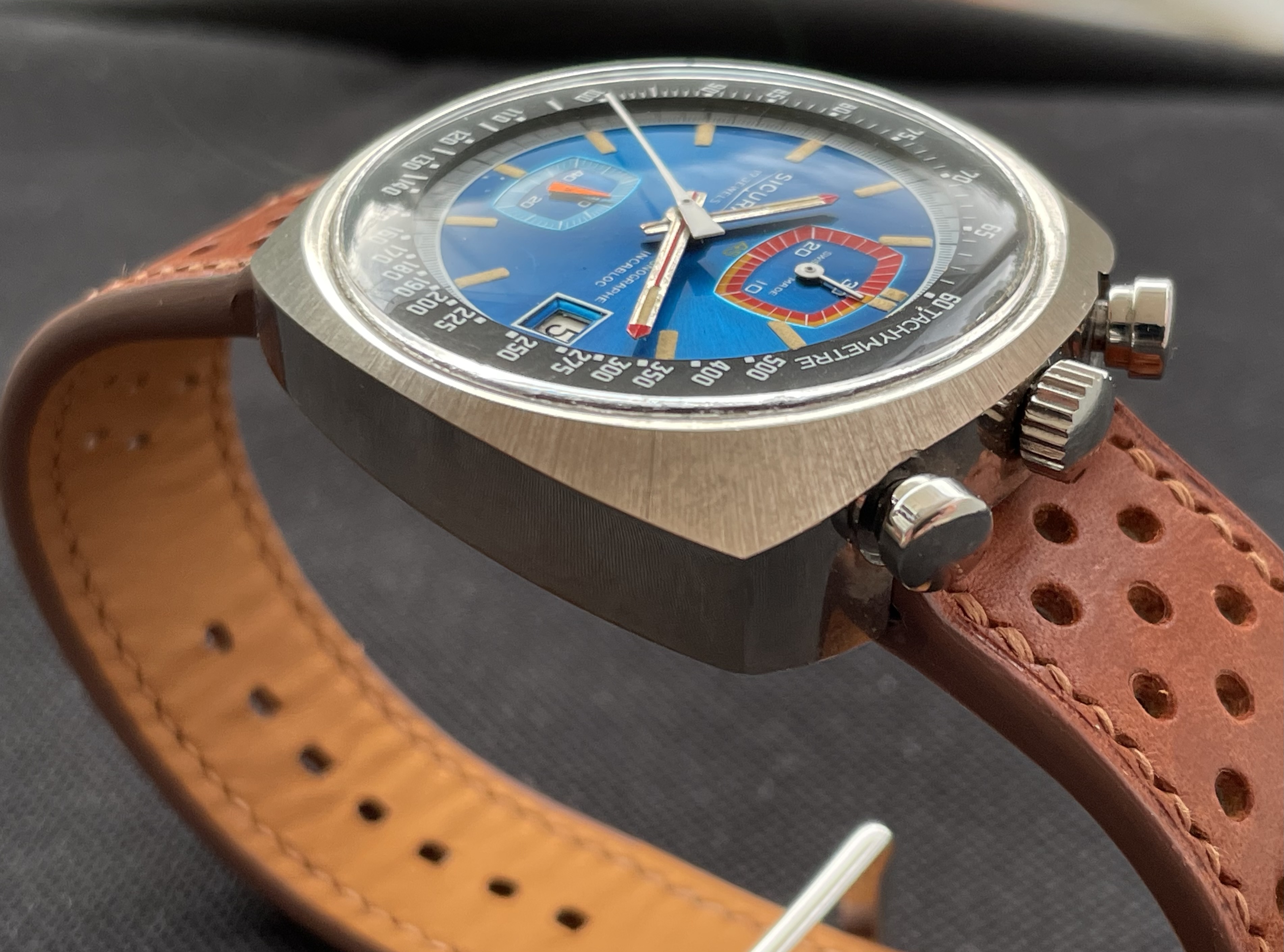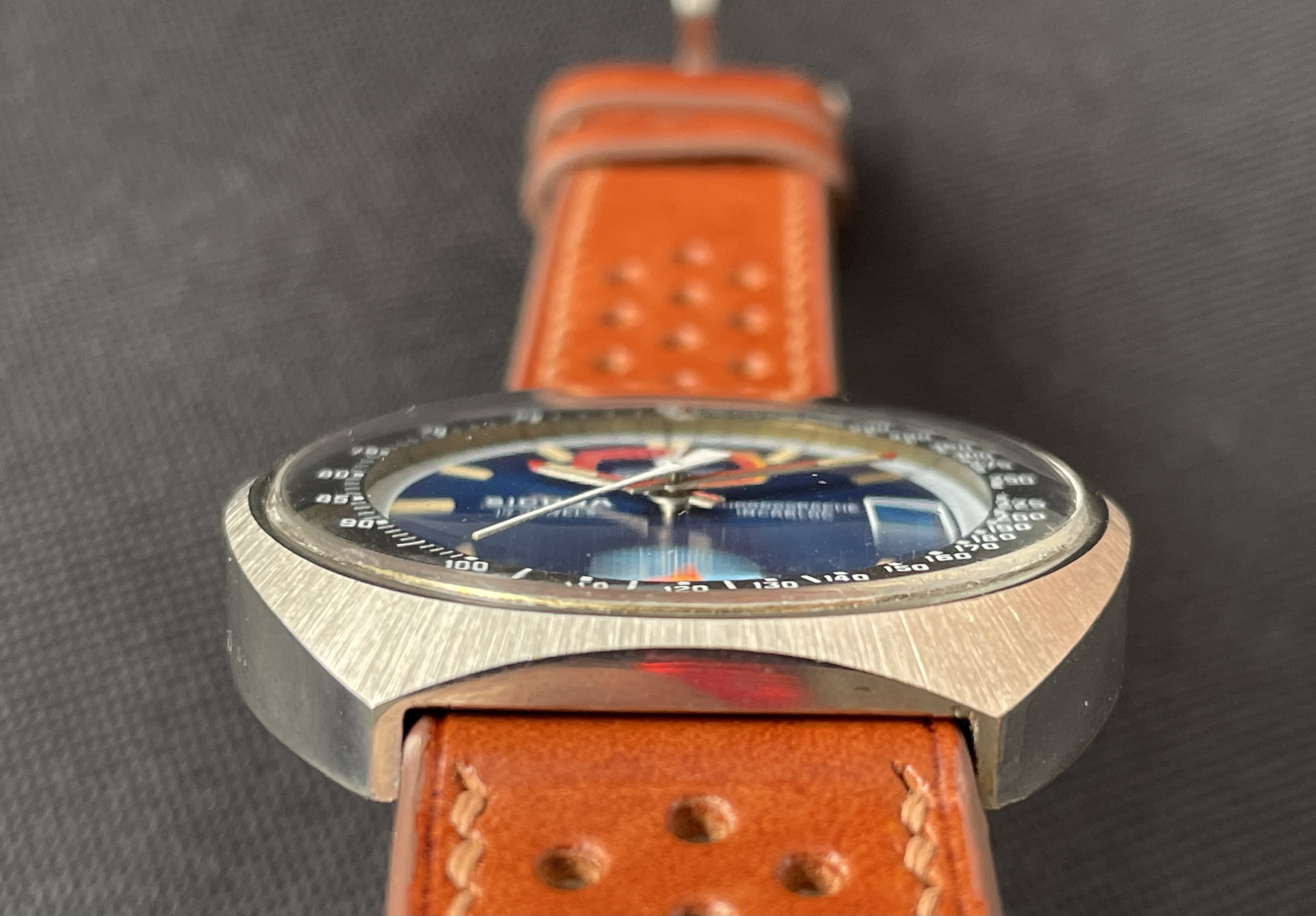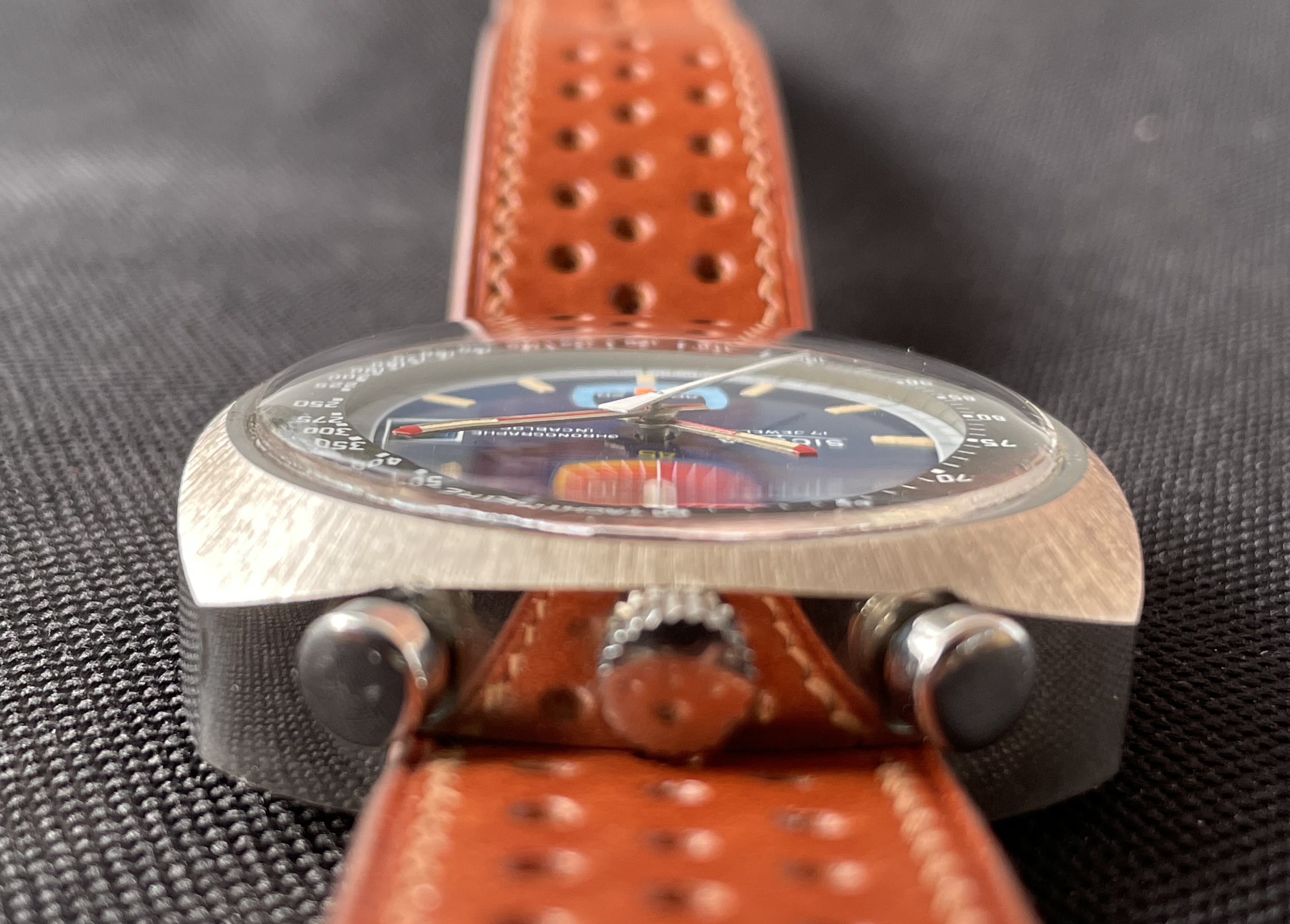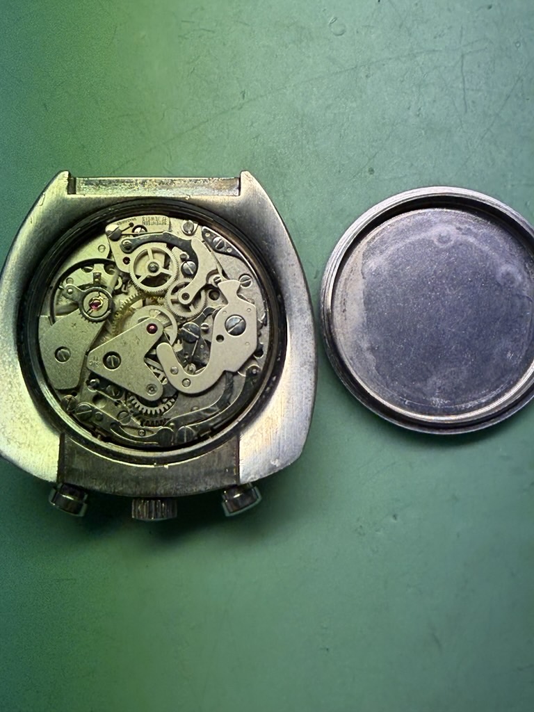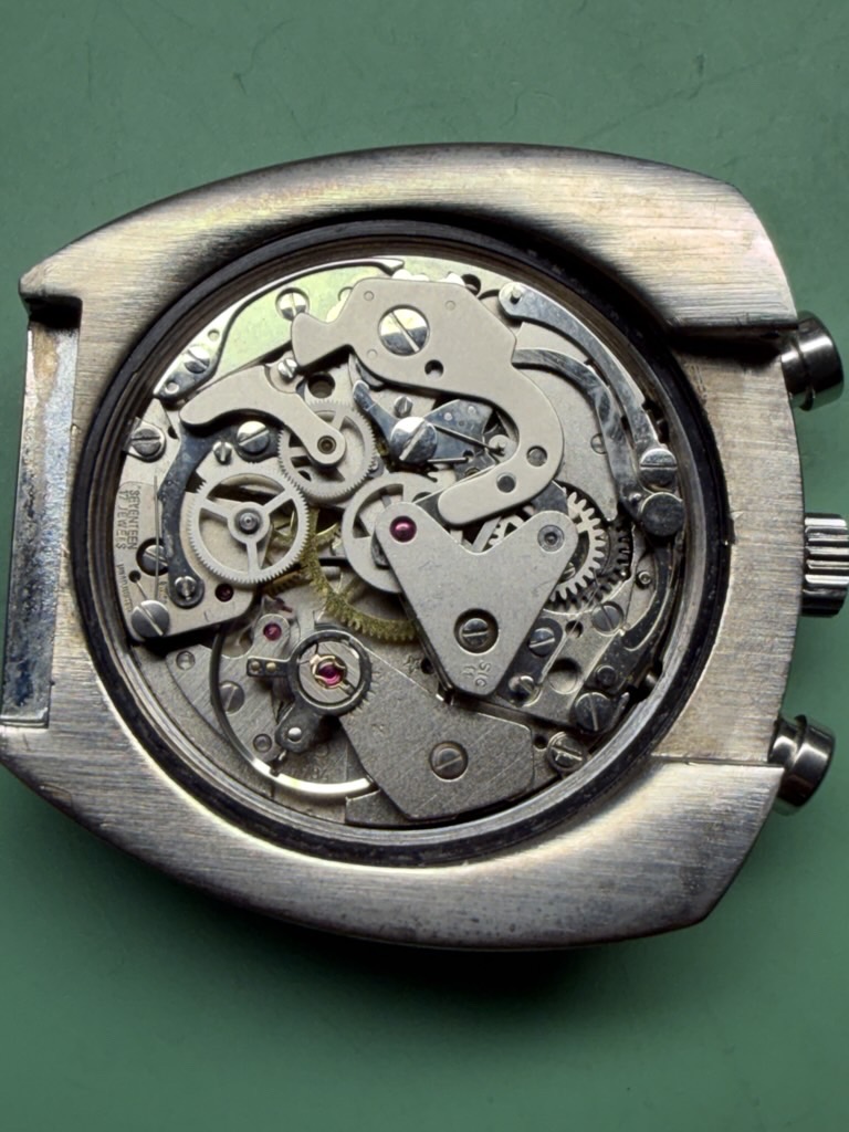 Fabricado en la década de los 70, tiene una caja de 42.8 X 43 mm, y monta un movimento manual Valjoux 7734. De caja asimétrica, la parte superior (pulsadores y la corona), es más ancha y gruesa, mientras que la inferior es más delgada. De esta forma, la esfera queda inclinada hacia las 6 en punto, lo que facilita la lectura de la hora.