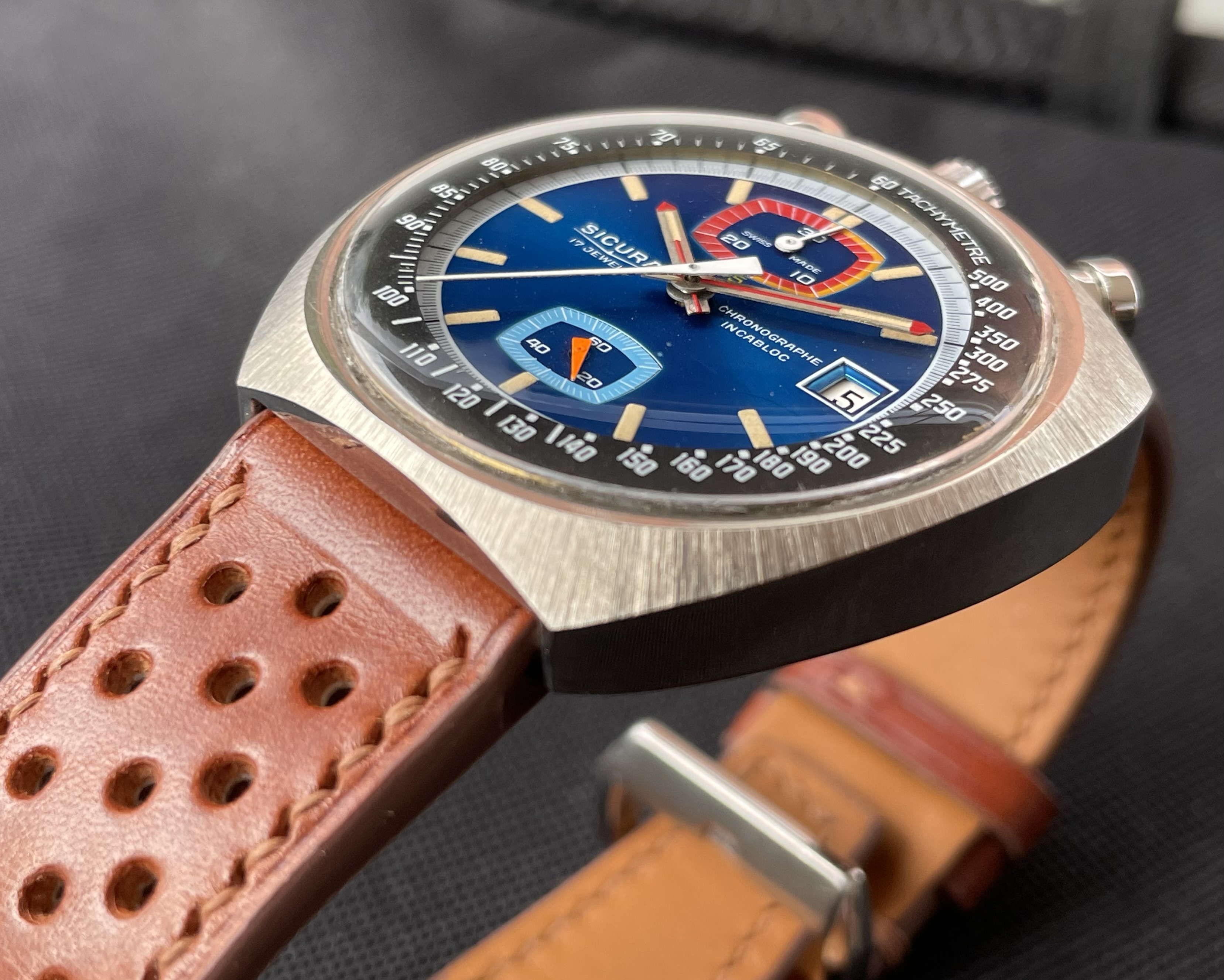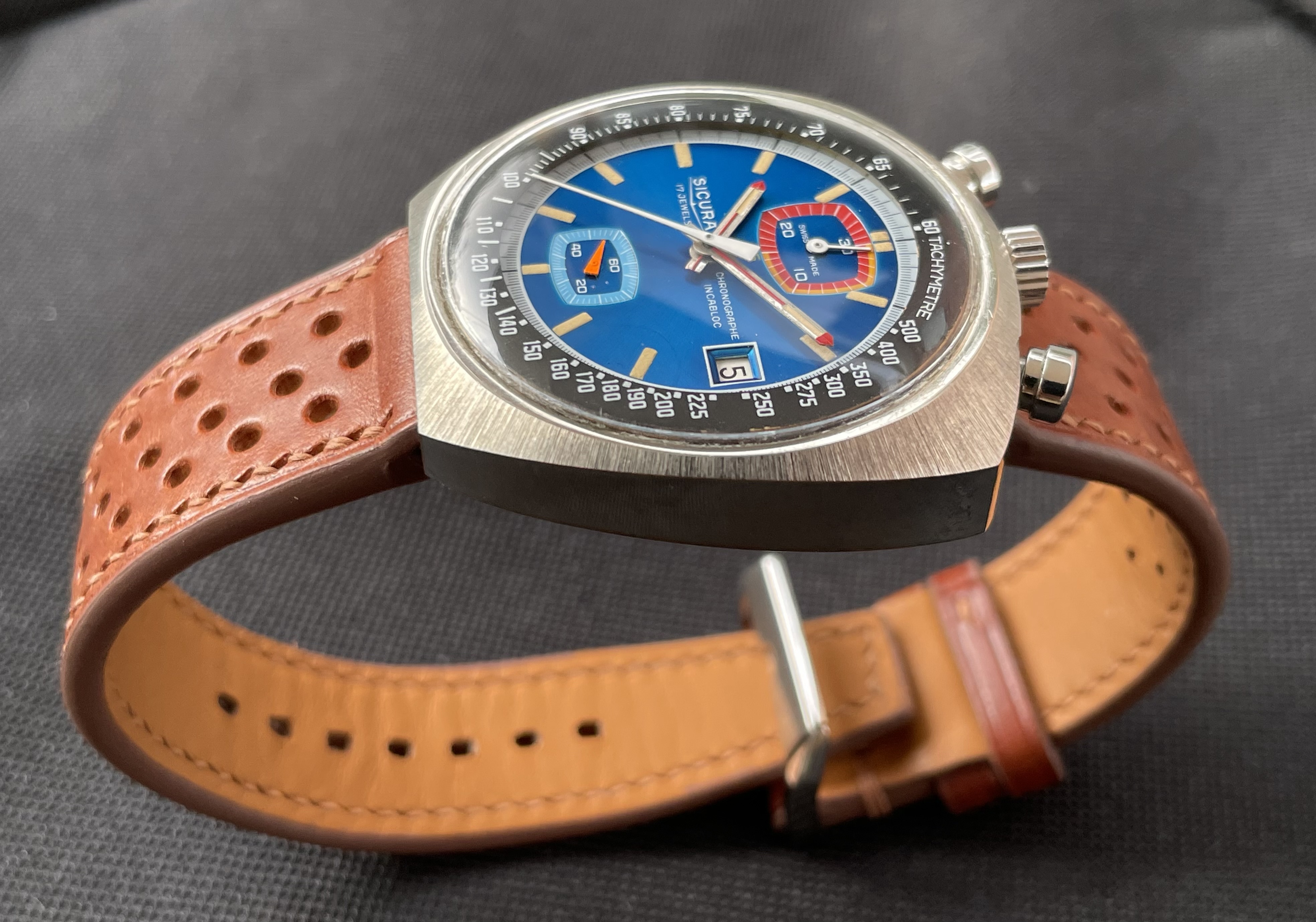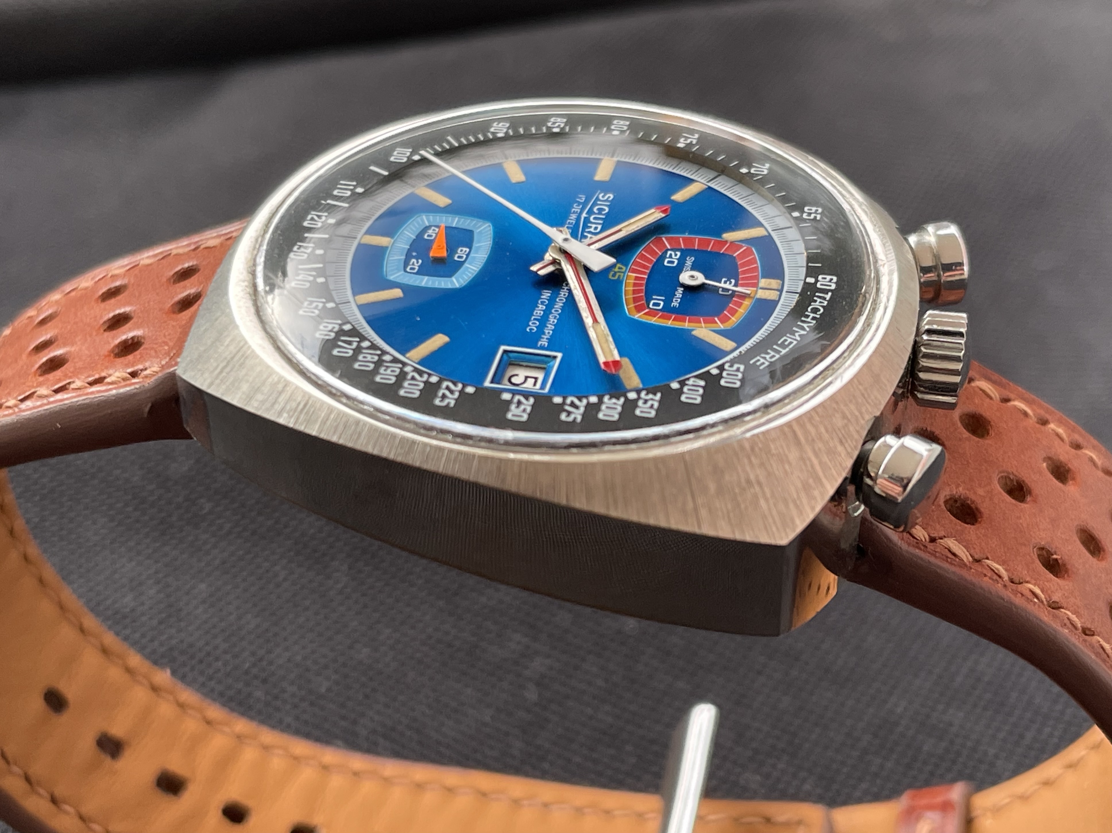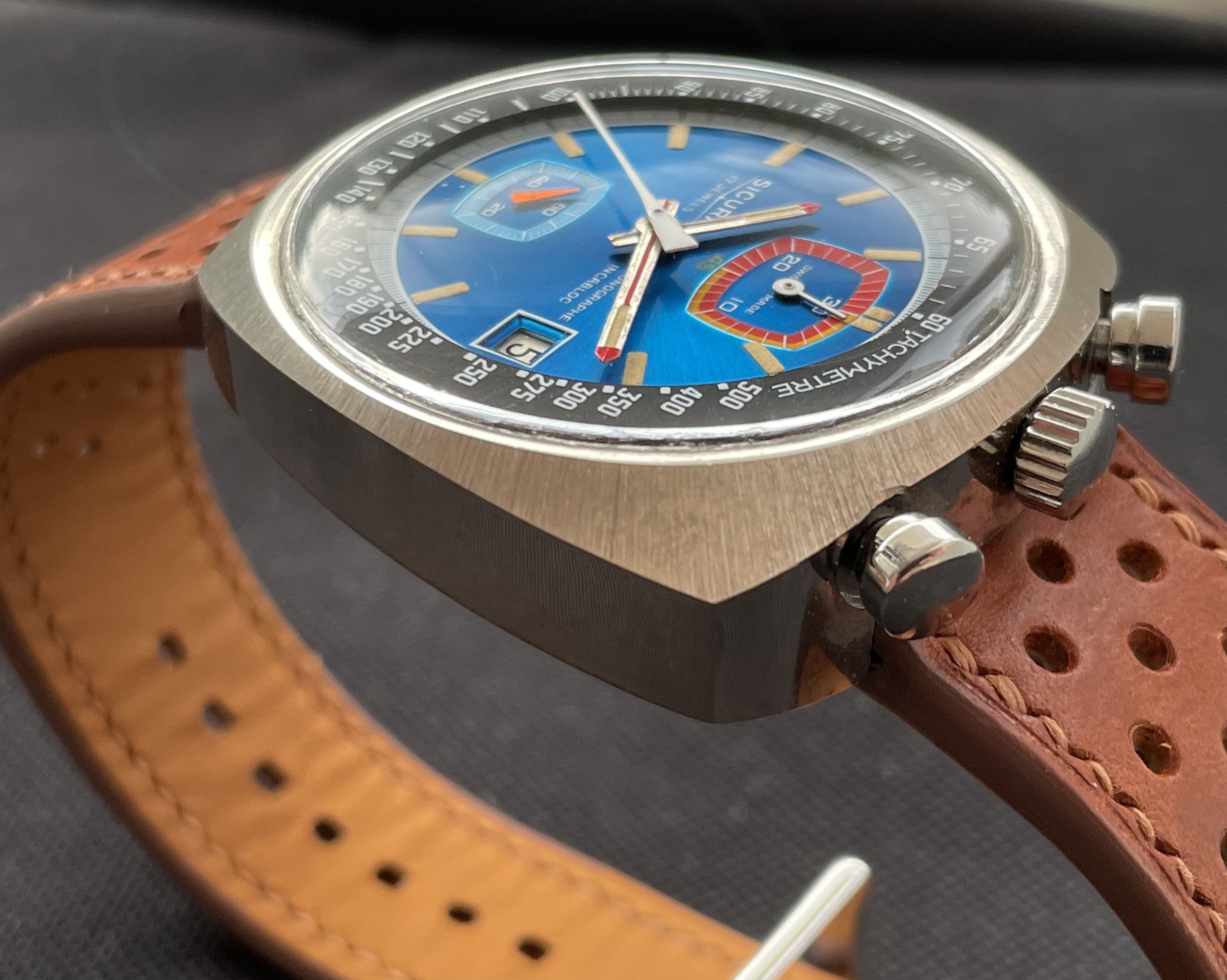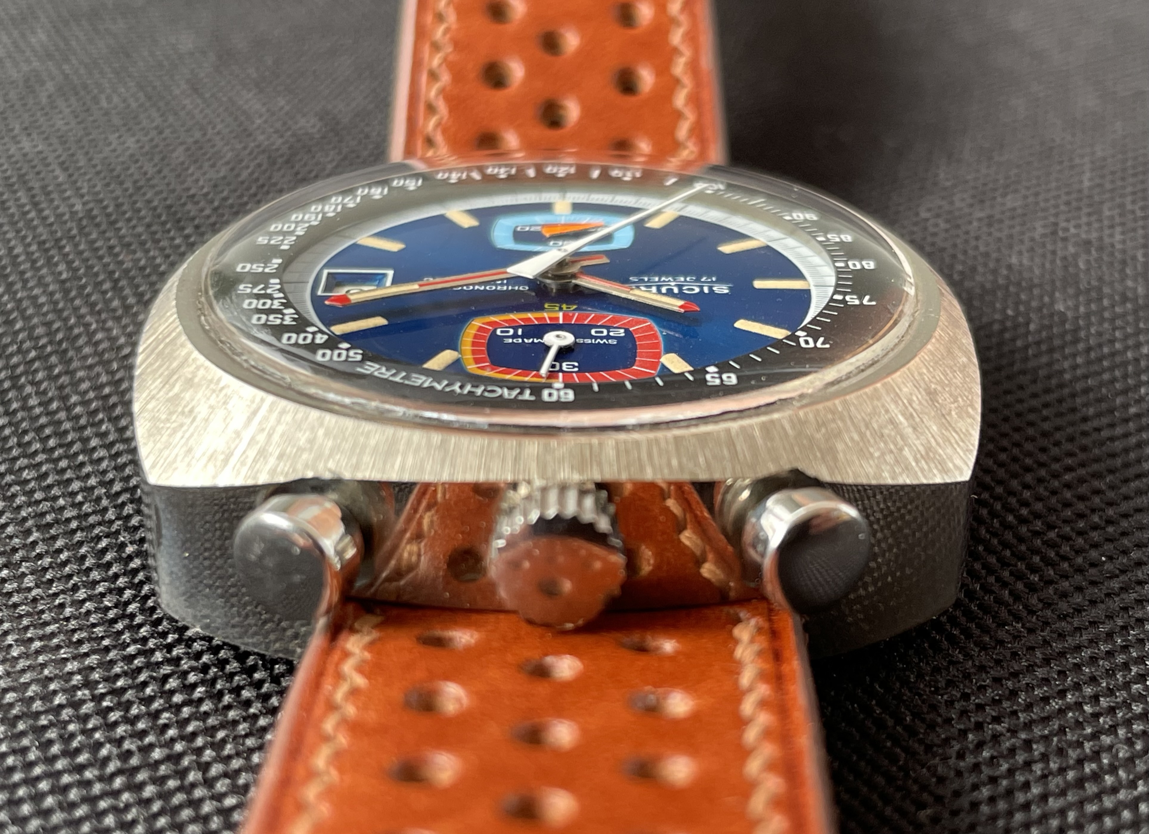 Fabricado en la década de los 70, tiene una caja de 42.8 X 43 mm, y monta un movimento manual Valjoux 7734. De caja asimétrica, la parte superior (pulsadores y la corona), es más ancha y gruesa, mientras que la inferior es más delgada. De esta forma, la esfera queda inclinada hacia las 6 en punto, lo que facilita la lectura de la hora.