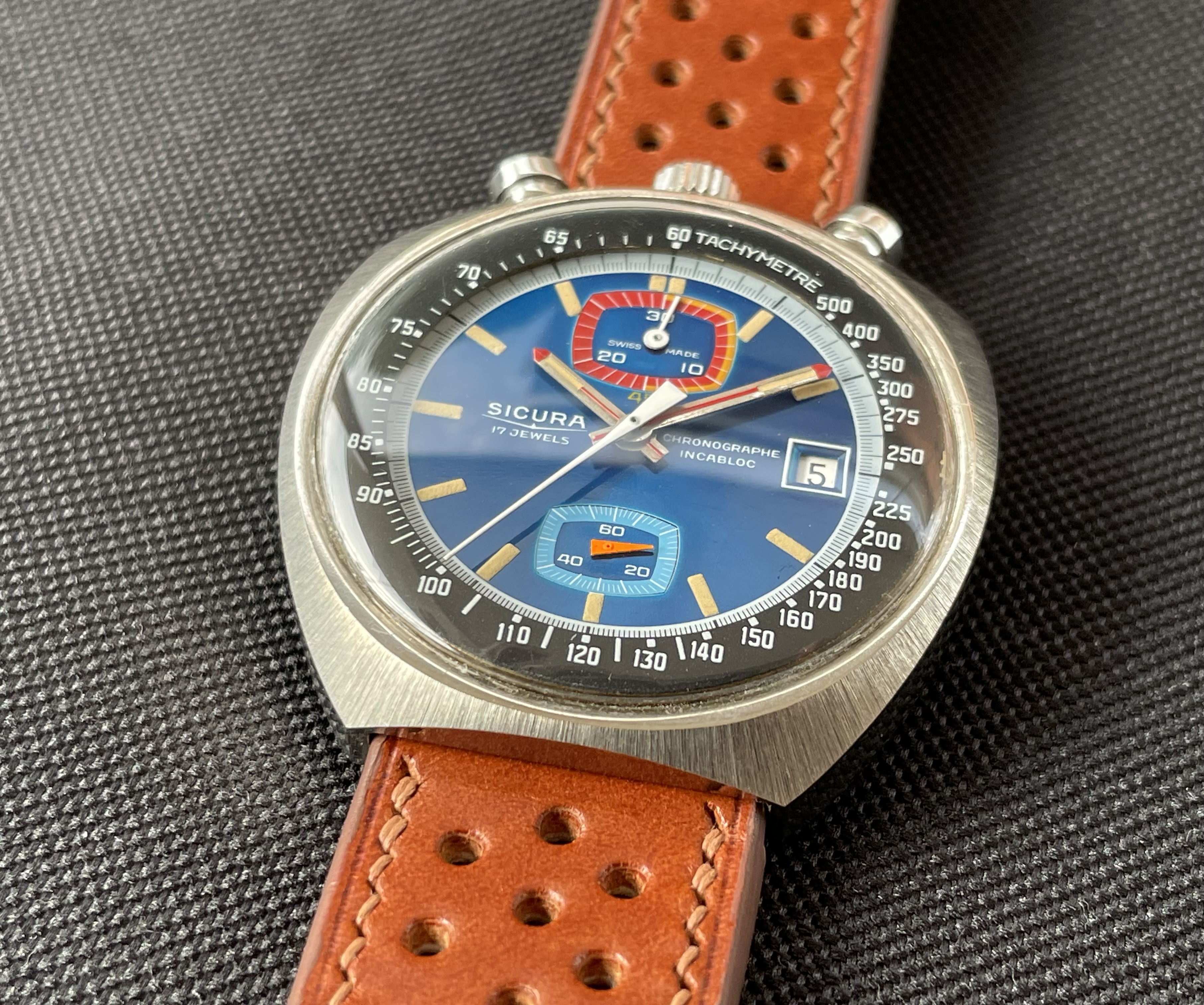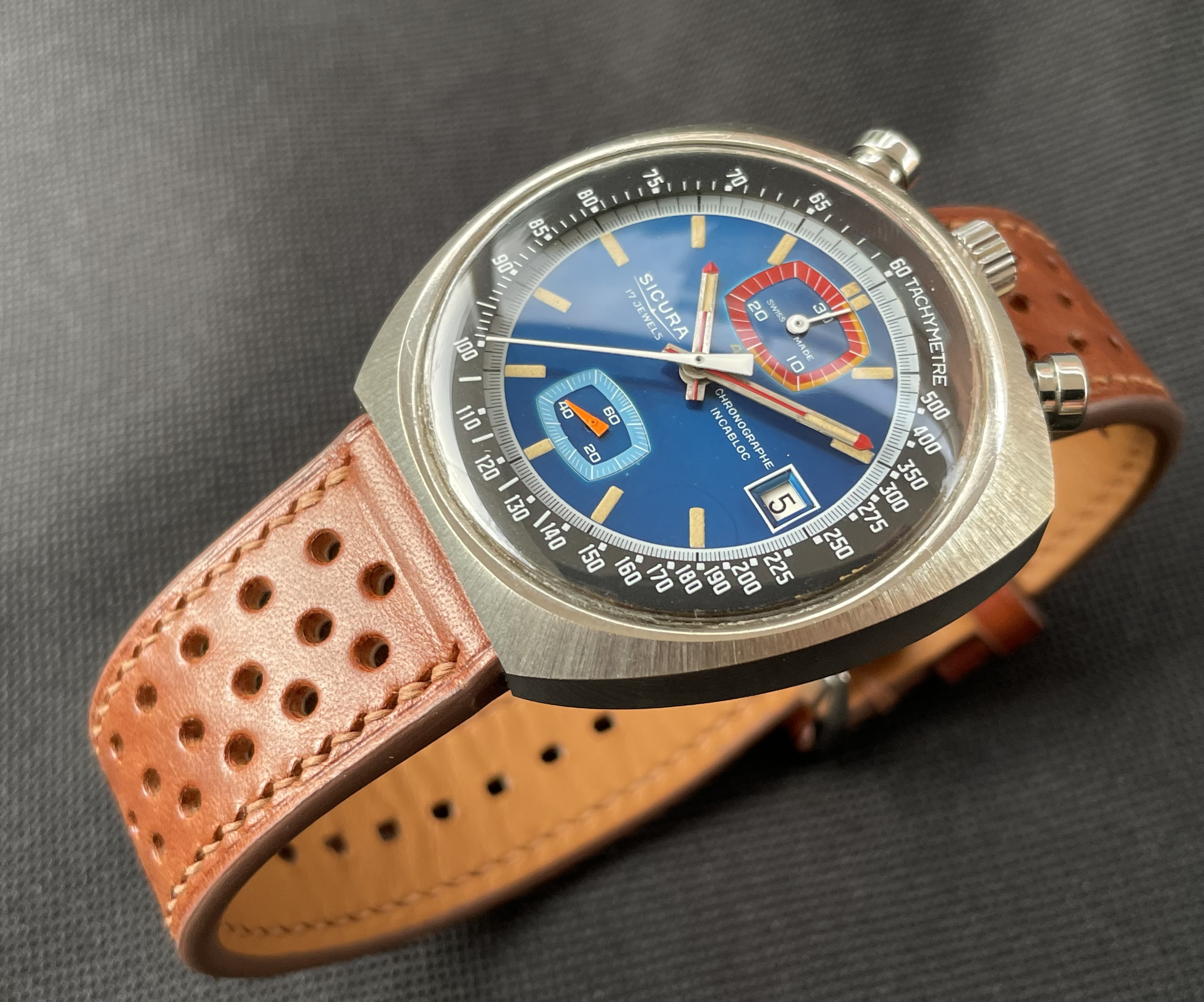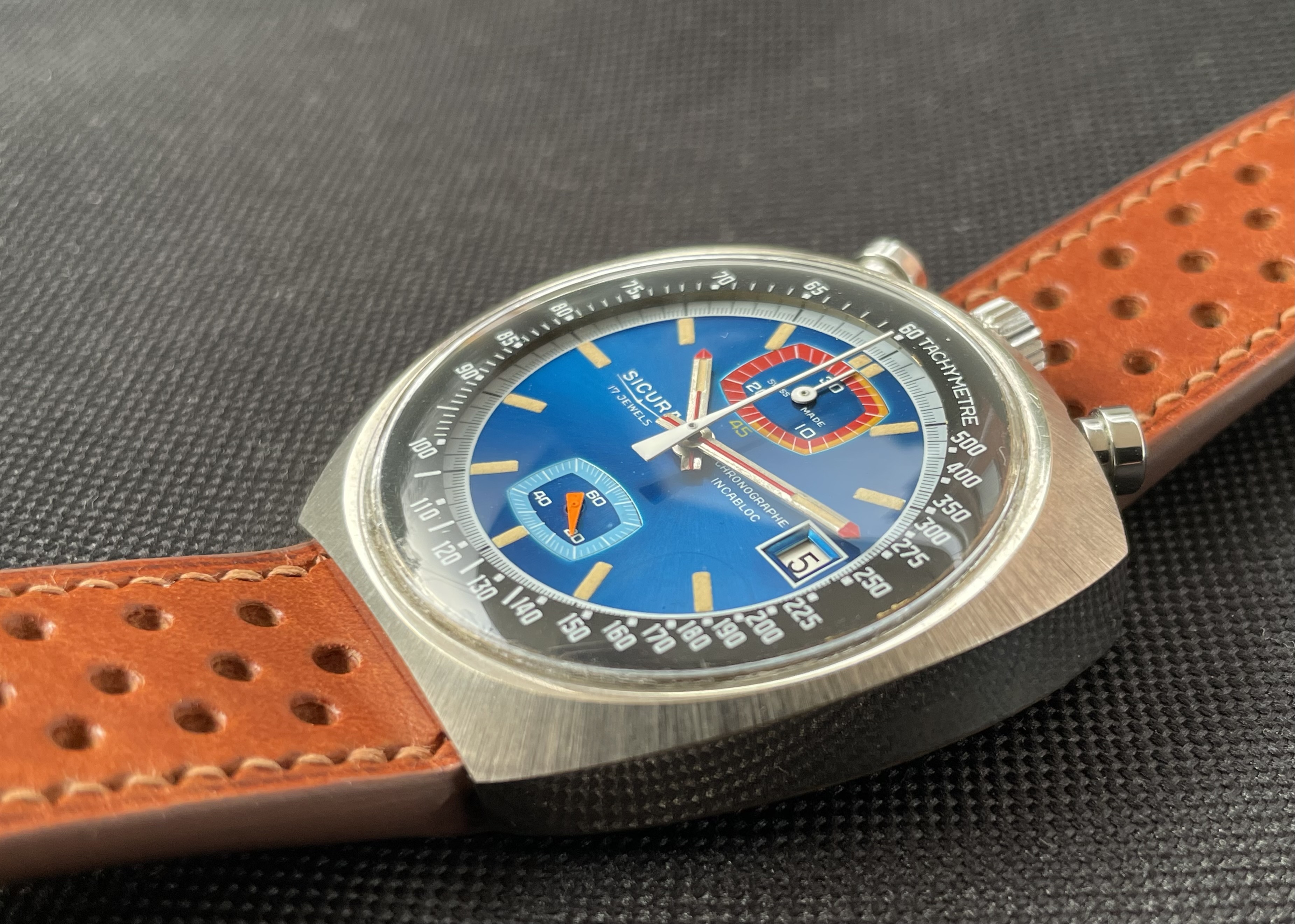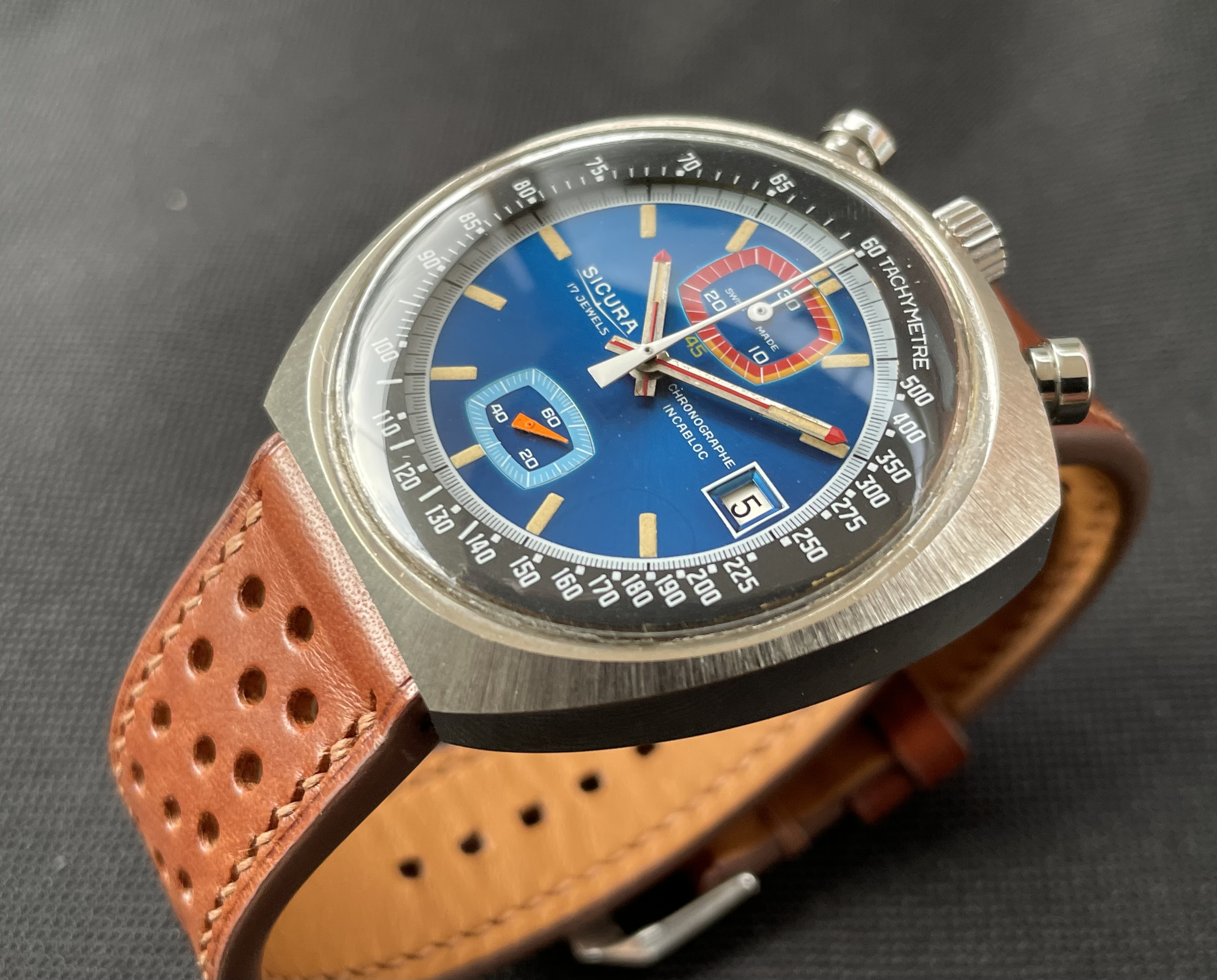 Fabricado en la década de los 70, tiene una caja de 42.8 X 43 mm, y monta un movimento manual Valjoux 7734. De caja asimétrica, la parte superior (pulsadores y la corona), es más ancha y gruesa, mientras que la inferior es más delgada. De esta forma, la esfera queda inclinada hacia las 6 en punto, lo que facilita la lectura de la hora.
