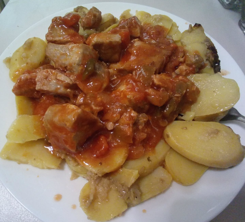 unas patatas asadas y encima le volque una lata de bonito y un mini tetra de tomate. (los guisantes y la cebolla son de guardado del jueves) y puntito de sal y aceite. sin mas
