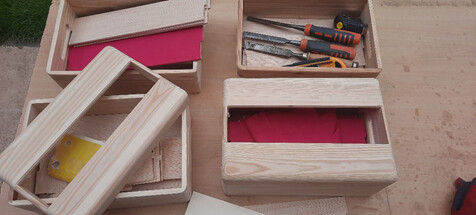 Cortar las tablitas, estajar, vaciar a media madera e ingletar en las esquinas, en algún caso haremos lazos para mayor resistencia.
