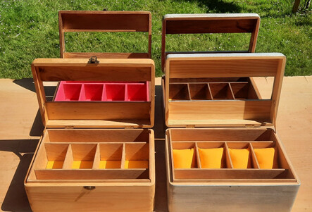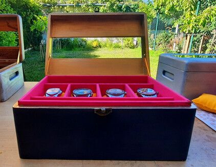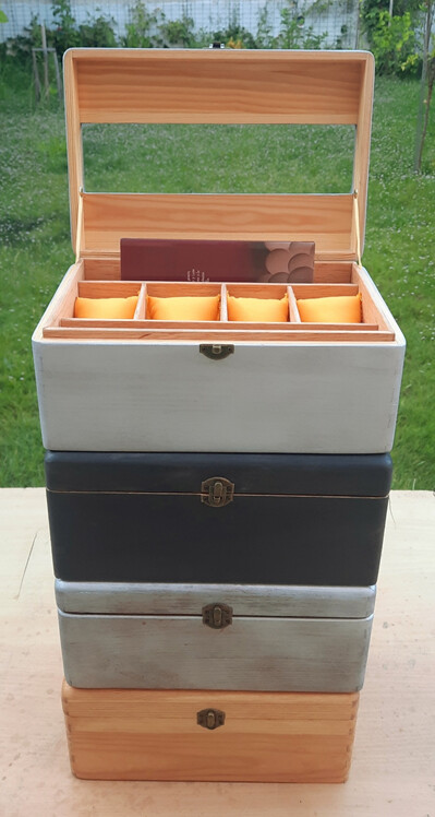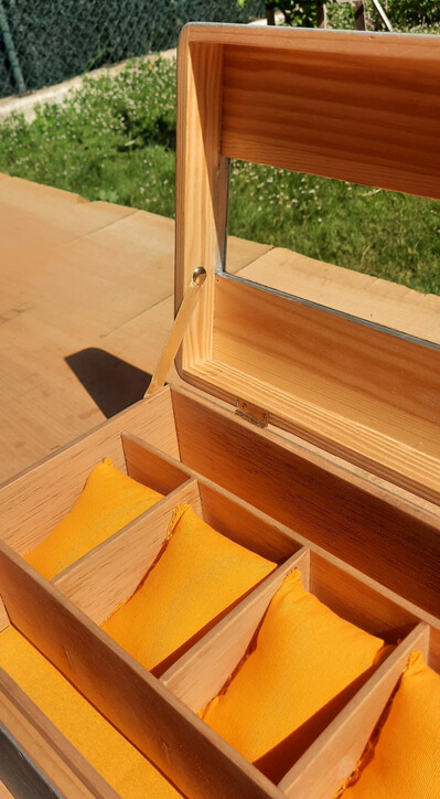 Utilizaré las cajas estandarizadas de pino de cualquier brico, a las que le he hecho una tapa ventilada para poner un cristal antirreflejos y así poder apreciar en interior sin que le entre polvo a los relojes e incluso para aquellos relojes tipo eco o carga por luz, puedan estar siempre cargados.