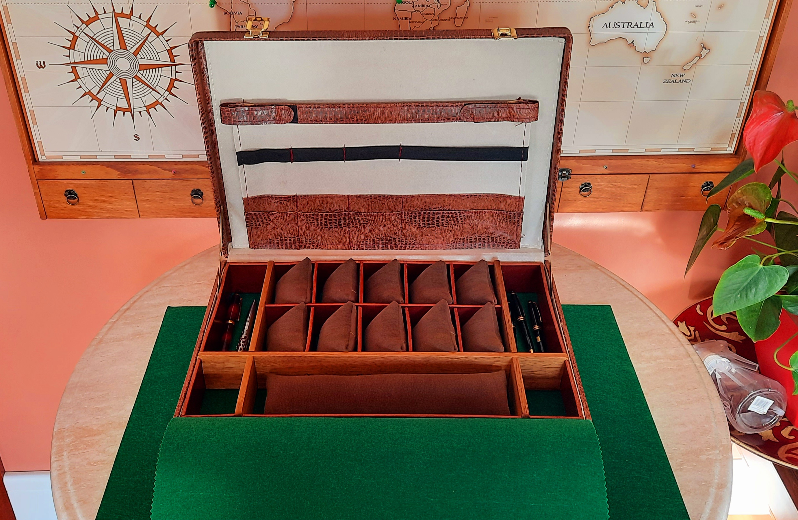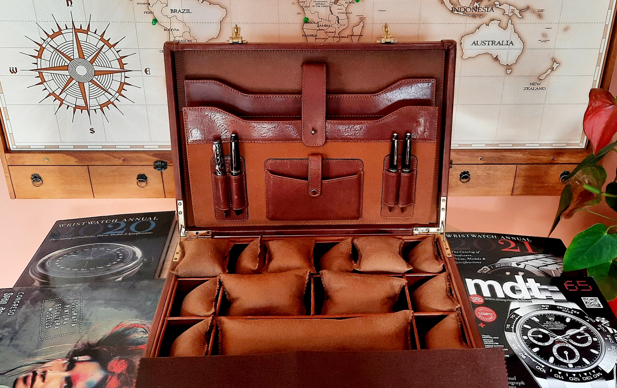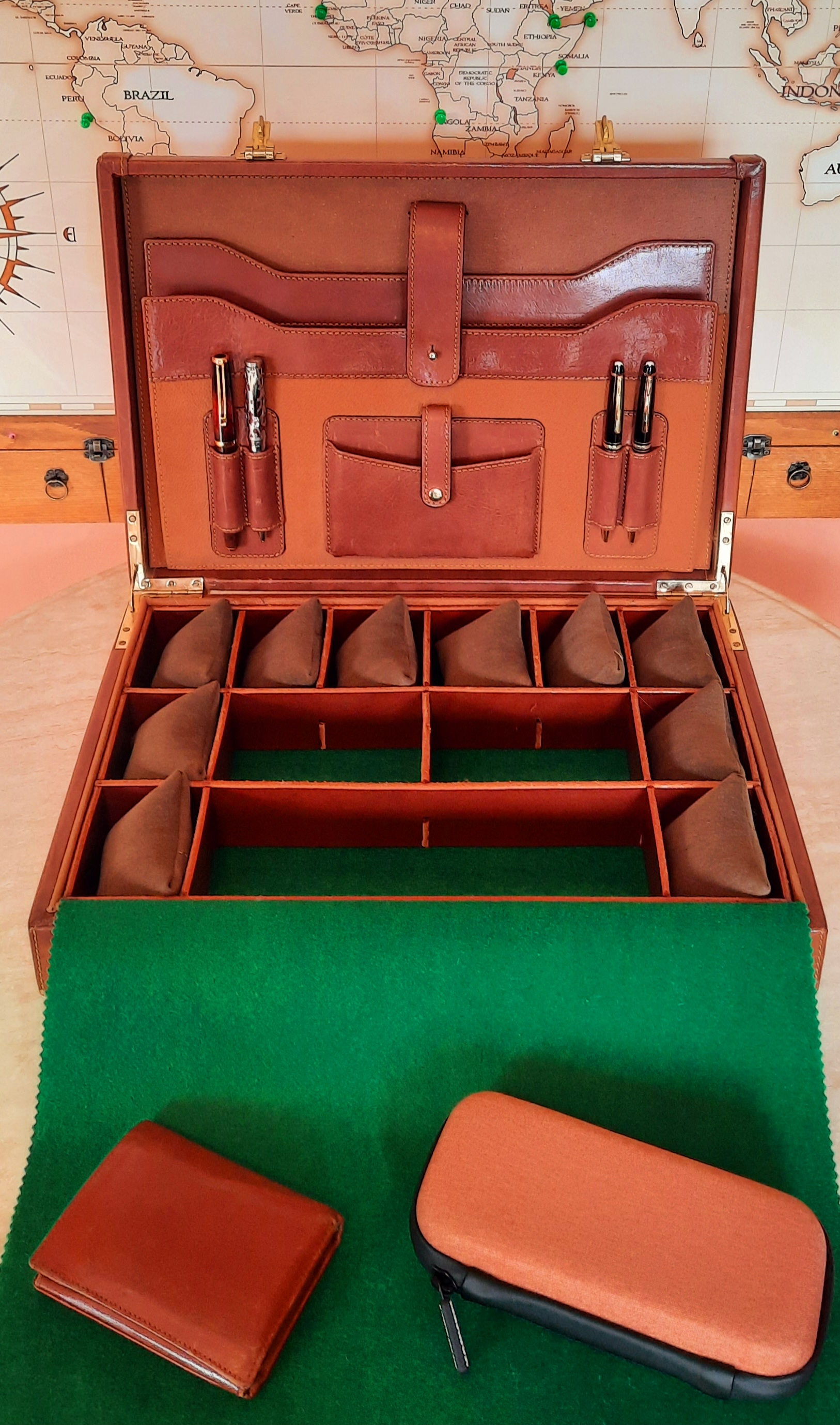 Opción 6: cuero genuino y almohadillas piel tela, de 14 a 20 relojes, más espacios y portadocumentos. Cerradura con con código.