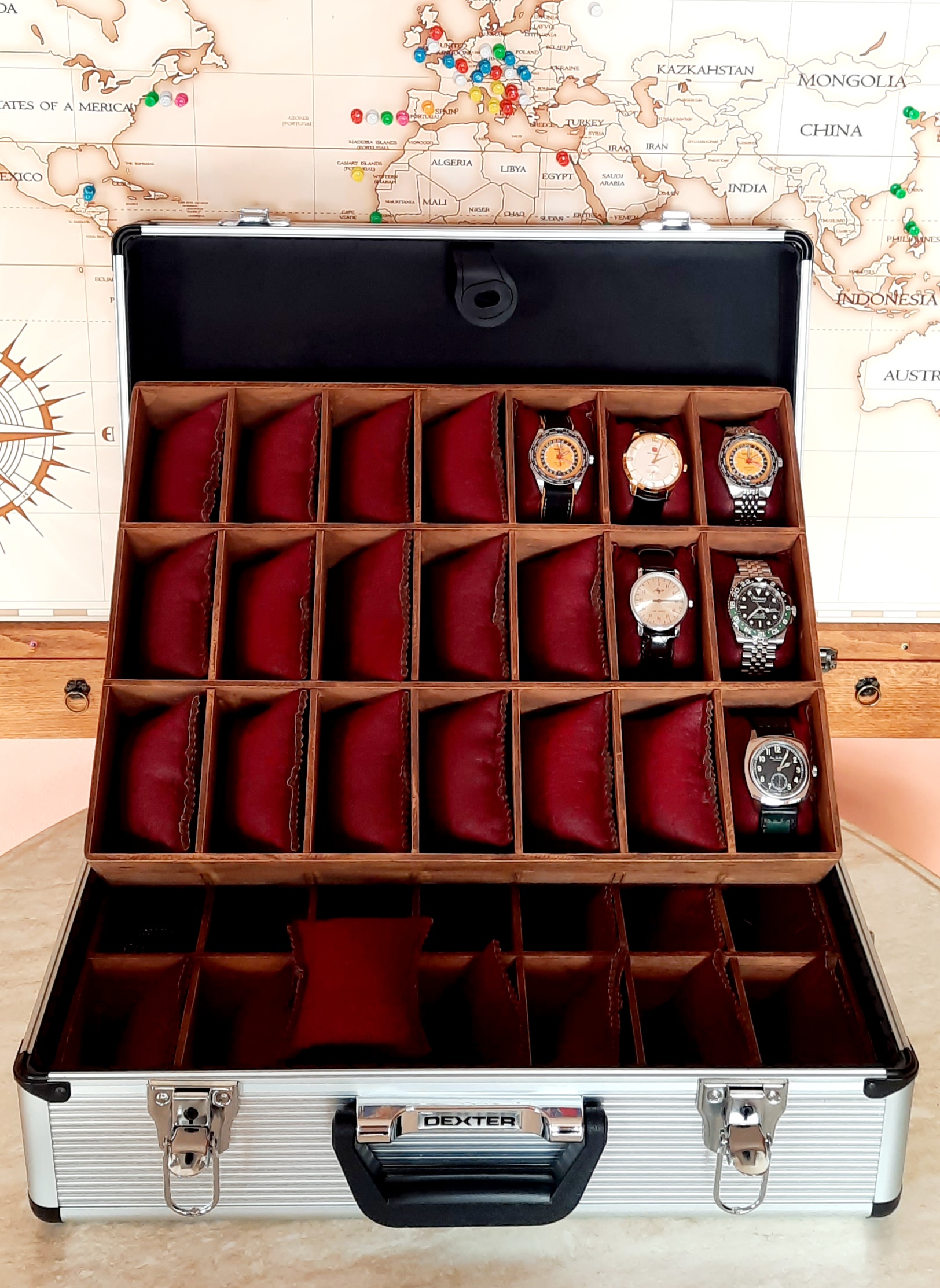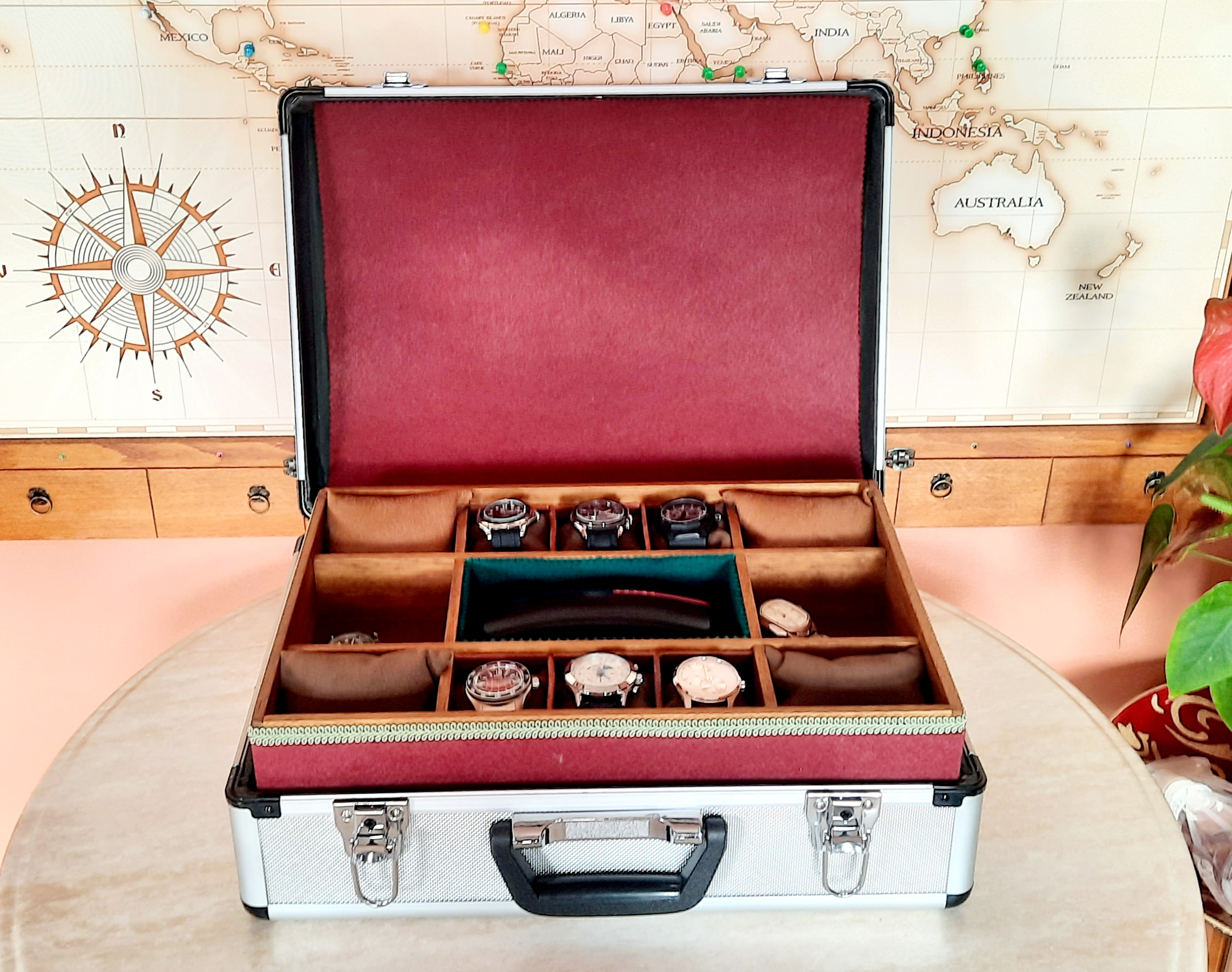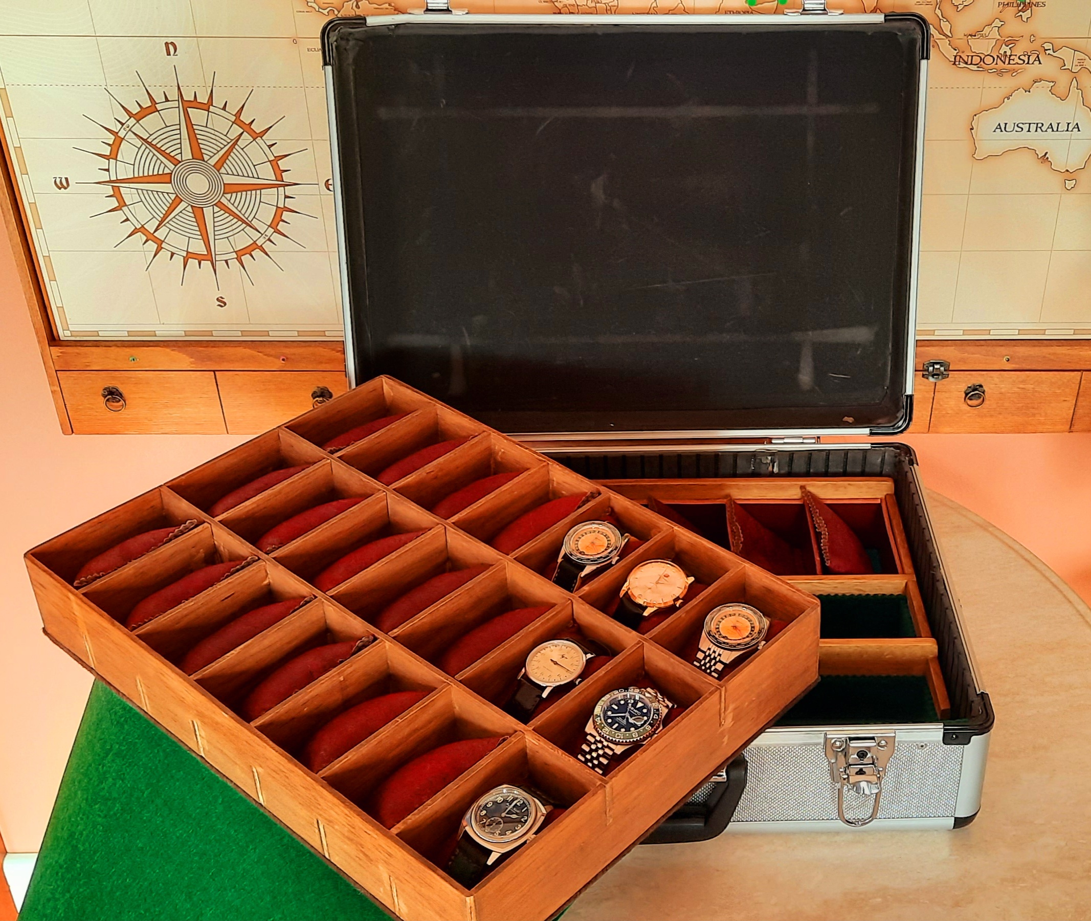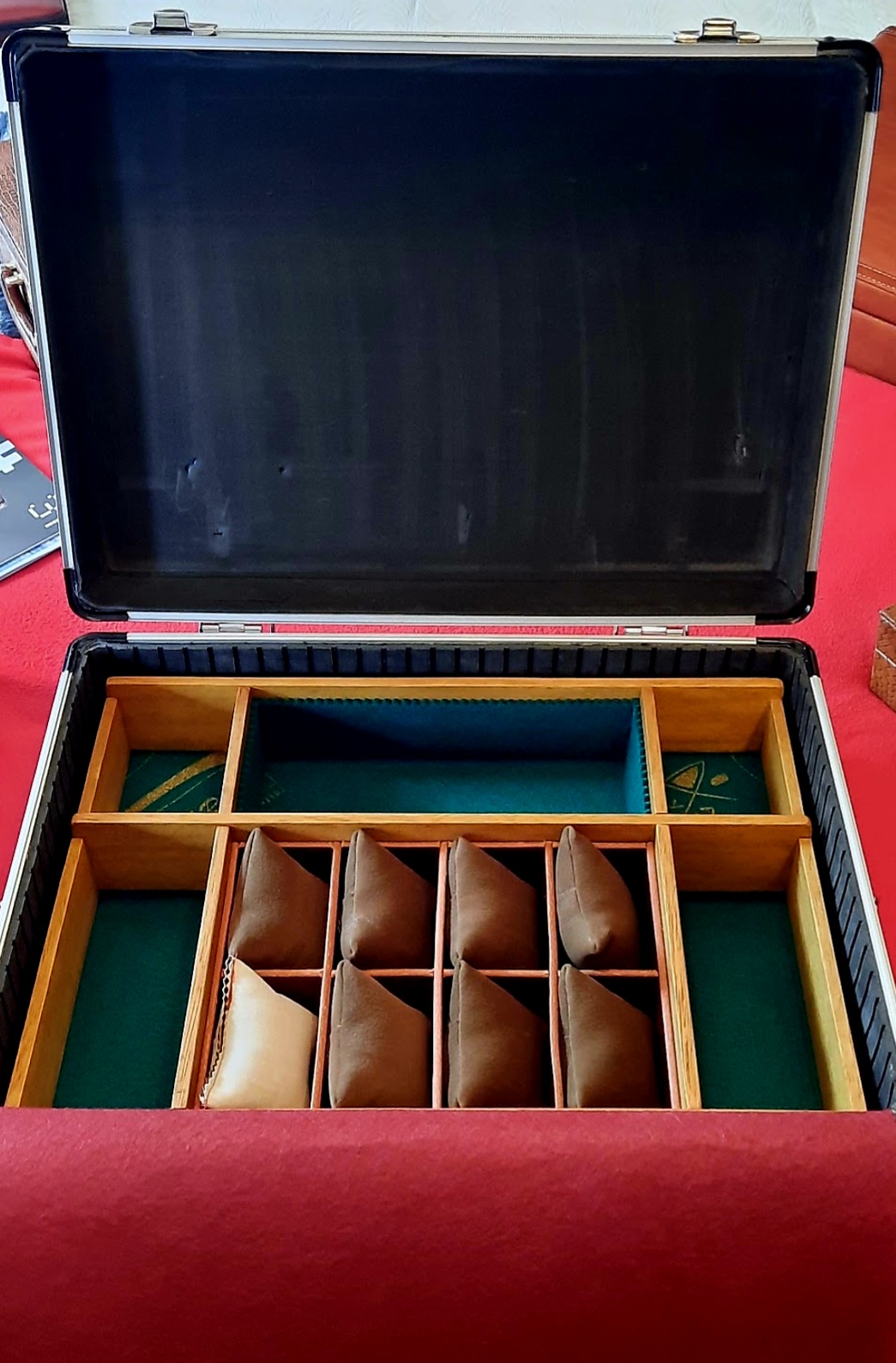 Opción 3: Maletín aluminio un piso todo relojes (21 unidades) otro piso relojes (8 a 12) y espacio para objetos.