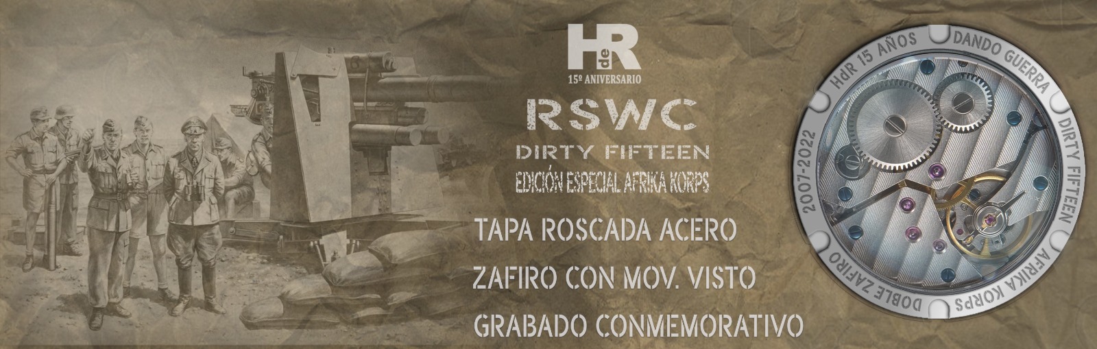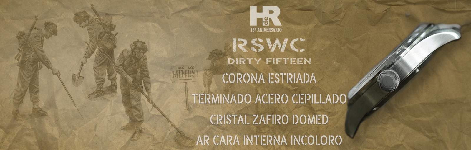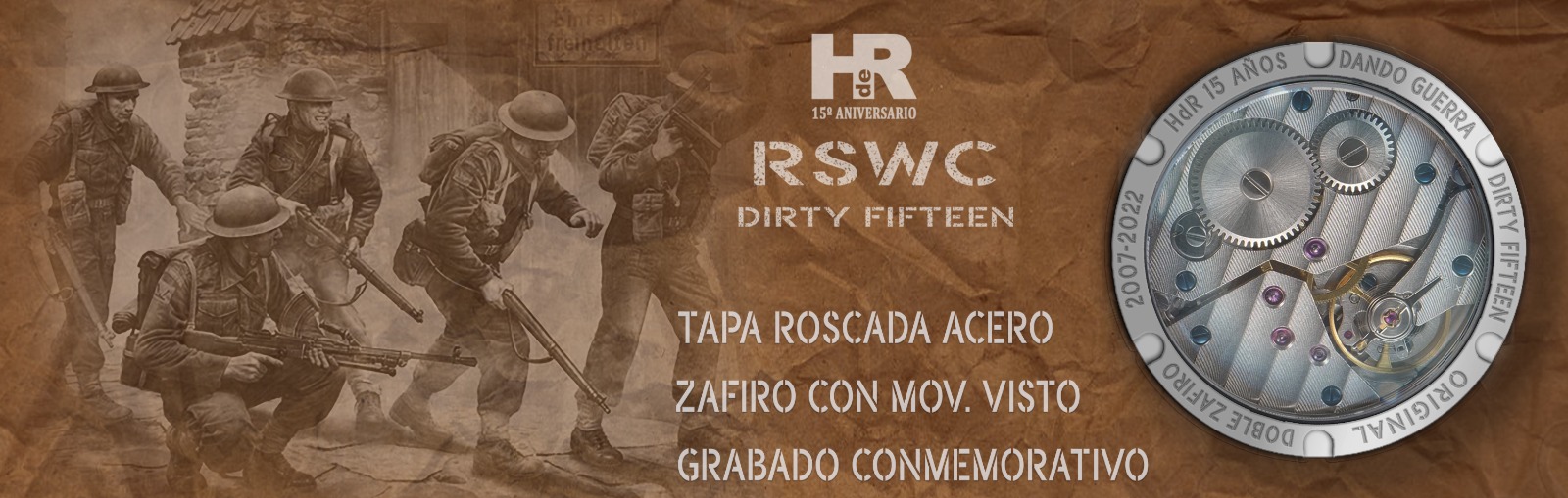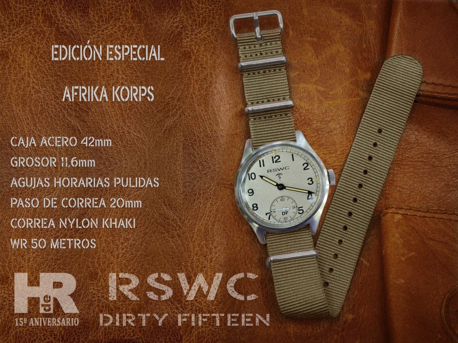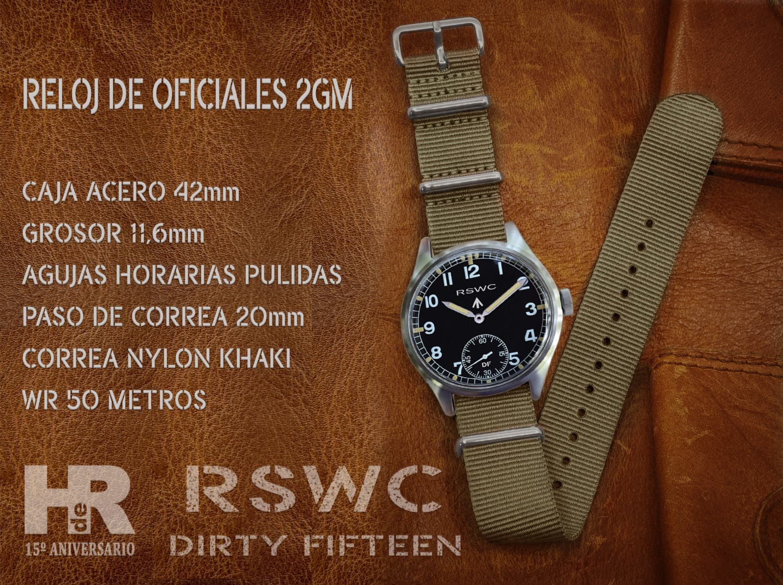 Nuestro RSWC DF, Dirty Fifteen Original, cumple con todas las exigencias del reloj de oficiales para el ejército británico. Es resistente al agua, anti choque, anti magnético, el cristal es irrayable y el movimiento tiene una precisión, reserva de marcha y durabilidad ya legendarias. Por si esto fuera poco, monta una tapa trasera de cristal de zafiro a través de la que podremos admirar la belleza del movimiento. De estos relojes verán la luz 100 unidades solamente.