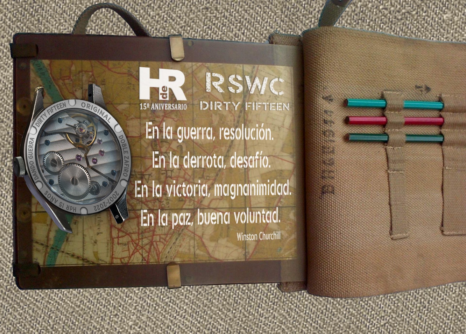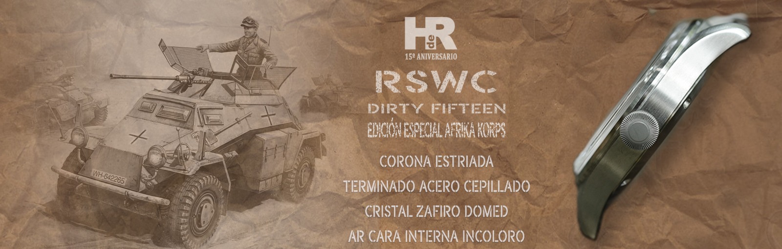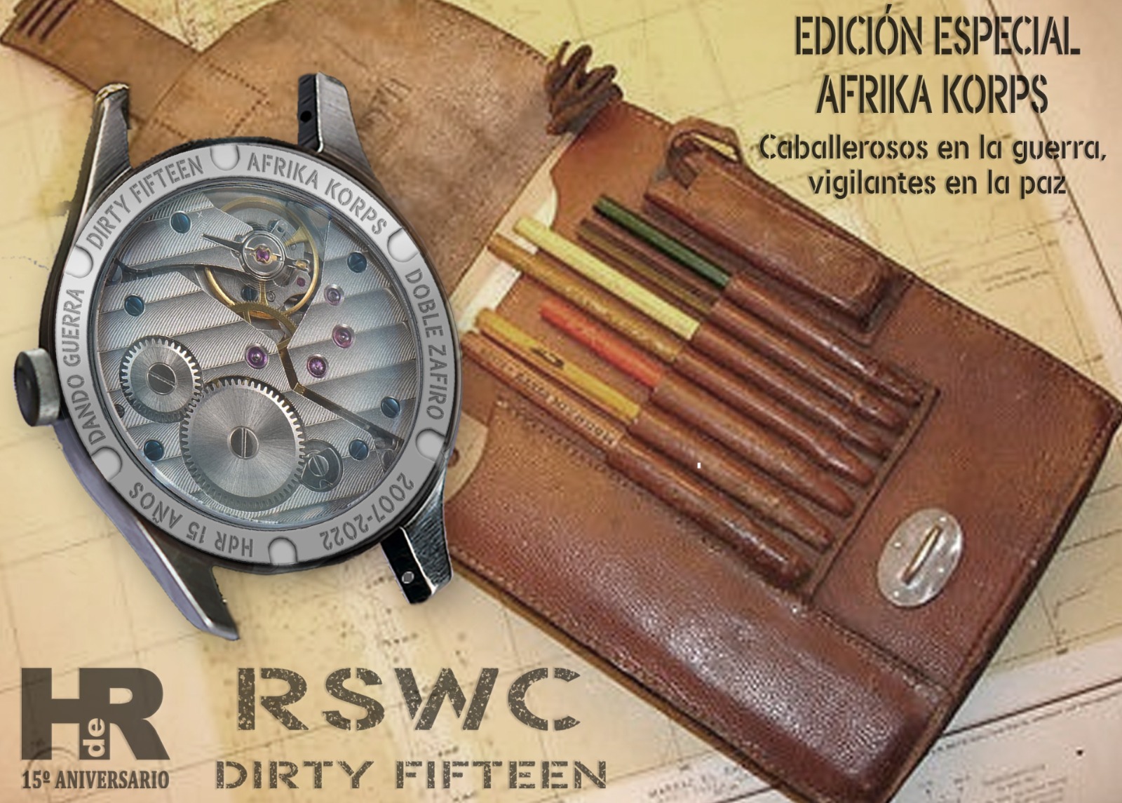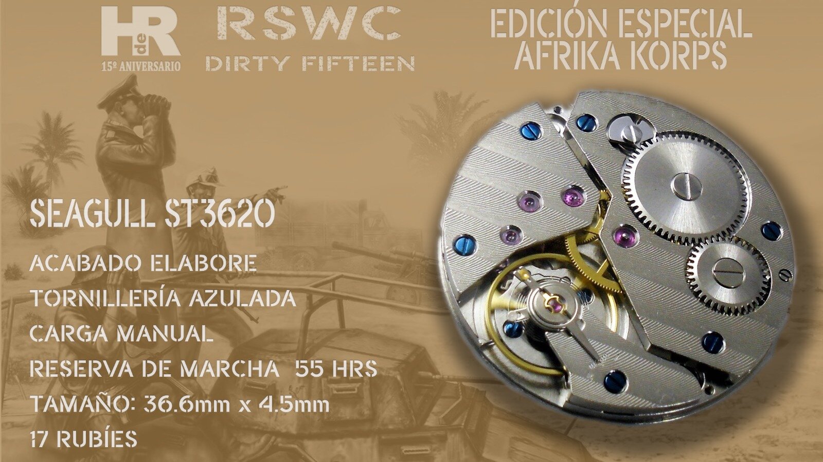 Nuestro RSWC DF, Dirty Fifteen Original, cumple con todas las exigencias del reloj de oficiales para el ejército británico. Es resistente al agua, anti choque, anti magnético, el cristal es irrayable y el movimiento tiene una precisión, reserva de marcha y durabilidad ya legendarias. Por si esto fuera poco, monta una tapa trasera de cristal de zafiro a través de la que podremos admirar la belleza del movimiento. De estos relojes verán la luz 100 unidades solamente.