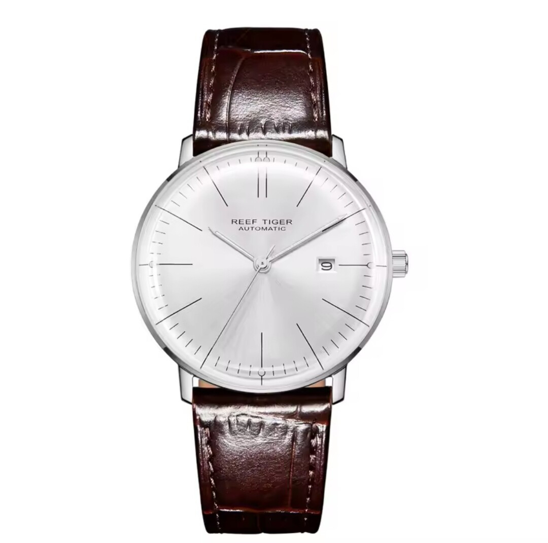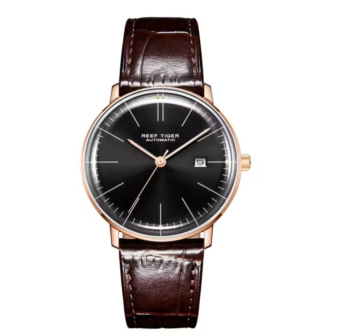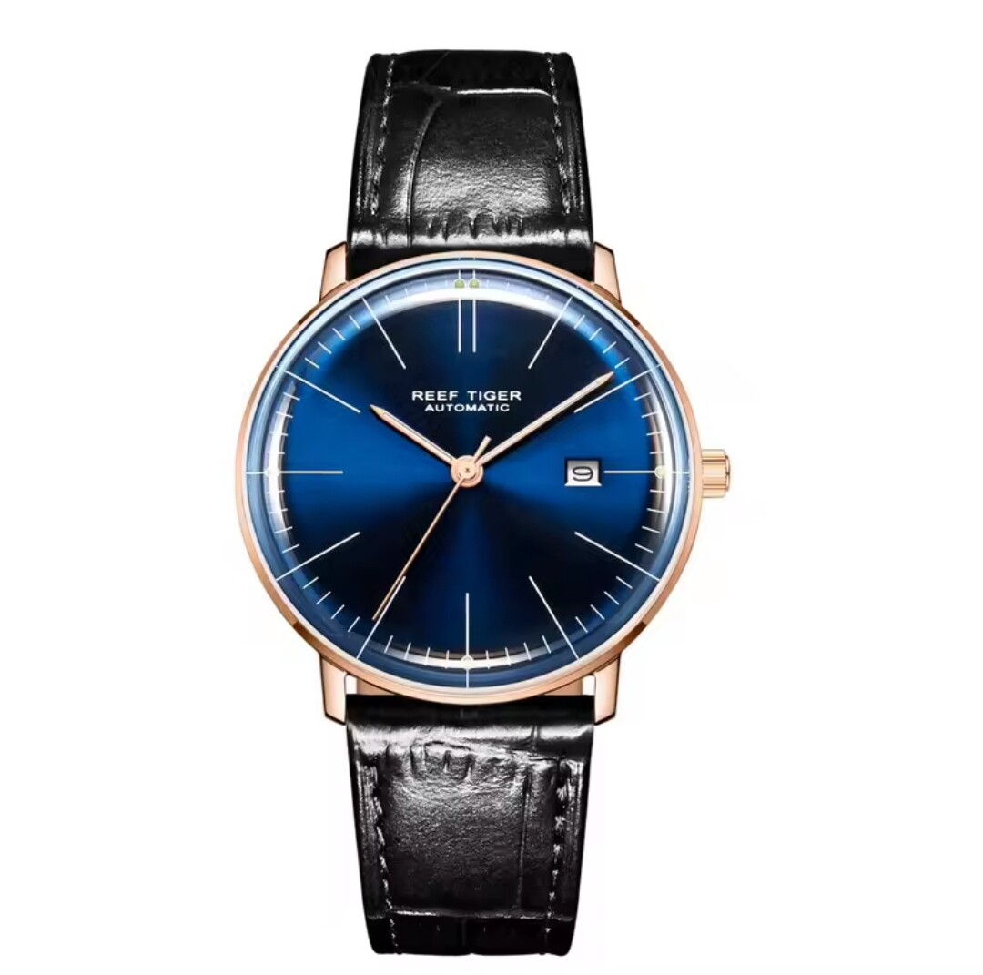 440,39€ | Reef Tiger/RT-reloj de lujo para hombre, pulsera ultrafina de acero con correa de cuero, automática, resistente al agua, RGA8215