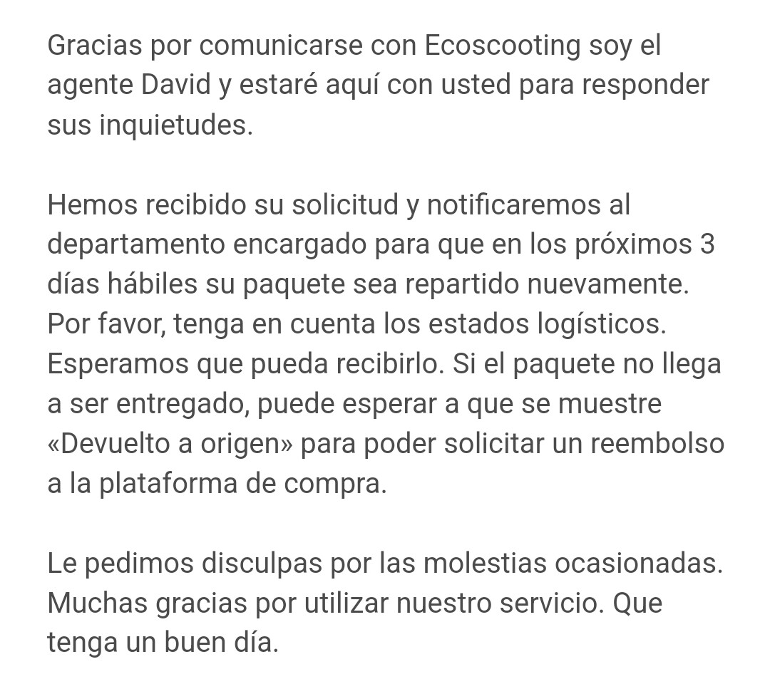 Esta vez estan pasando ya demasiados dias desde que está en la empresa local de reparto, y siguen sin traerlos…ayer me puse en contacto con EcoScooting pidiendo explicaciones, y hoy me han contestado esto…