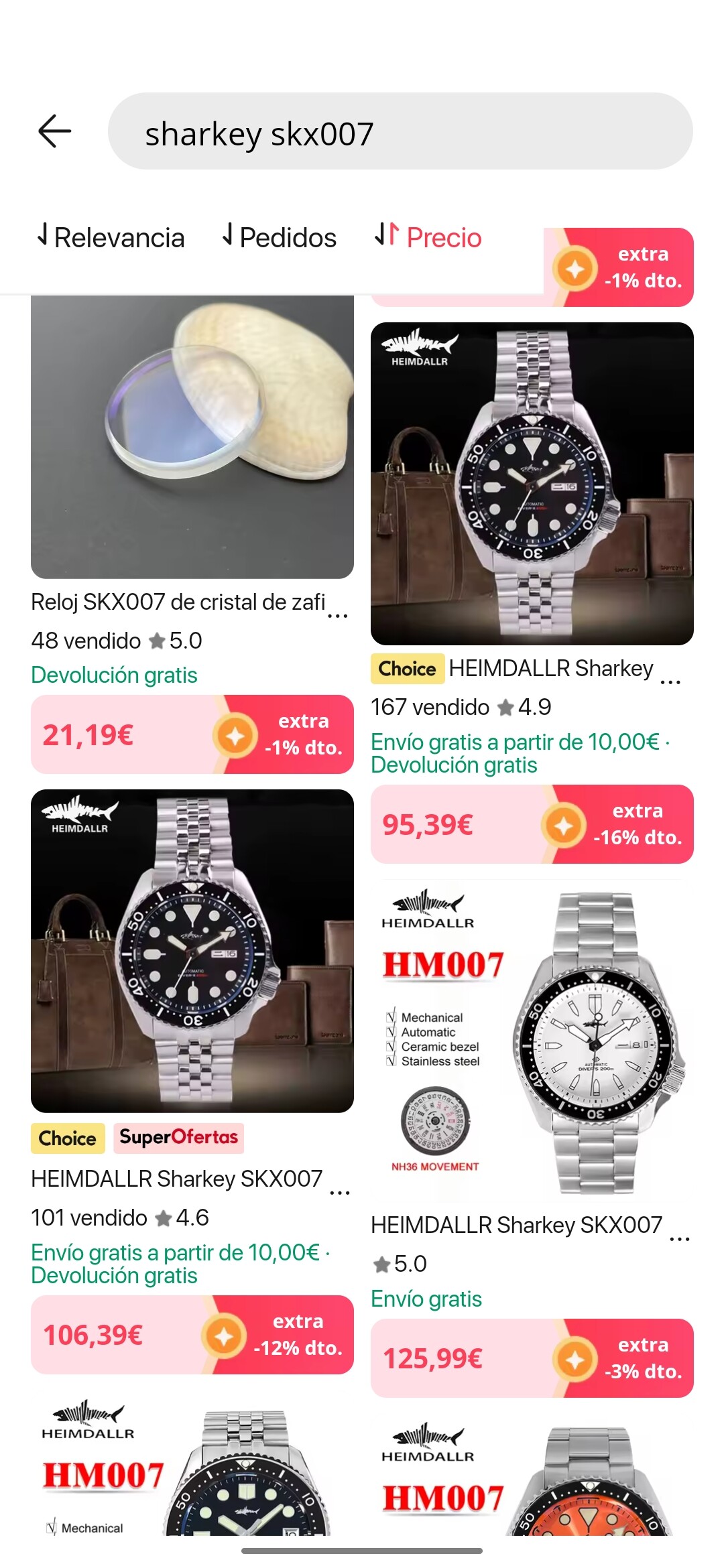 He encontrado esto en AliExpress: 190,46€ | HEIMDALLR Sharkey SKX007 reloj de buceo Vintage relojes mecánicos para hombres 200M cristal de zafiro luminoso NH36 reloj de movimiento automático