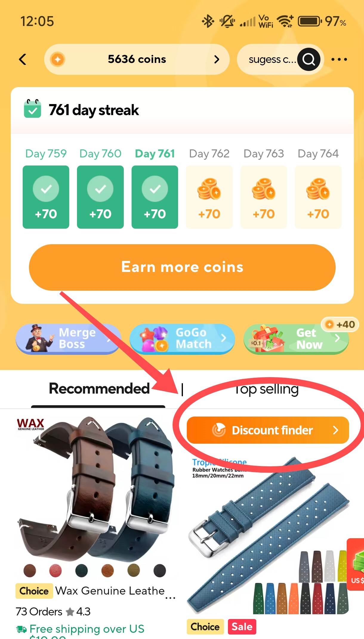 It’s easier to first view the watch you want to buy. Then go to the coins section and click on Discount finder. There you will directly see all the items you currently viewed in chronological order (if a coin rebate applies).