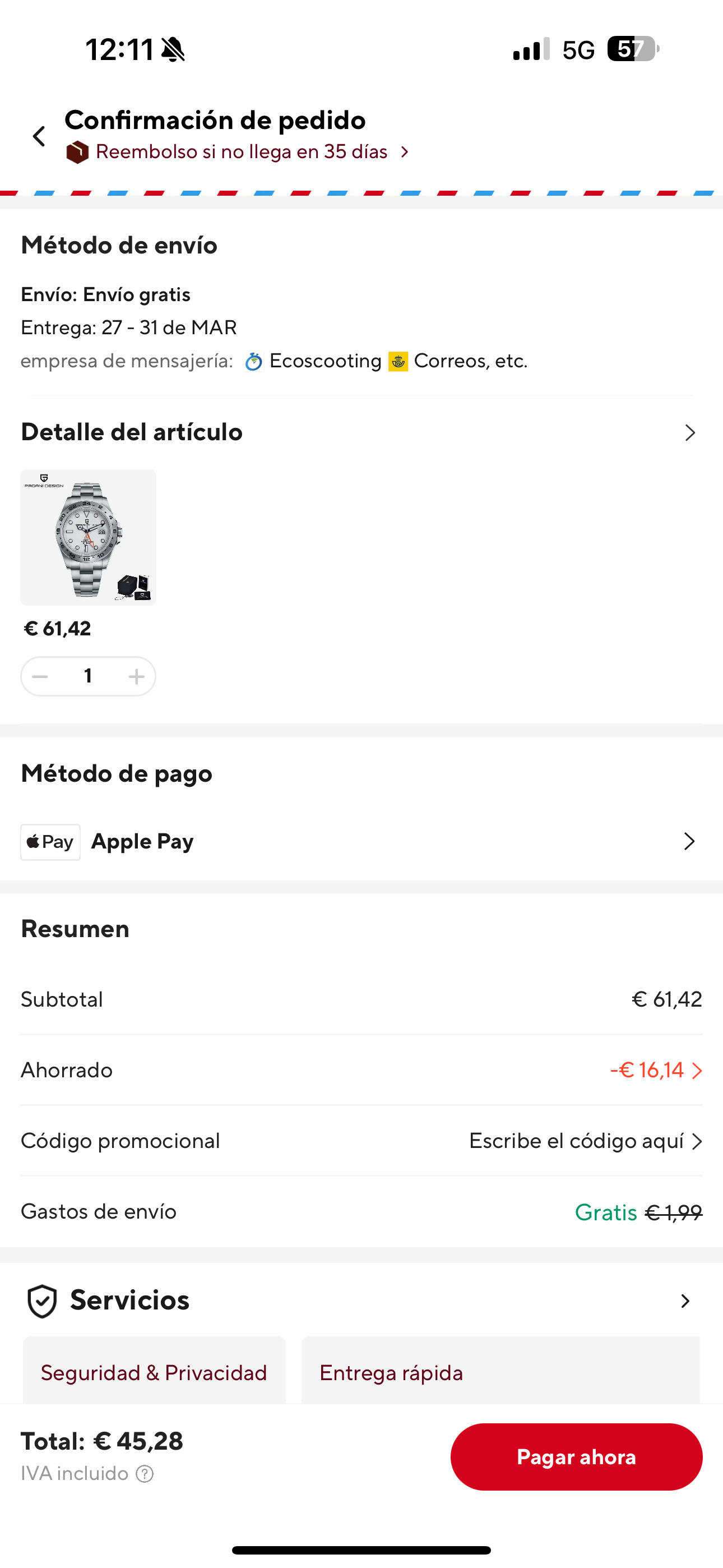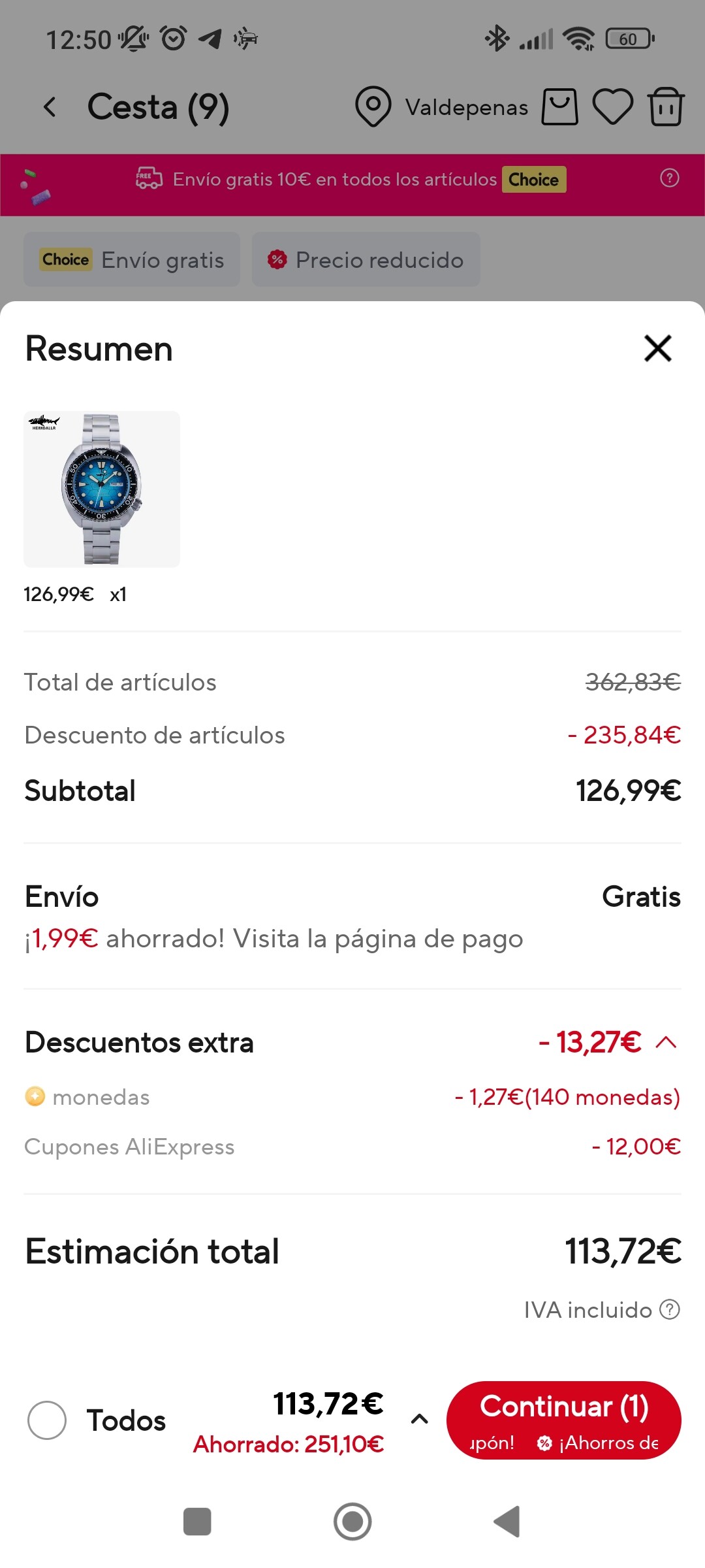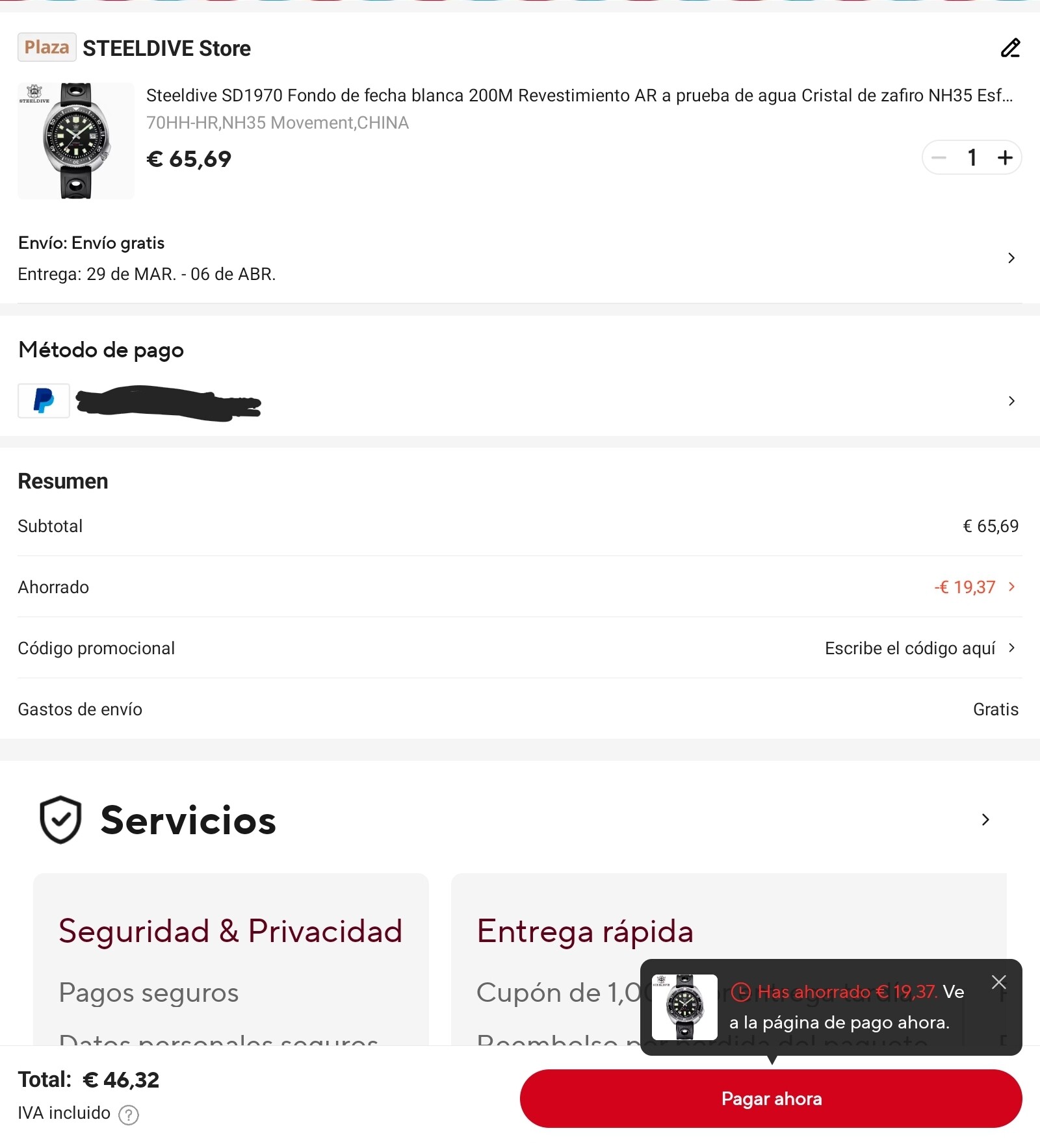 Me doy por vencido ya con esto de las monedas. He hecho un simulacro de compra a través de lo de las monedas de un reloj que segura un 16% descuento en monedas… Y este es el resultado