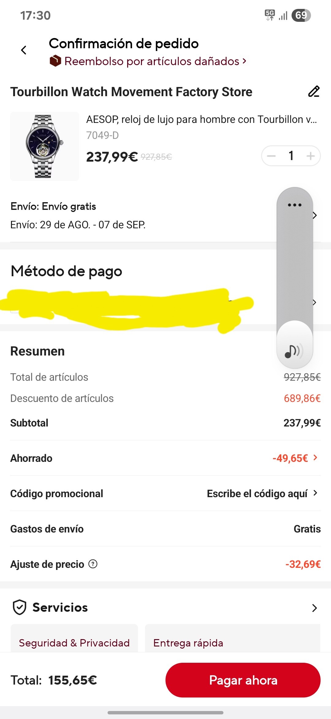 En el móvil sale lo de ajuste de precio, o sea el IVA, que sumado sale un total de 188,34 euros ( aranceles seguros)