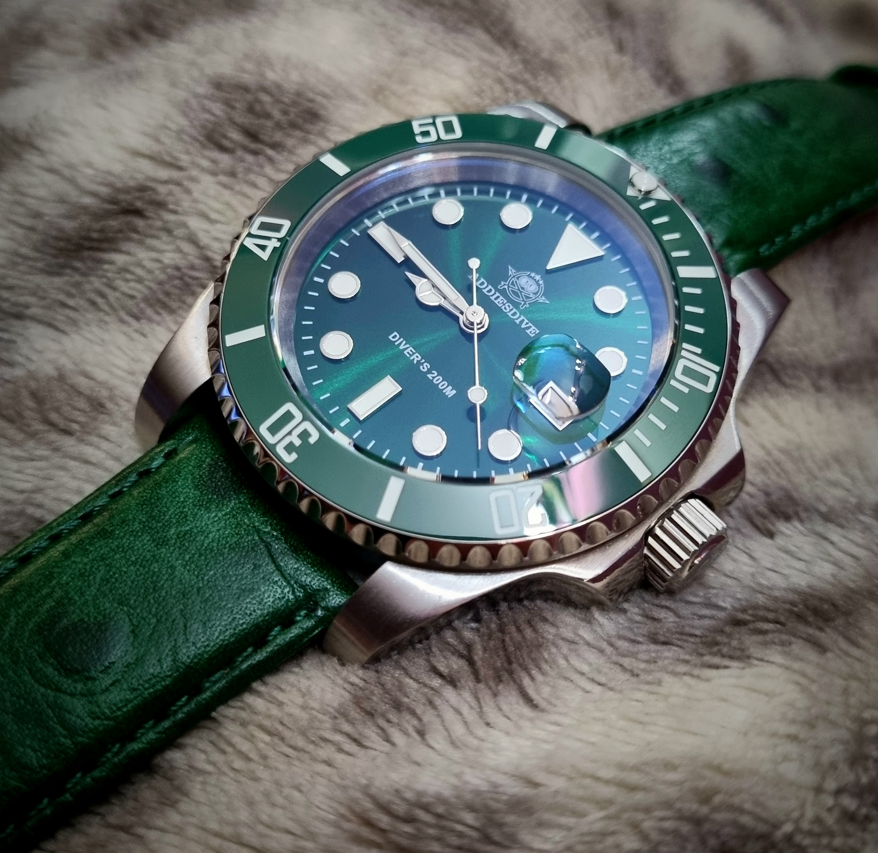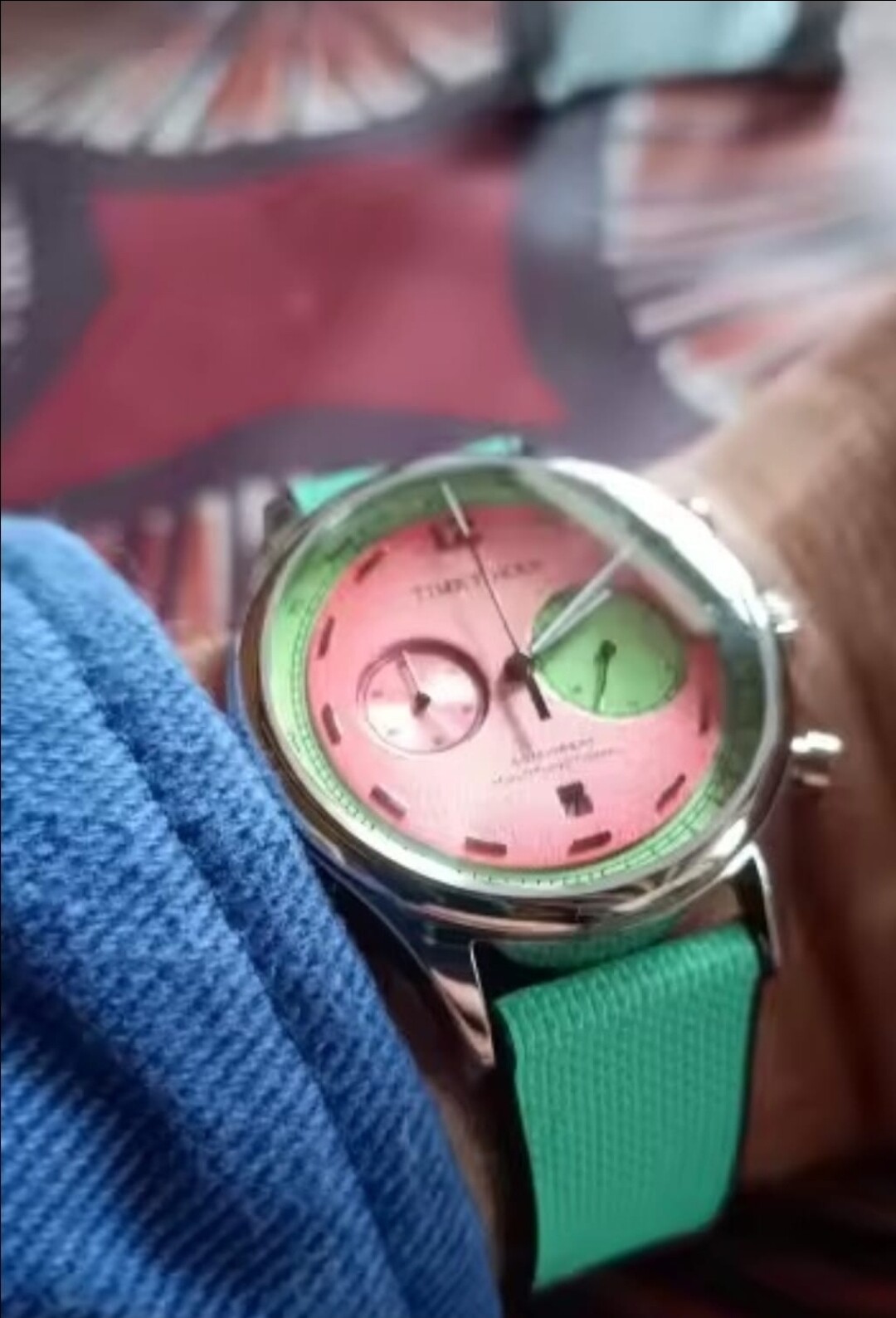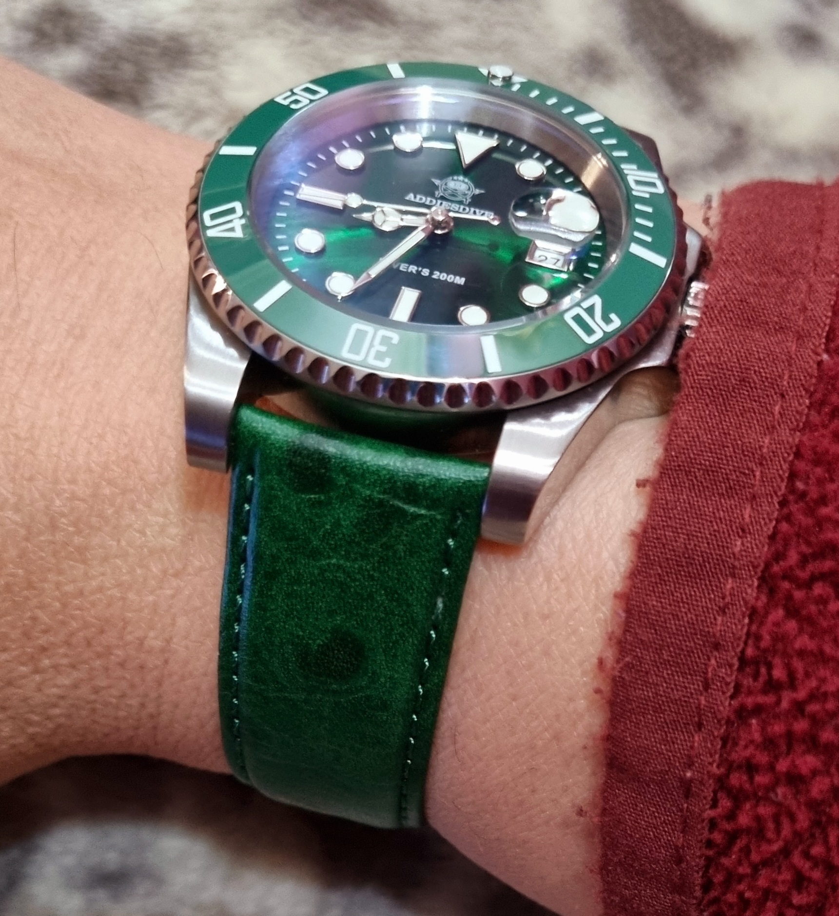 La correa es verde bastante parecida al verde del dial…fijate en la ultima foto que he puesto.