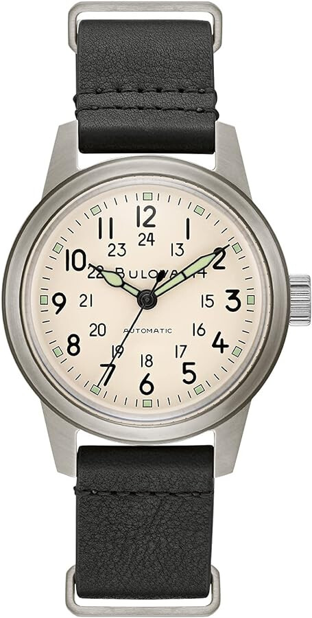 Oferta por tiempo limitado: Bulova Militar Heritage Hack - Reloj automático de 3 manecillas de acero inoxidable para hombre, correa de cuero OTAN, manecillas luminosas y marcadores Amazon.com