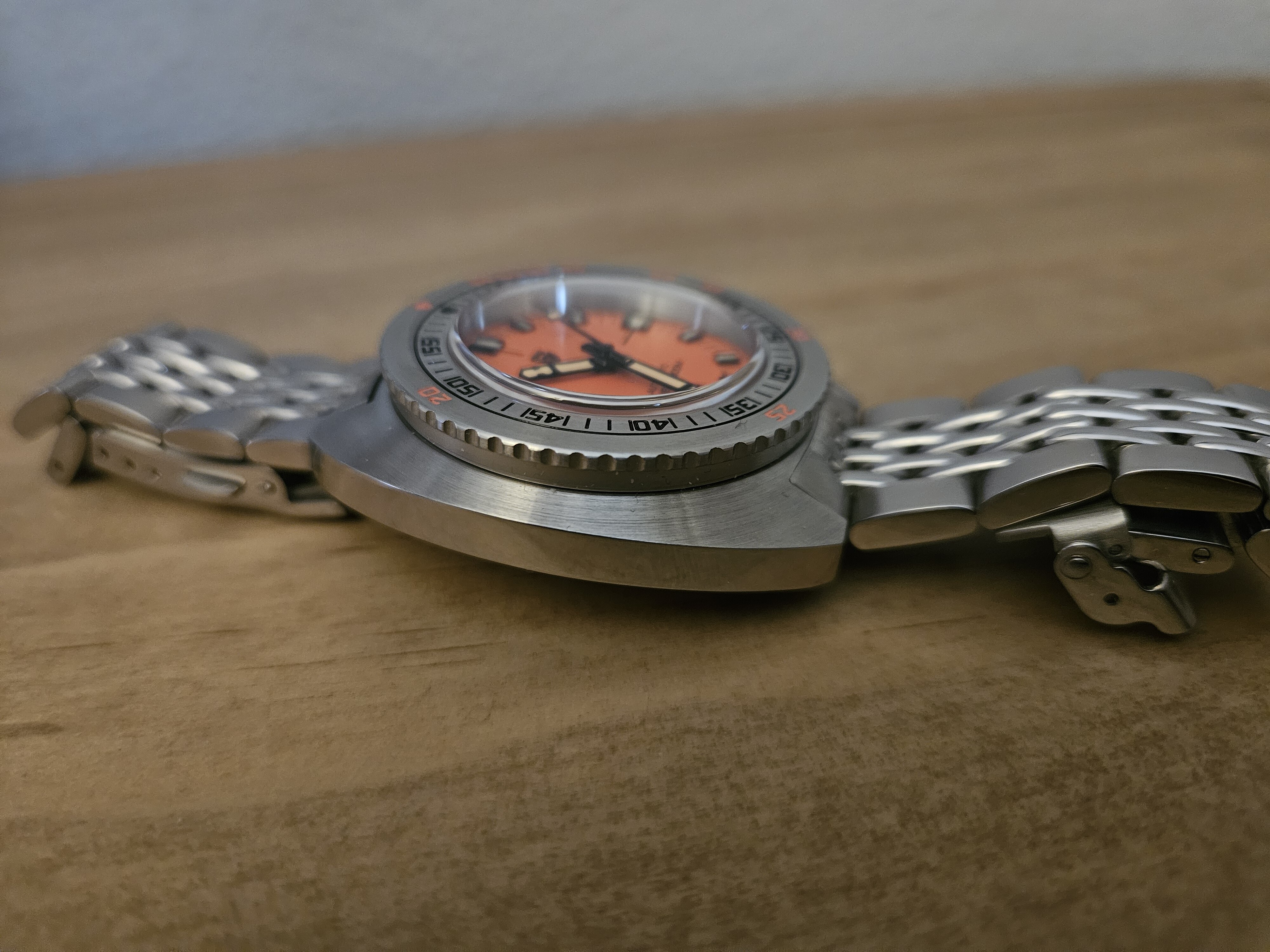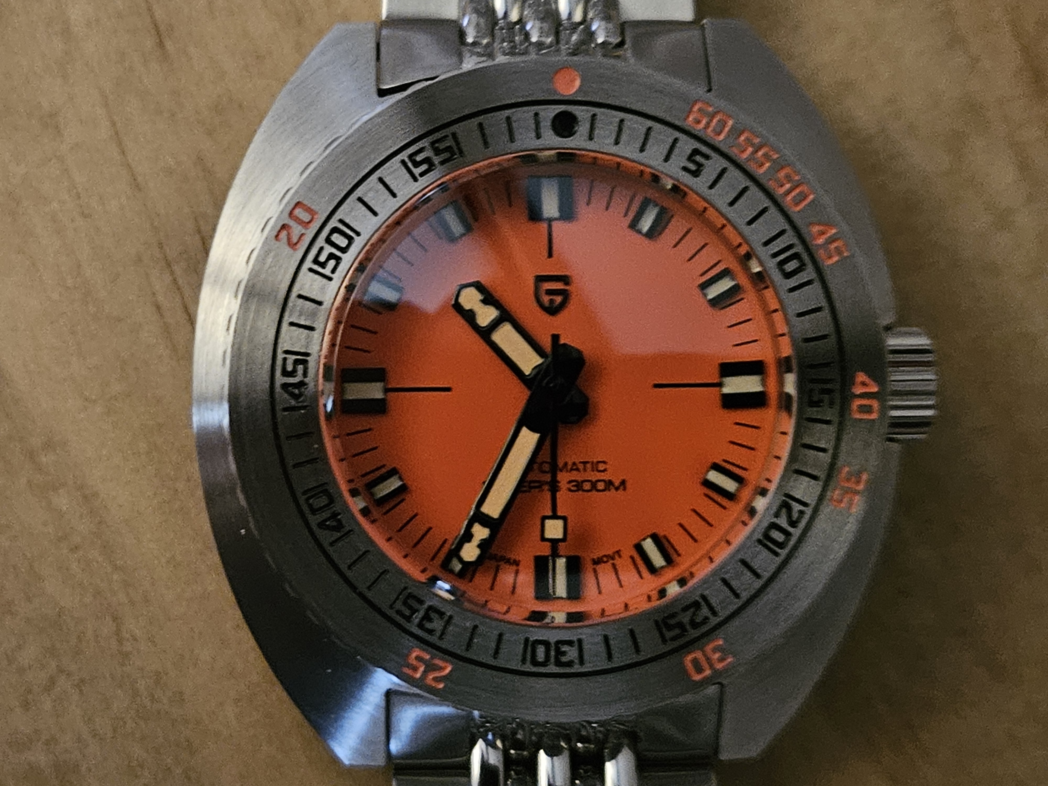 El dial también me gusta mucho: ya tuve en su momento un Monster naranja y tenía muchas ganas de volver a tener un reloj con un dial así. Es más ponible de lo que parece, sobre todo cuando llega el calorcito. El logo de Pagani es muy discreto y no tiene fechador como el original, detalle que hasta me gusta más así. El cristal es zafiro ligeramente abombado que le da.un toquecito vintage.