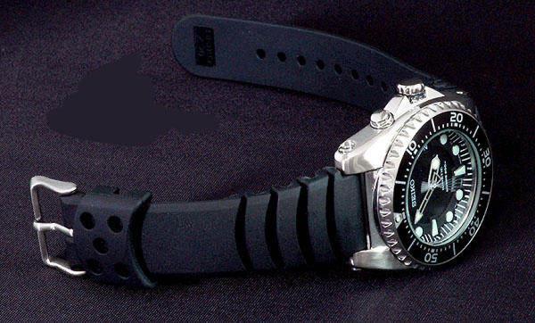 De momento, viendo lo que tengo en casa ahora mismo, probaré con una correa original de Seiko que tengo por ahí para un Kinetic (que, ese sí, habitualmente uso con armis). La calidad es excelente y, si le va bien, puede ser una muy buena opción (aunque estéticamente le dé un toque excesivamente refinado; no sé; tendré que verlo con ella puesta). Es como ésta (fotos sacadas de internet):