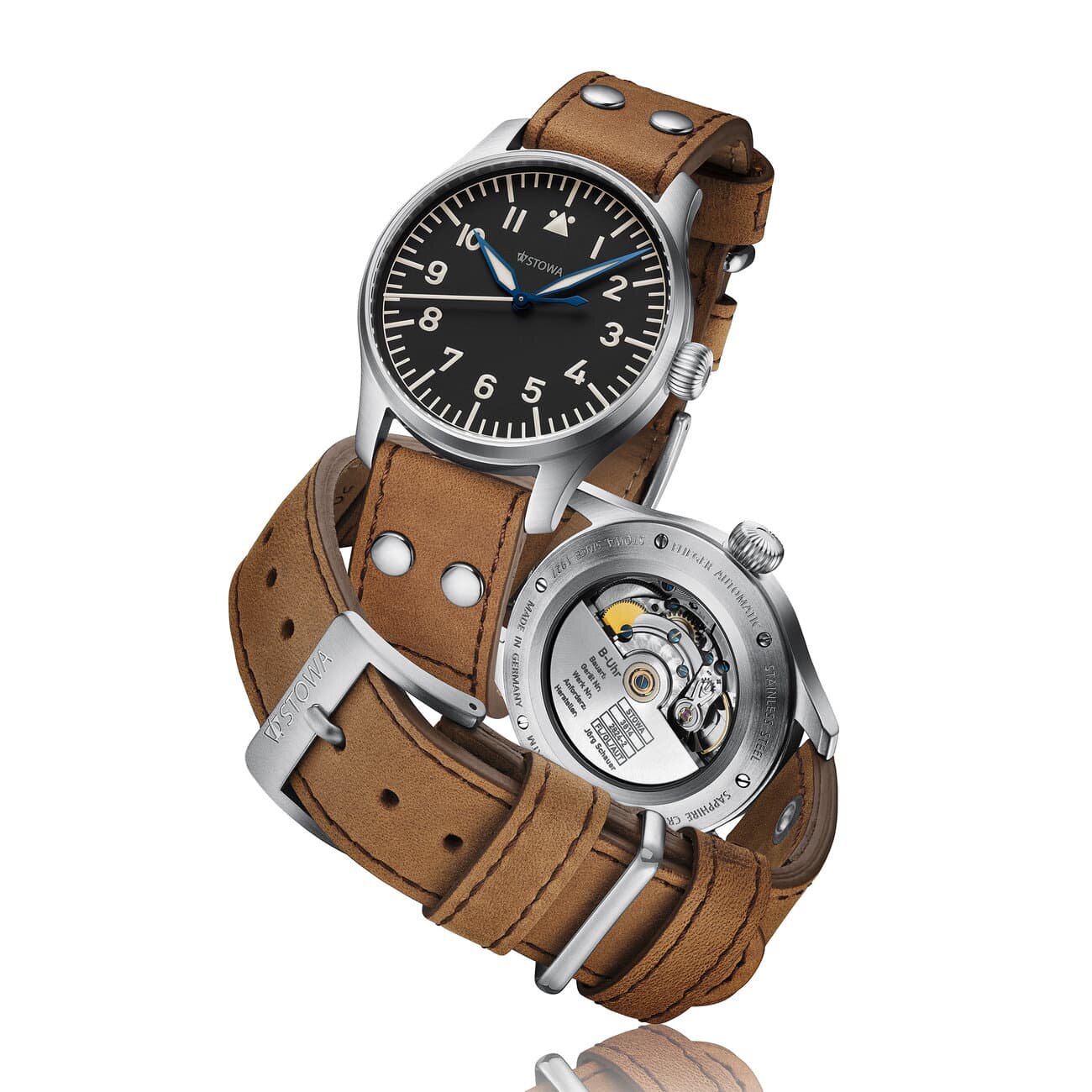 El reloj se suministra con una gruesa correa de piel de becerro marrón con una hebilla de titanio a juego con la caja, debidamente firmada.
