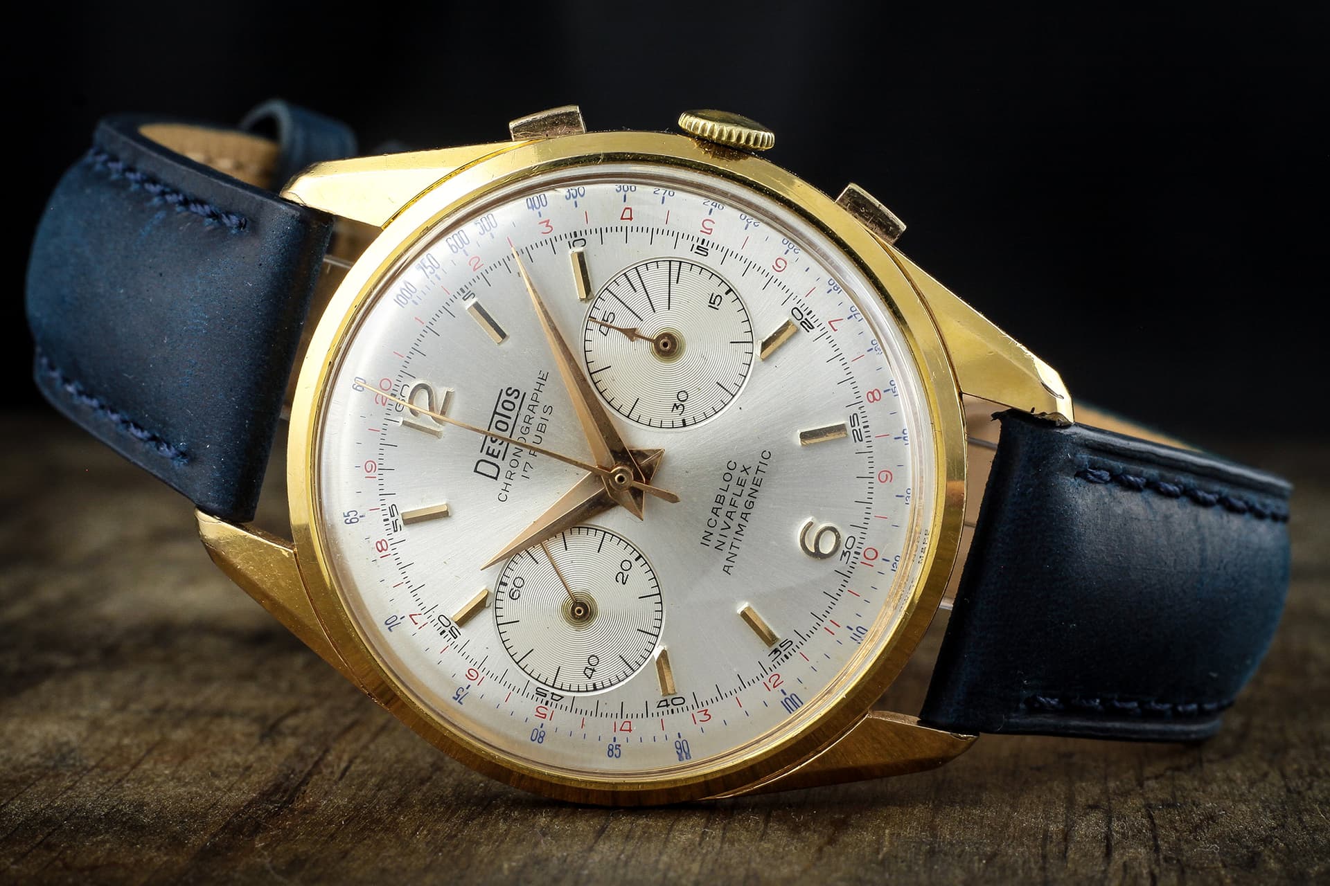 Planteándose las necesidades de los pilotos de carreras o pilotos de avión, de contar con una buena referencia de tiempos que pueda consultarse al instante y sin apenas distracción, Desotos decide tomar una atrevida solución de diseño, crear un cronógrafo que no pueda quedar tapado por la manga larga de un mono o una chaqueta de piloto. Y así nace el que será conocido como “Cuffbuster”. Monta un movimiento Valjoux 7734 con un puente firmado por Sicura (que también utilizaba Brietling) y presenta una caja con los pulsadores a lo largo de su parte superior (modo bullhead) para facilitar su manejo. Además, tiene una curiosa disposición asimétrica que permite que se asiente parcialmente sobre el dorso de la mano, lo que impide que quede cubierta por la manga del usuario y facilita así el acceso.