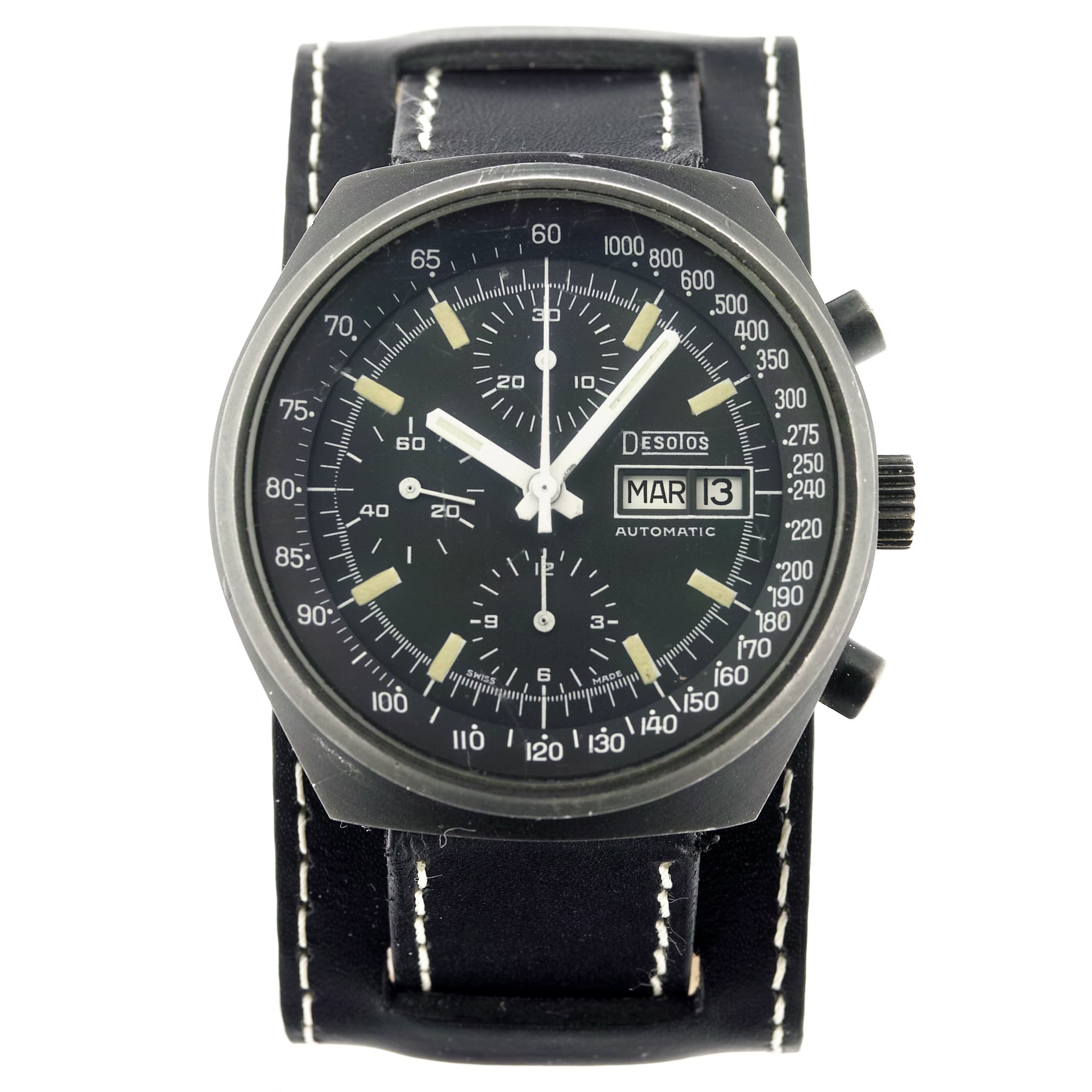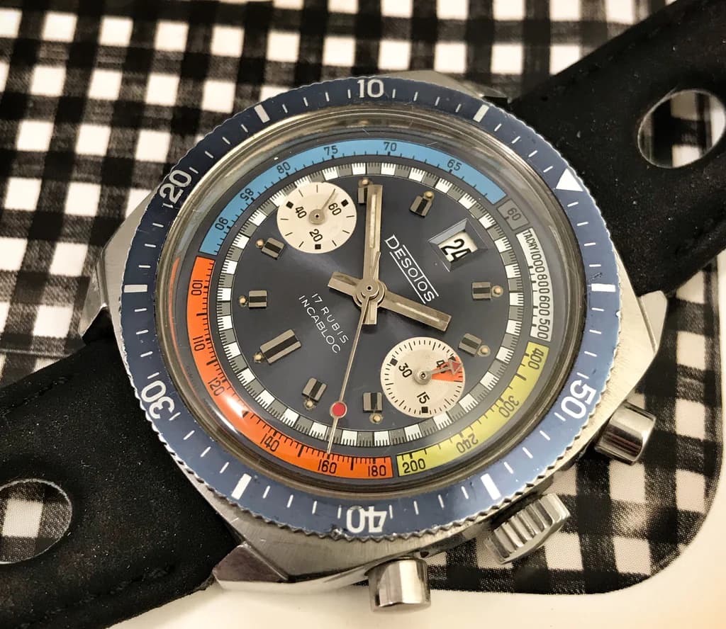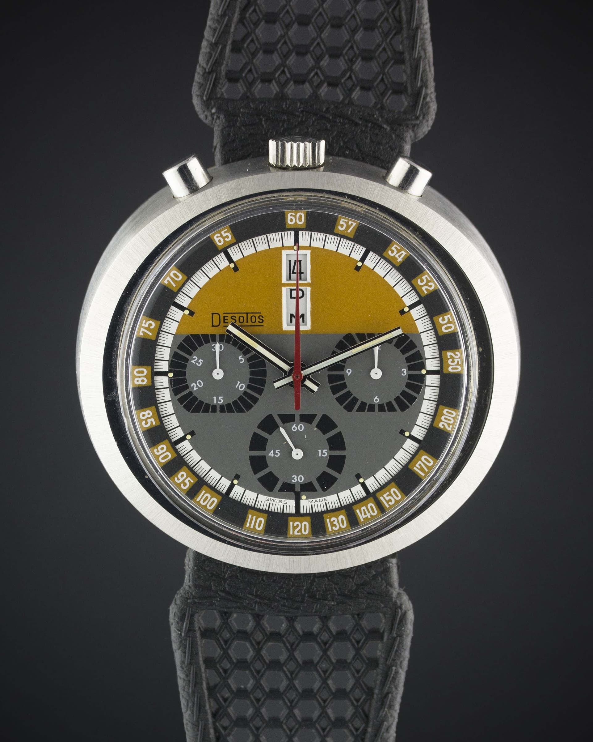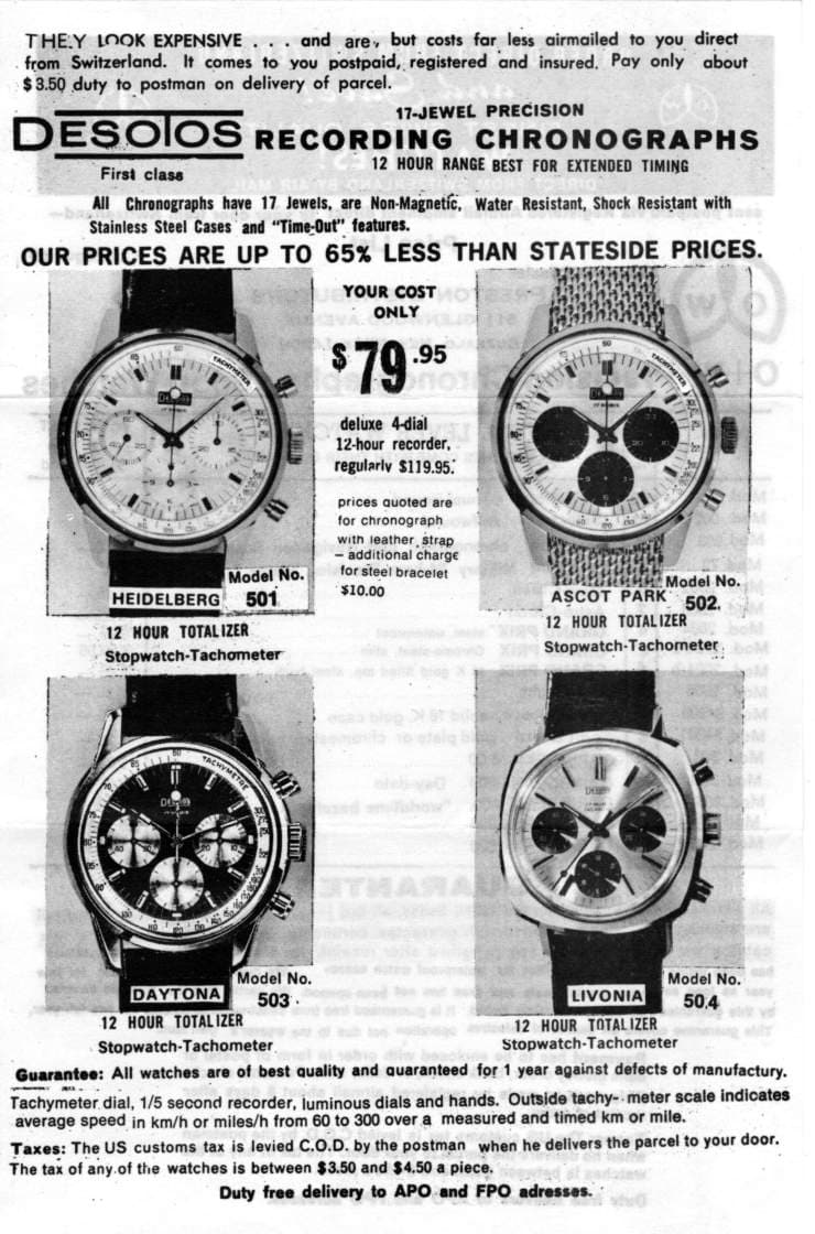 La marca Desotos se centrará sobre todo en relojes deportivos y la empresa afirmará ser “la primera en utilizar métodos de cadena de montaje en la producción de cronógrafos”. En 1971 Desotos también fabricará relojes de señora pero durante la crisis del cuarzo la empresa pareció haberse centrado en los cronógrafos. Como se puede imaginar, el catálogo es amplio con unos diseños muy de la época que no han perdido para nada su atractivo. Algunos ejemplos:
