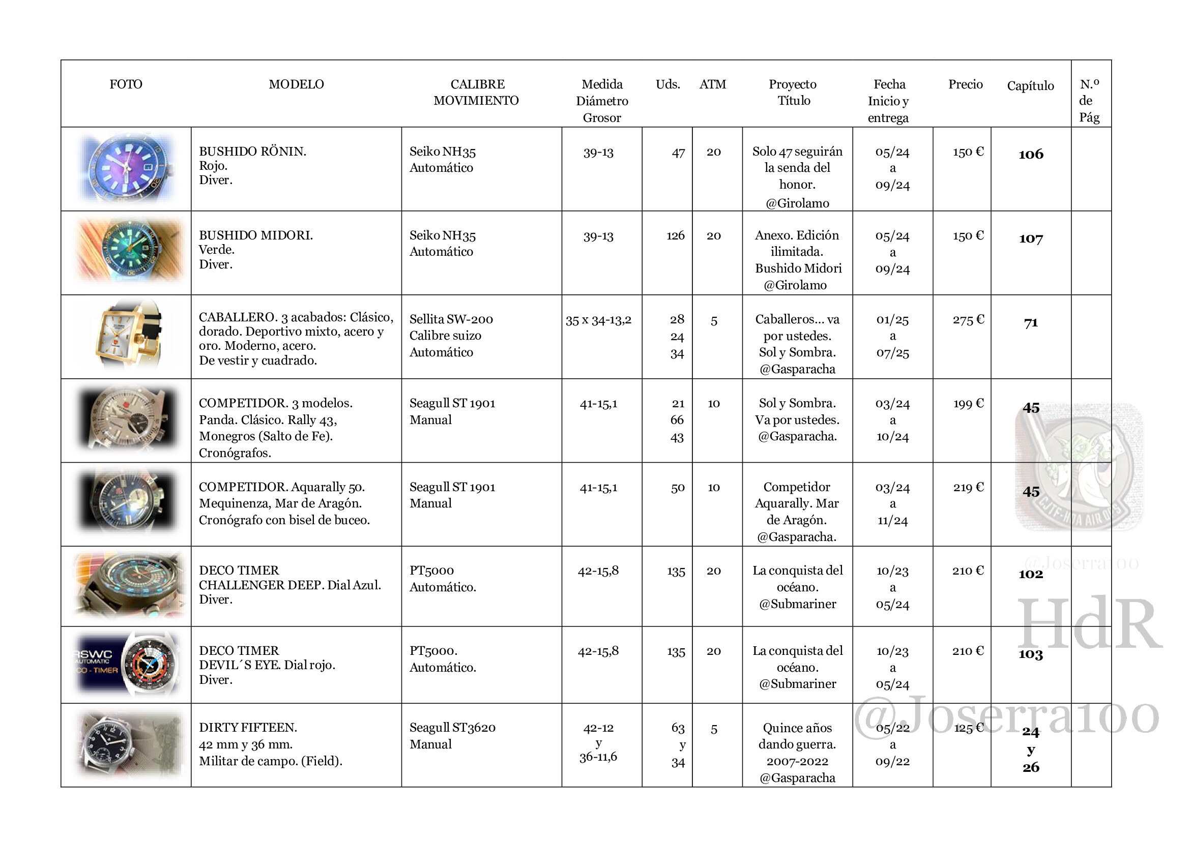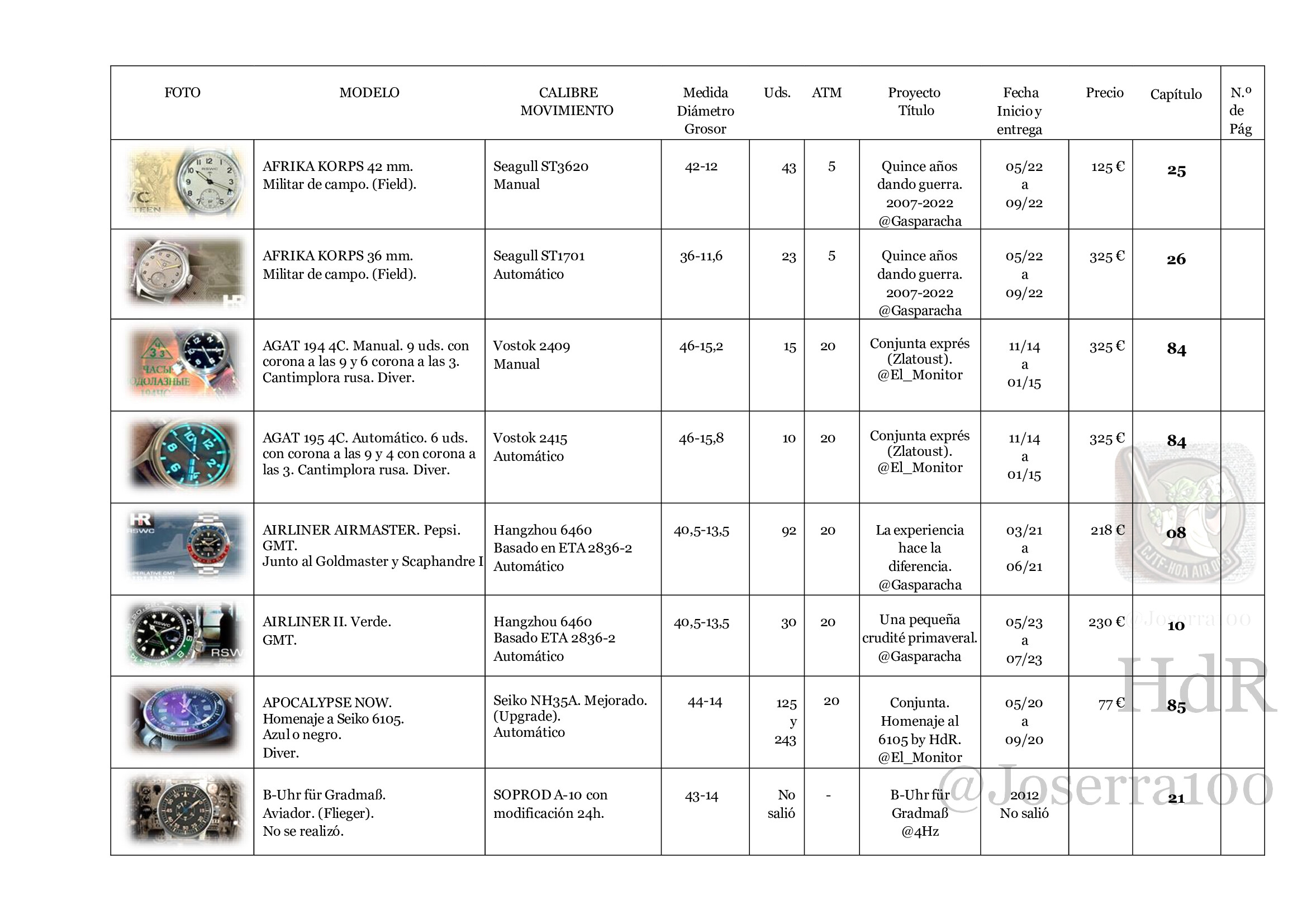 Índice extraído del libro. Páginas por orden alfabético del nombre de reloj y picando en el enlace lleva a cada proyecto y reloj.