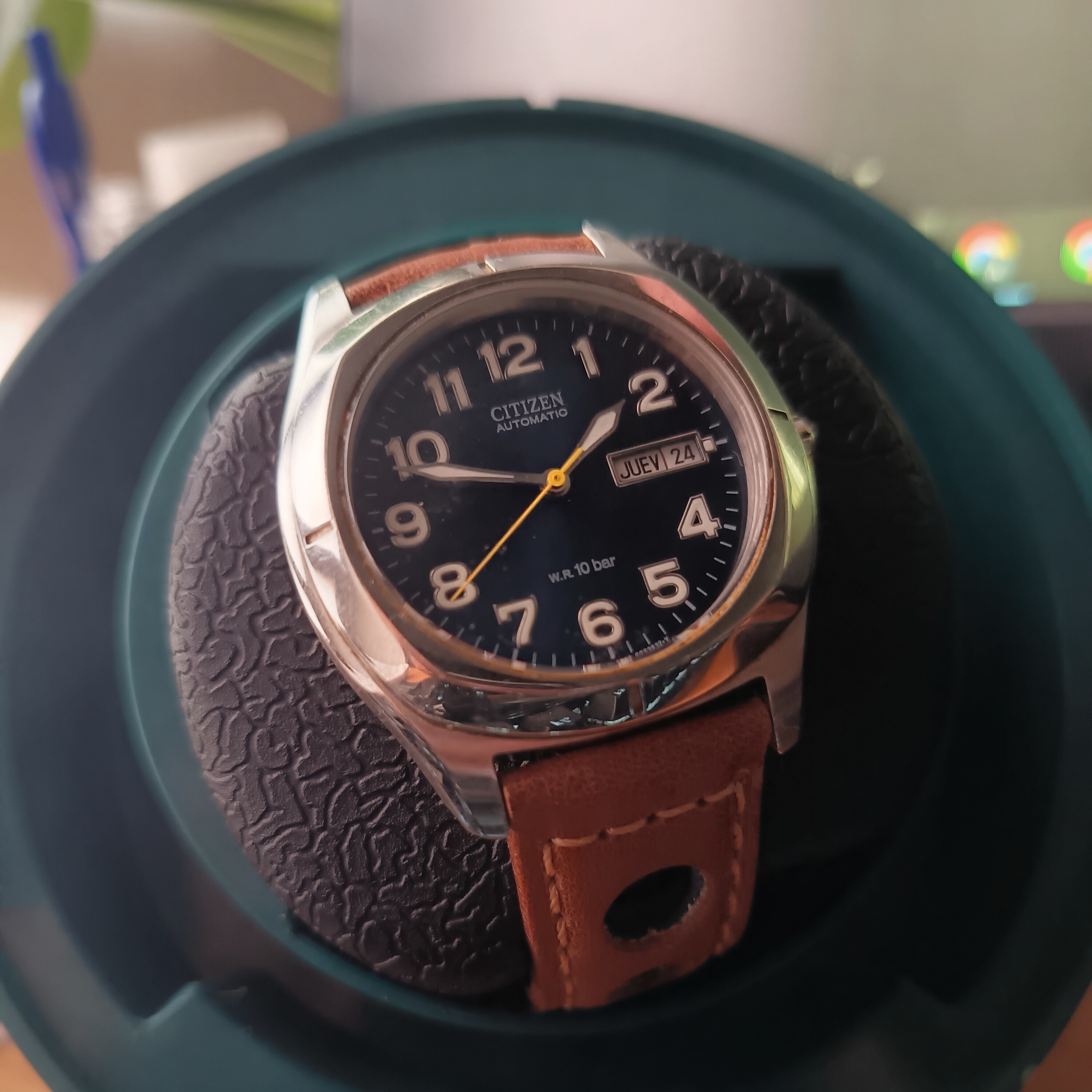 Lo tengo en un estuche de 3 Seiko, porque me genera toc en la caja principal por lo cantoso que resulta. Pero es que cuando lo quité de la principal dejó un hueco insustituible, se ve una caja triste, anodina, vacía. Su debilidad es su fortaleza :')