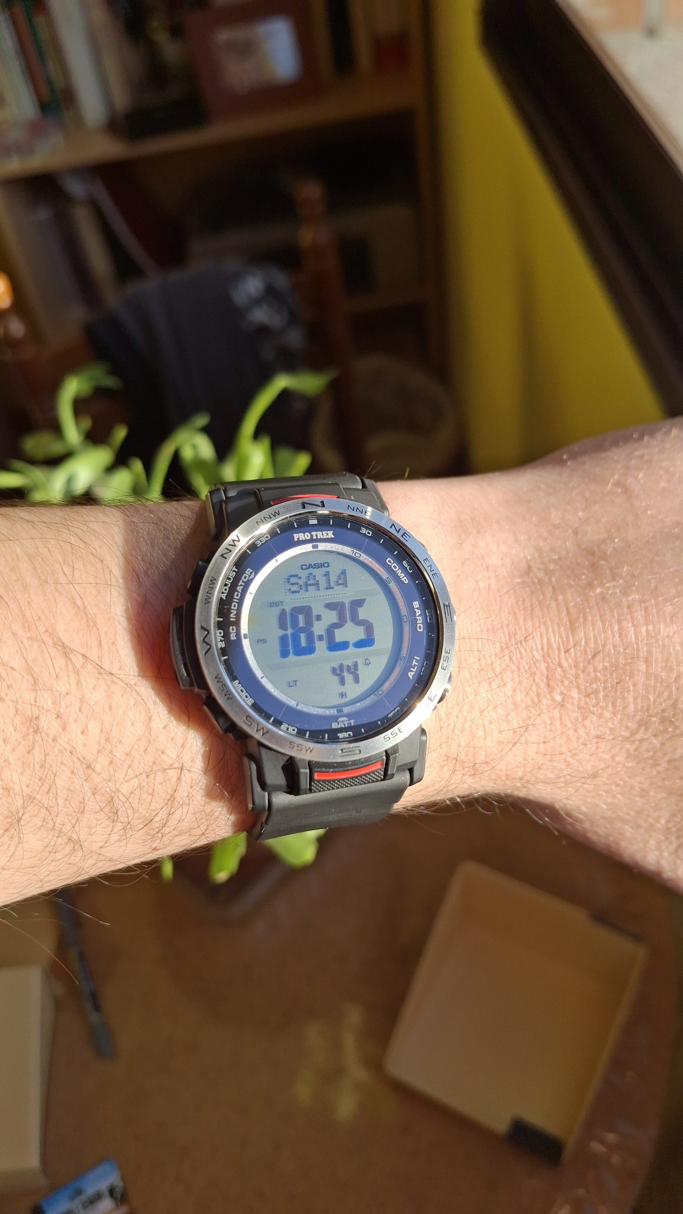 Así que busque una alternativa más “llevable” para mi y, del catálogo actual, esto era lo mejor: digital, solar y radiocontrolado, y con una pantalla muy grande y legible, otra de las pegas del Rangeman.