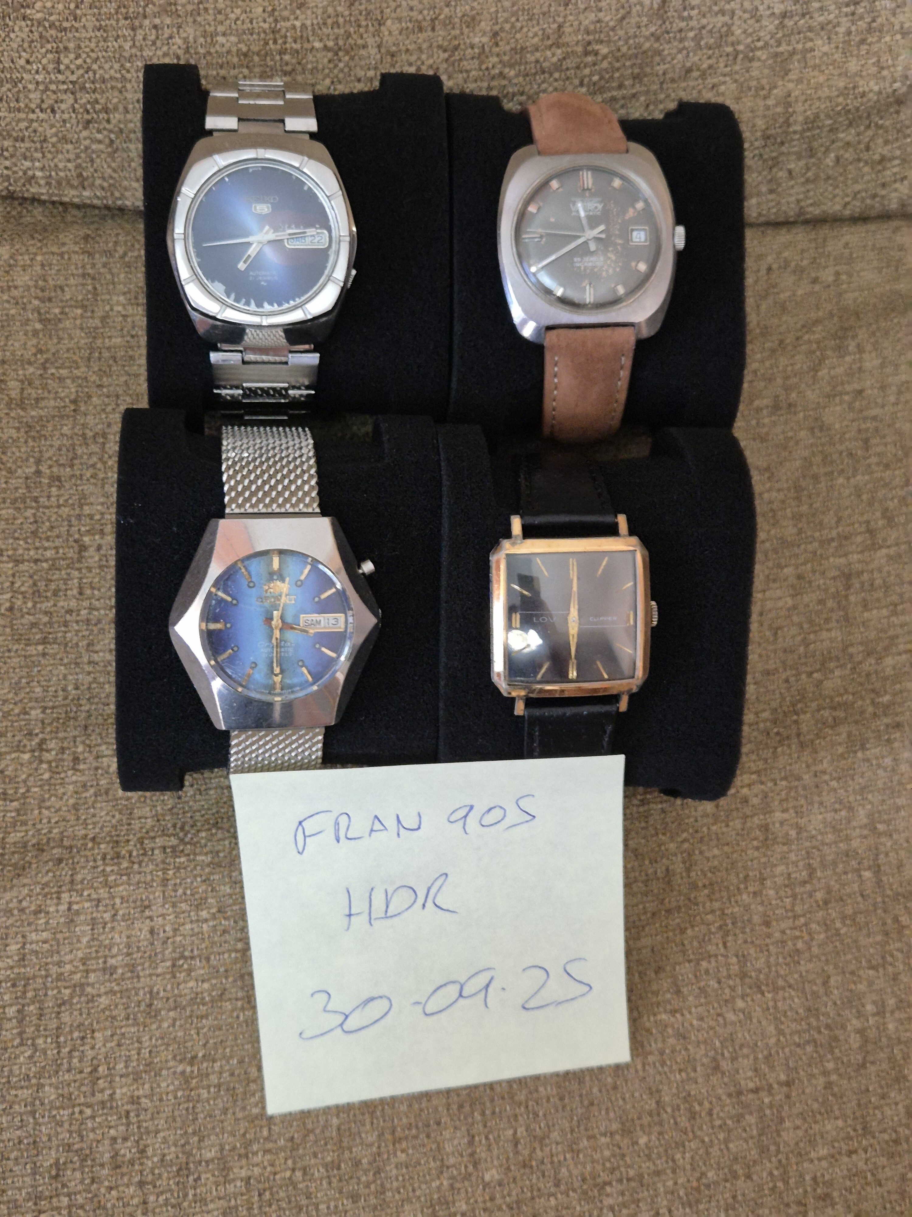 Pongo a la venta éste lote de relojes vintage compuesto de Seiko 5, Orient cristal, Vanroy incabloc y Lov clipper, todos funcionando perfectamente.