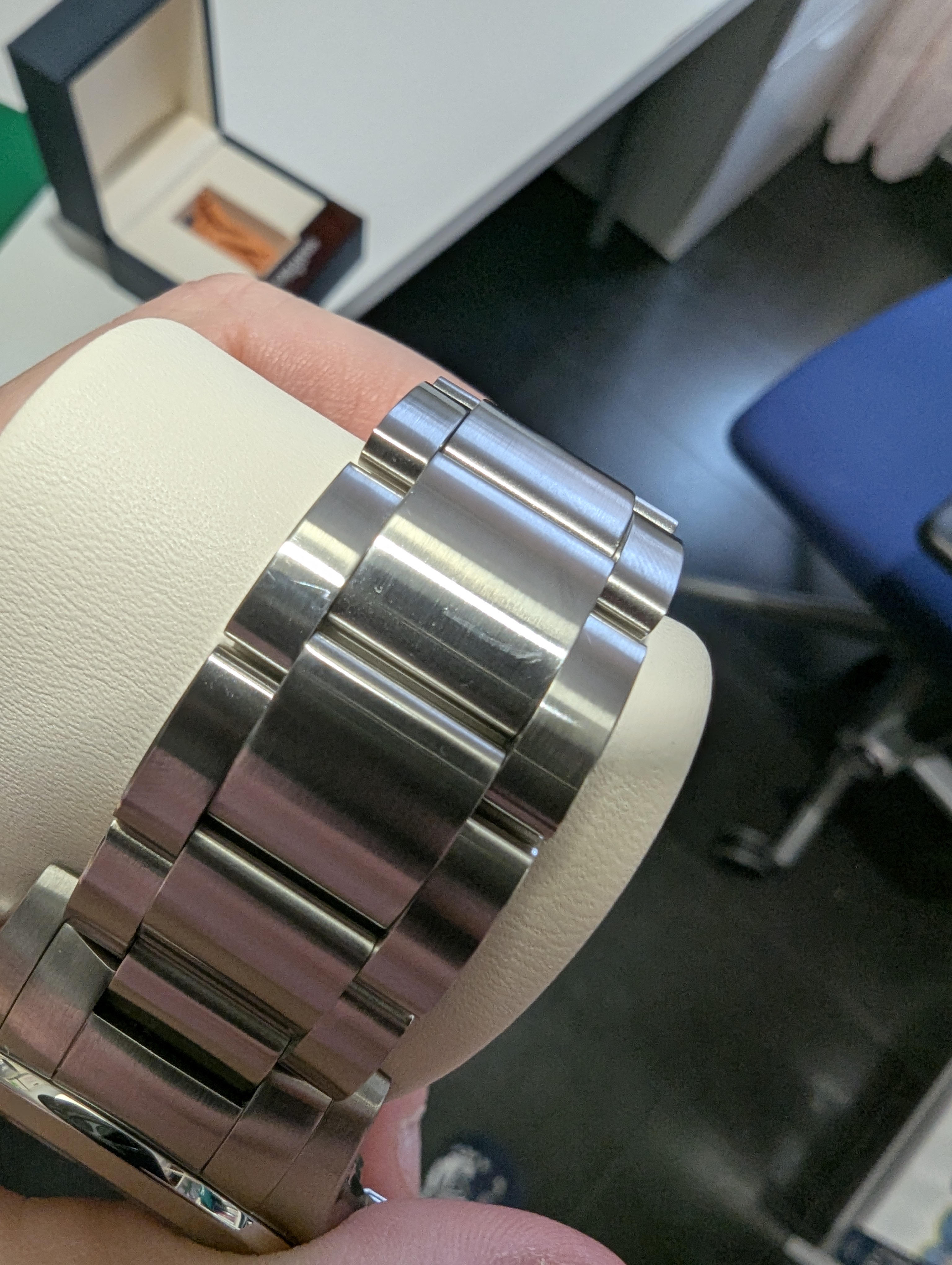 Te juro que no me explico qué coño ha podido pasar… en la foto se ve detrás la caja del reloj, solo lo llevo al trabajo, por casa me lo quito y lo meto en su caja, e incluso si te fijas hay una gamuza naranja abajo para que no roce contra nada en la parte inferior… Metería la mano en algún sitio para coger algo o yo que se y se rozaría así, pero ni idea… solo me lo pongo en el trabajo e incluso tengo un taco de folios bajo mi muñeca izquierda para que el reloj no roce contra la mesa mientras trabajo con el ordenador…