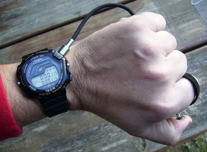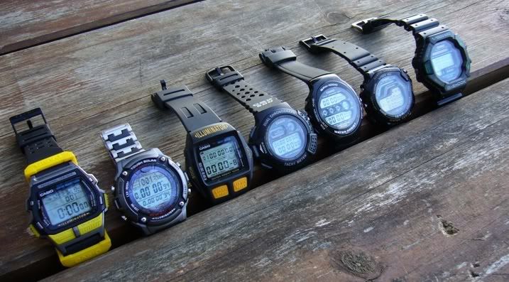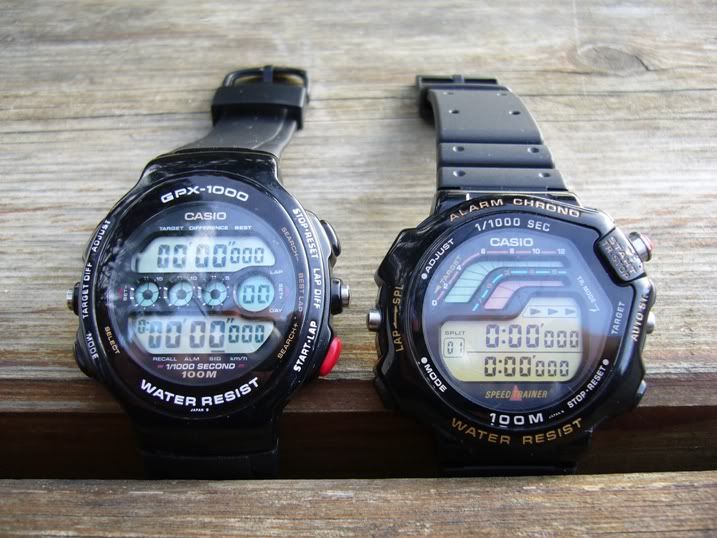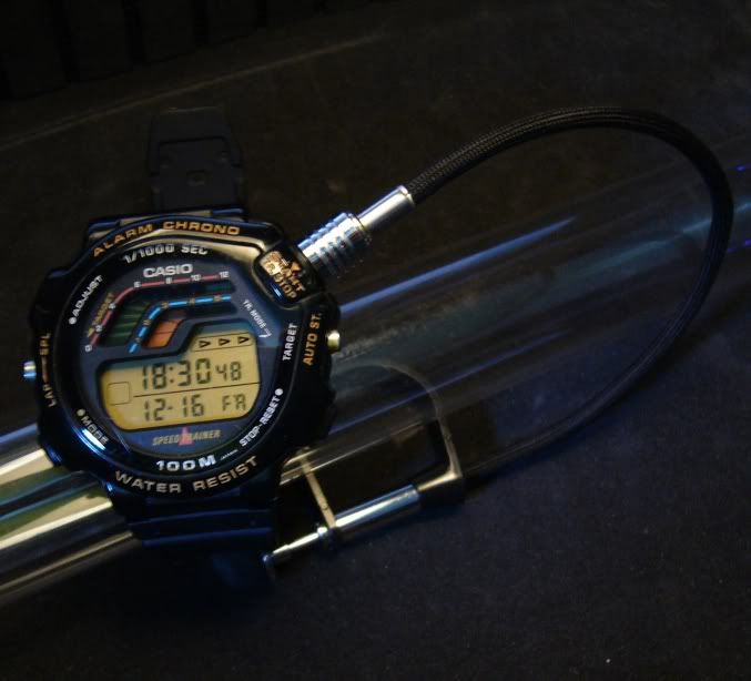 un peculiar modelo de casio de los 80 que se caracteriza por tener un pulsador a traves de cable con el que iniciar y pausar el cronometro evitando asi tener que usar la mano contraria, toda una virgueria de casio