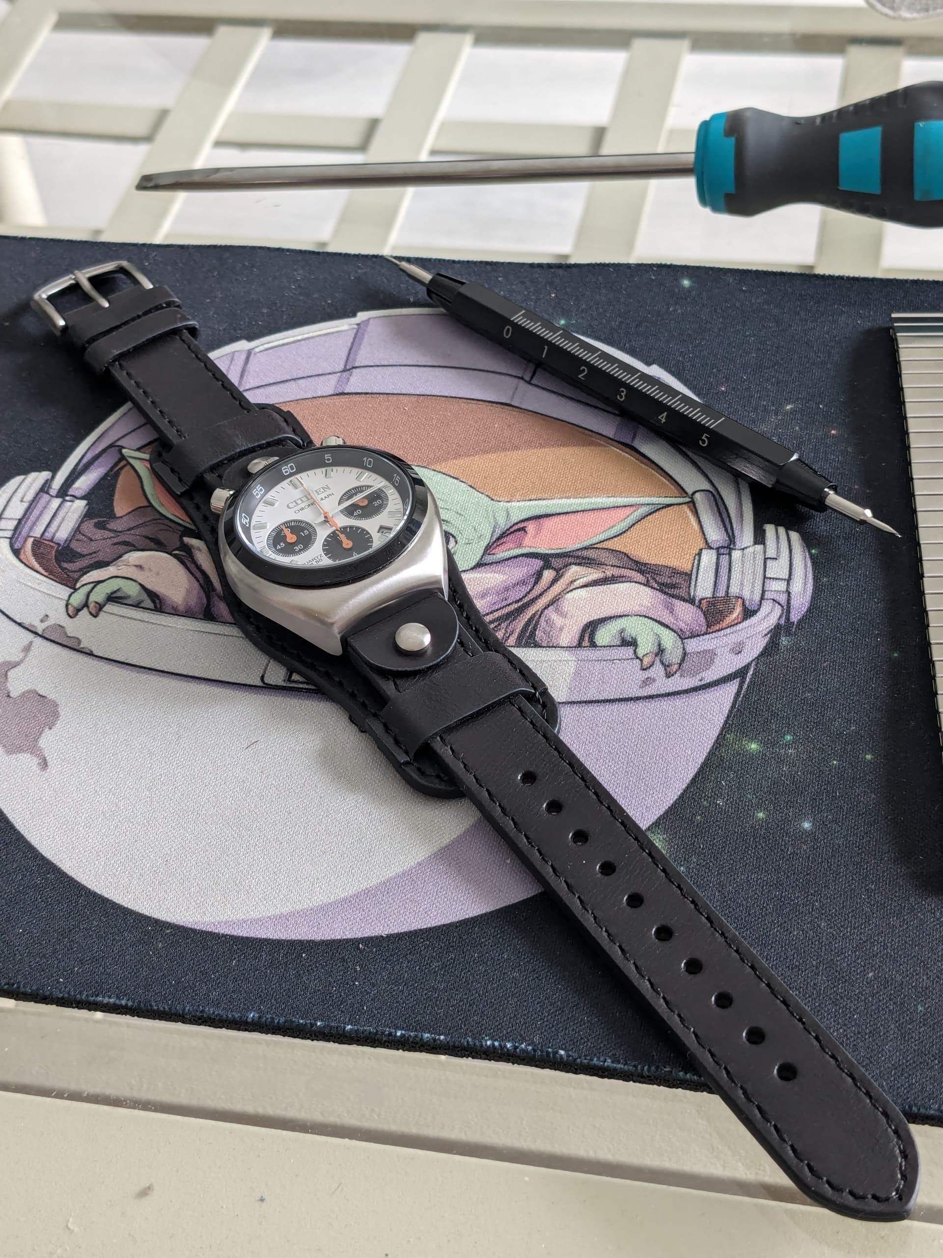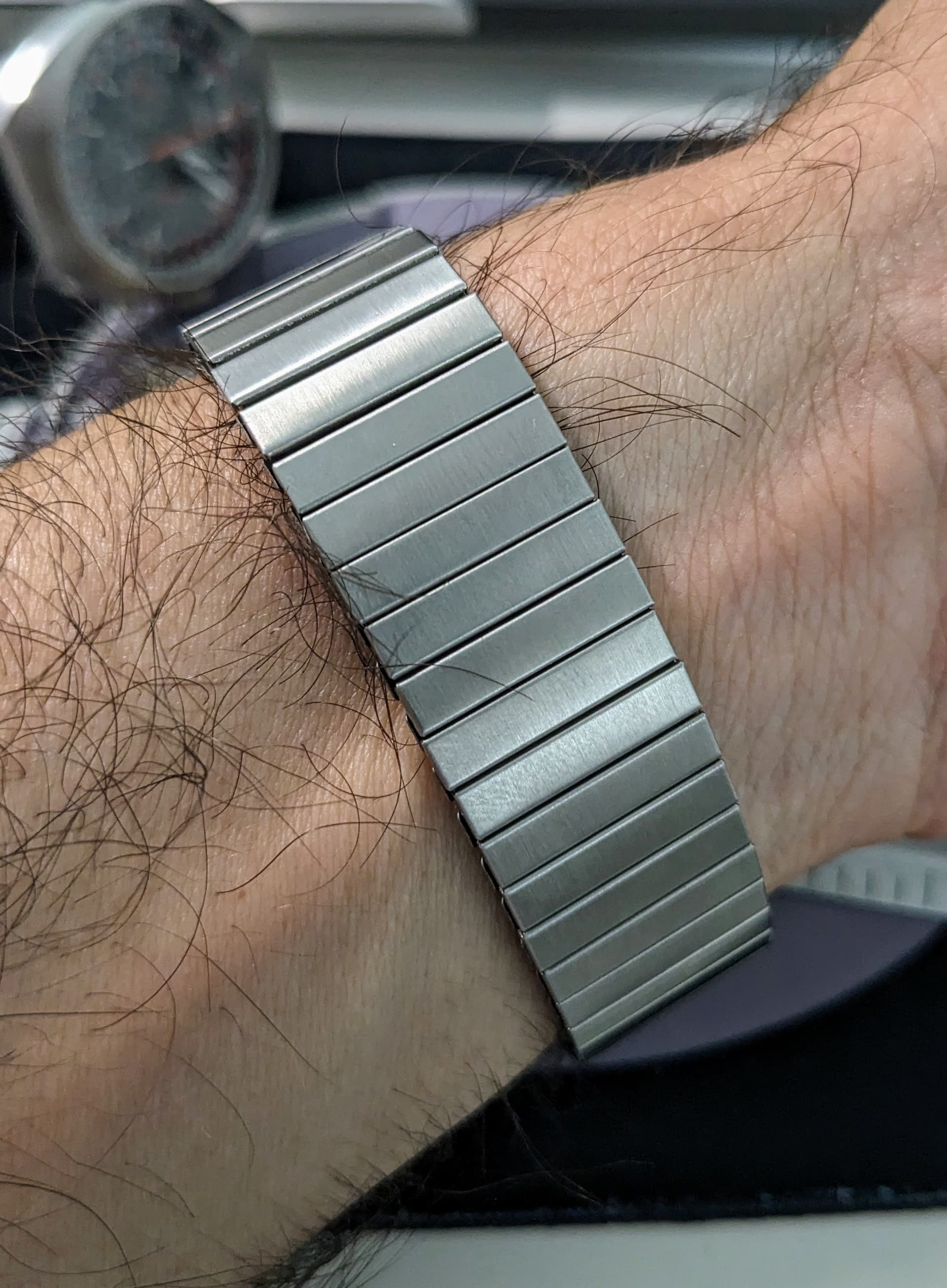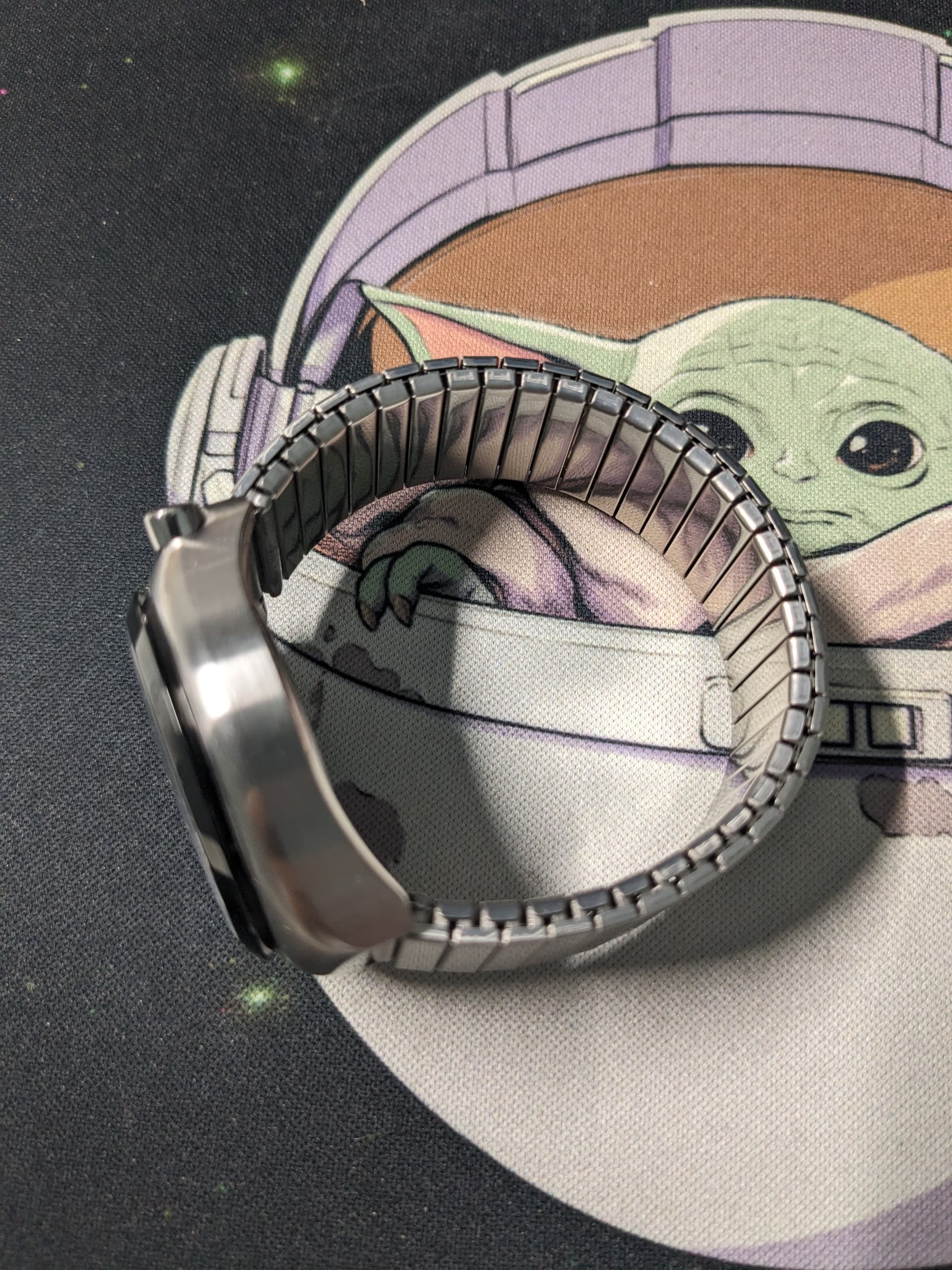 Me acaba de llegar la correa elástica de acero. Más gruesa que la original y evita el “baile” del reloj en la muñeca: