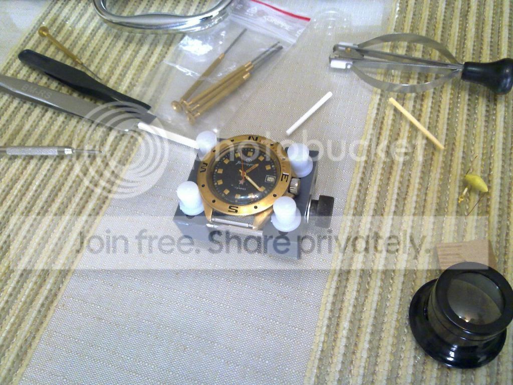 Tenia pendiente cambiar las agujas que tenia el modelo por unas nuevas de un komandirskie actual, también en dorado. Aprovechando el día de lluvia, y unas herramientas que me ha prestado un amigo, me he puesto a ello.