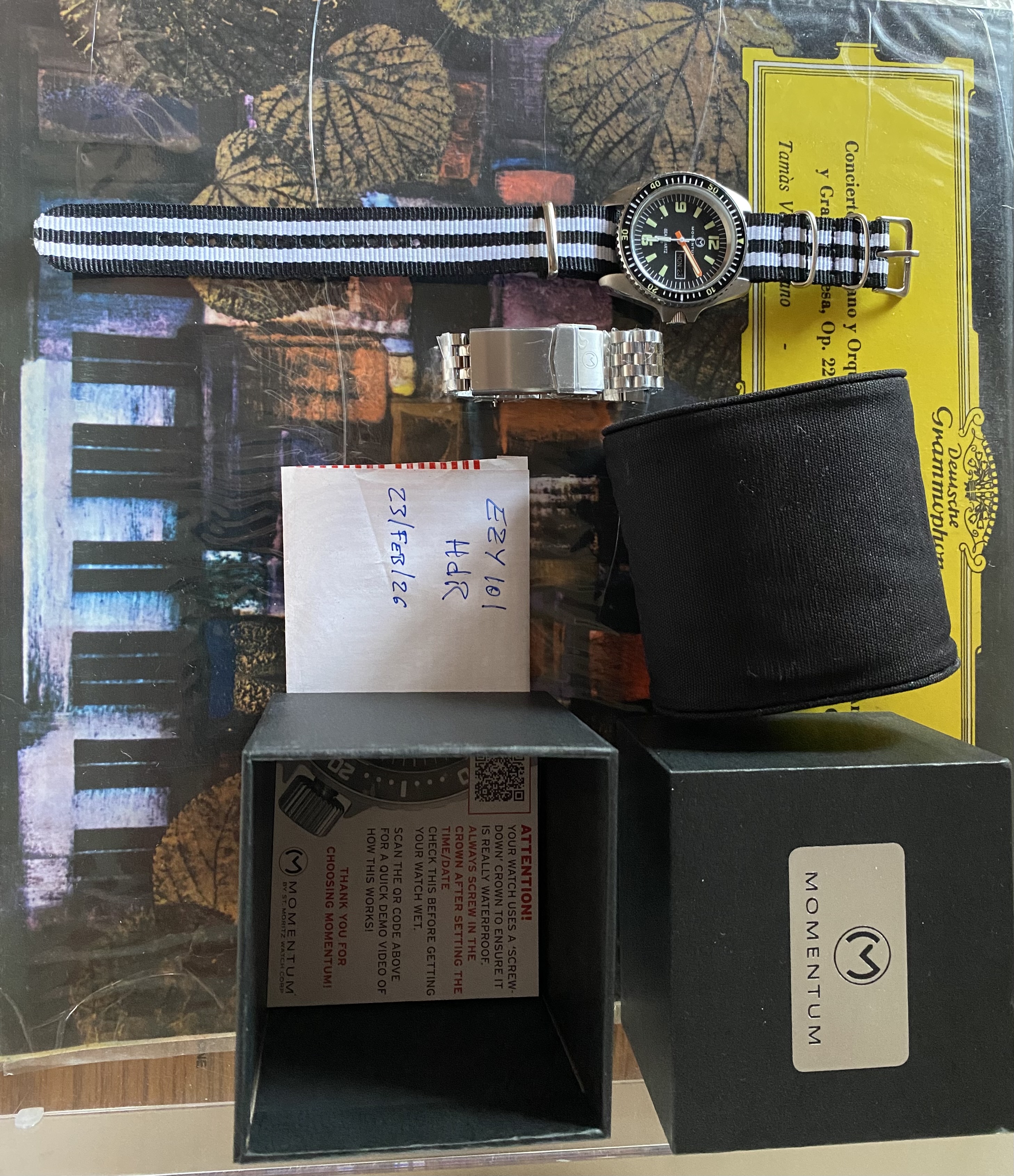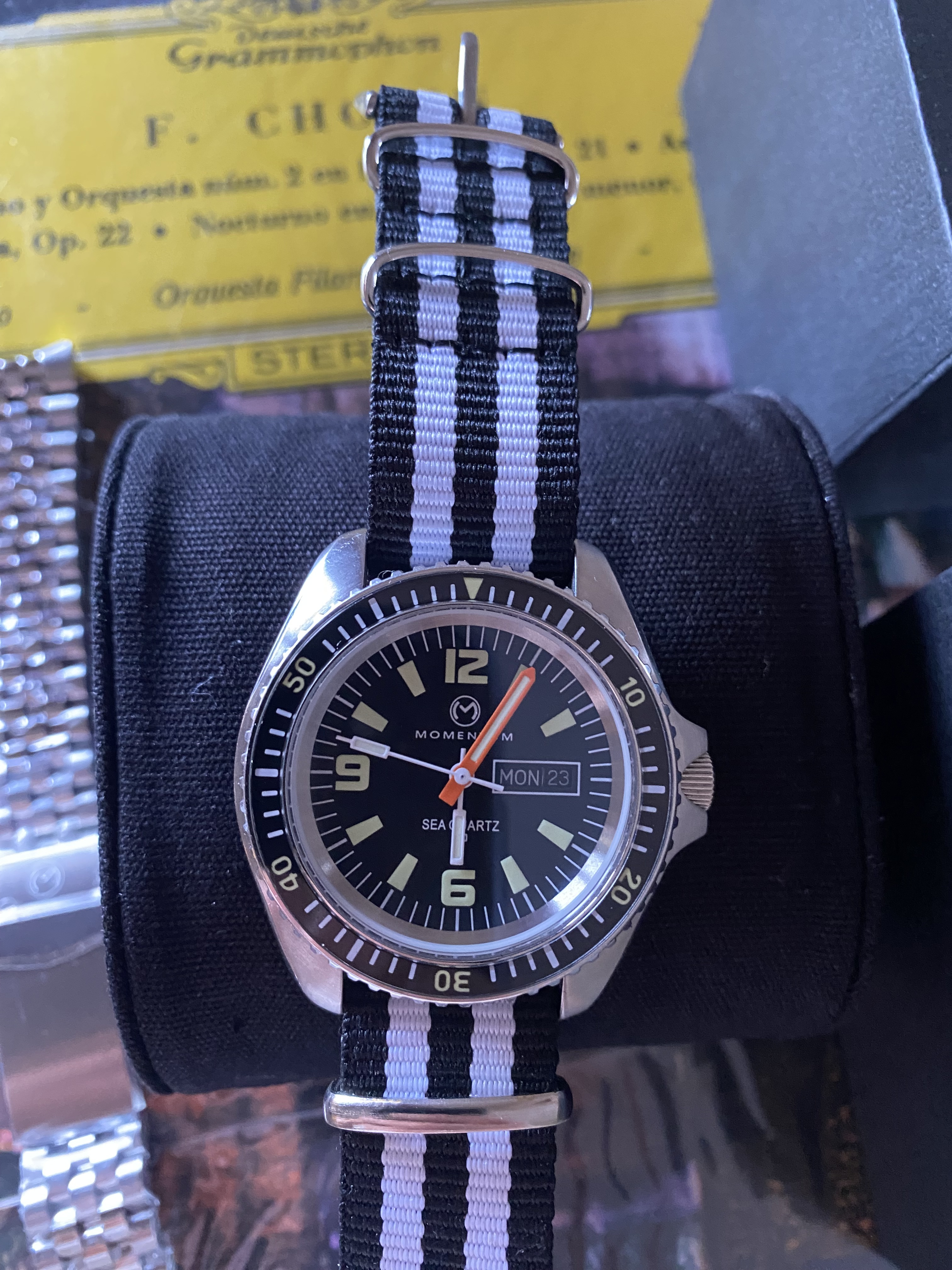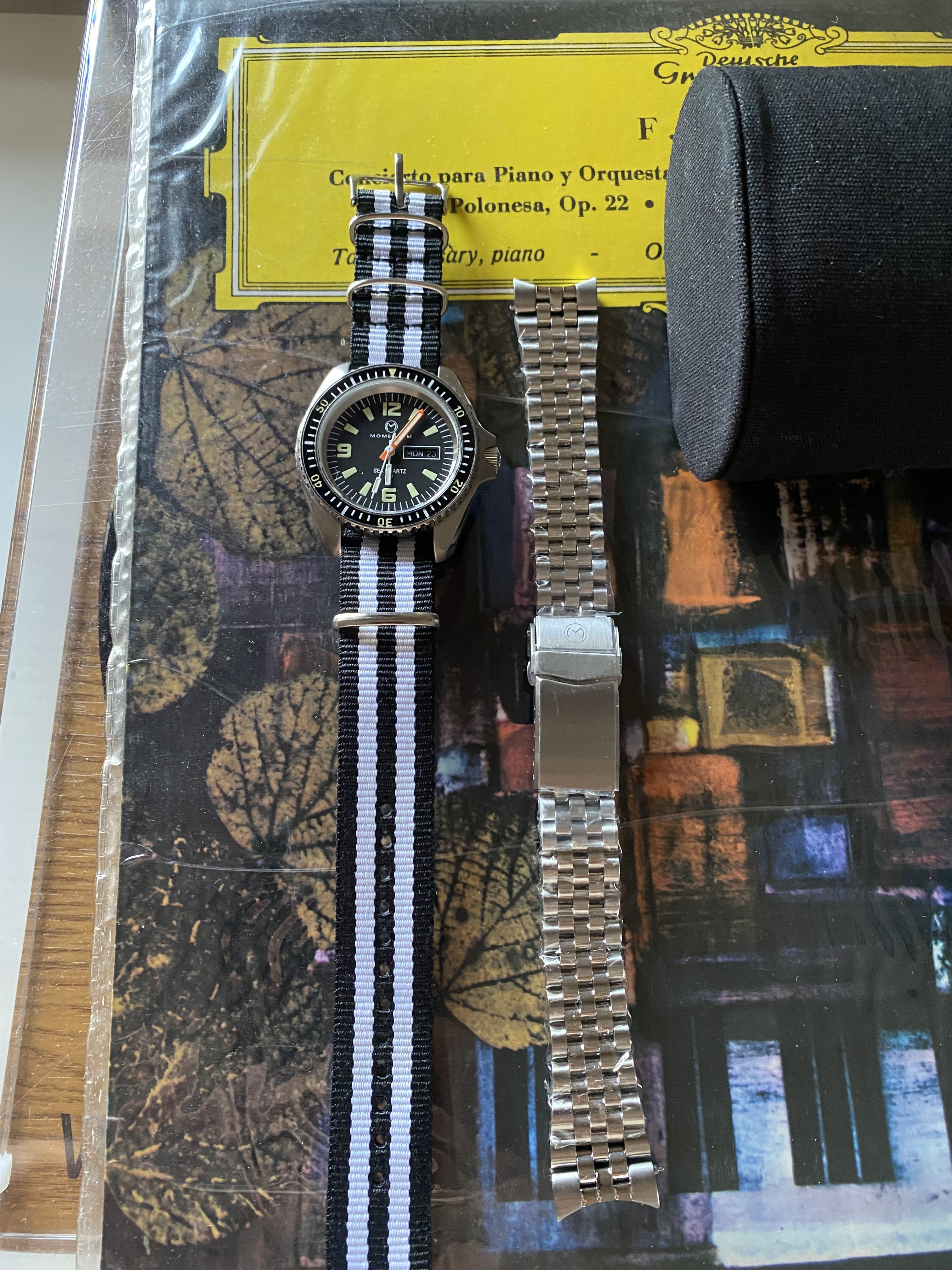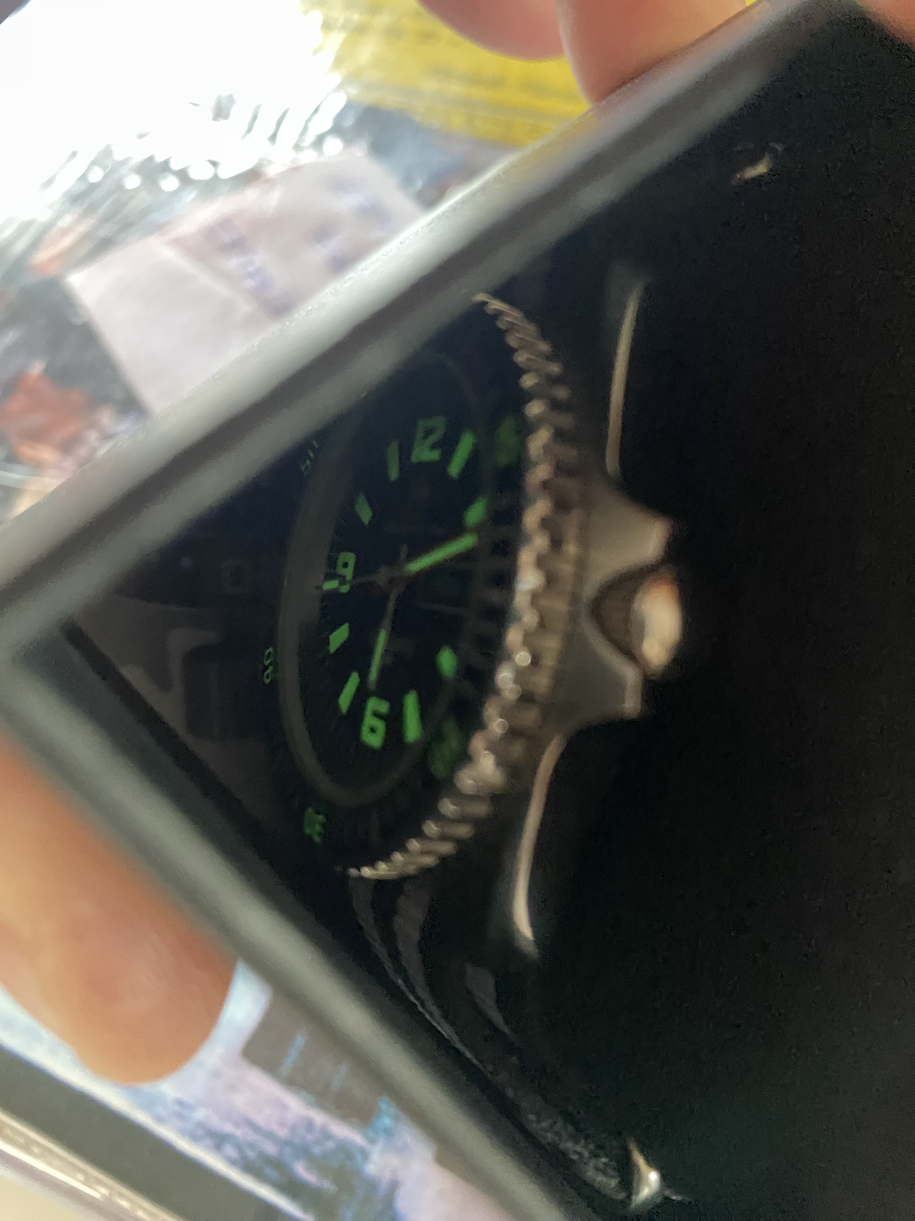 El reloj está en muy buen estado, caja y zafiro impecables, lume muy bueno, bezel firme,nato a estrenar y lo curioso con el brazalete es que está con los plásticos puestos ( no lo he usado nunca) pero la pegatina del cierre no está y por tanto tiene alguna raya ![]()