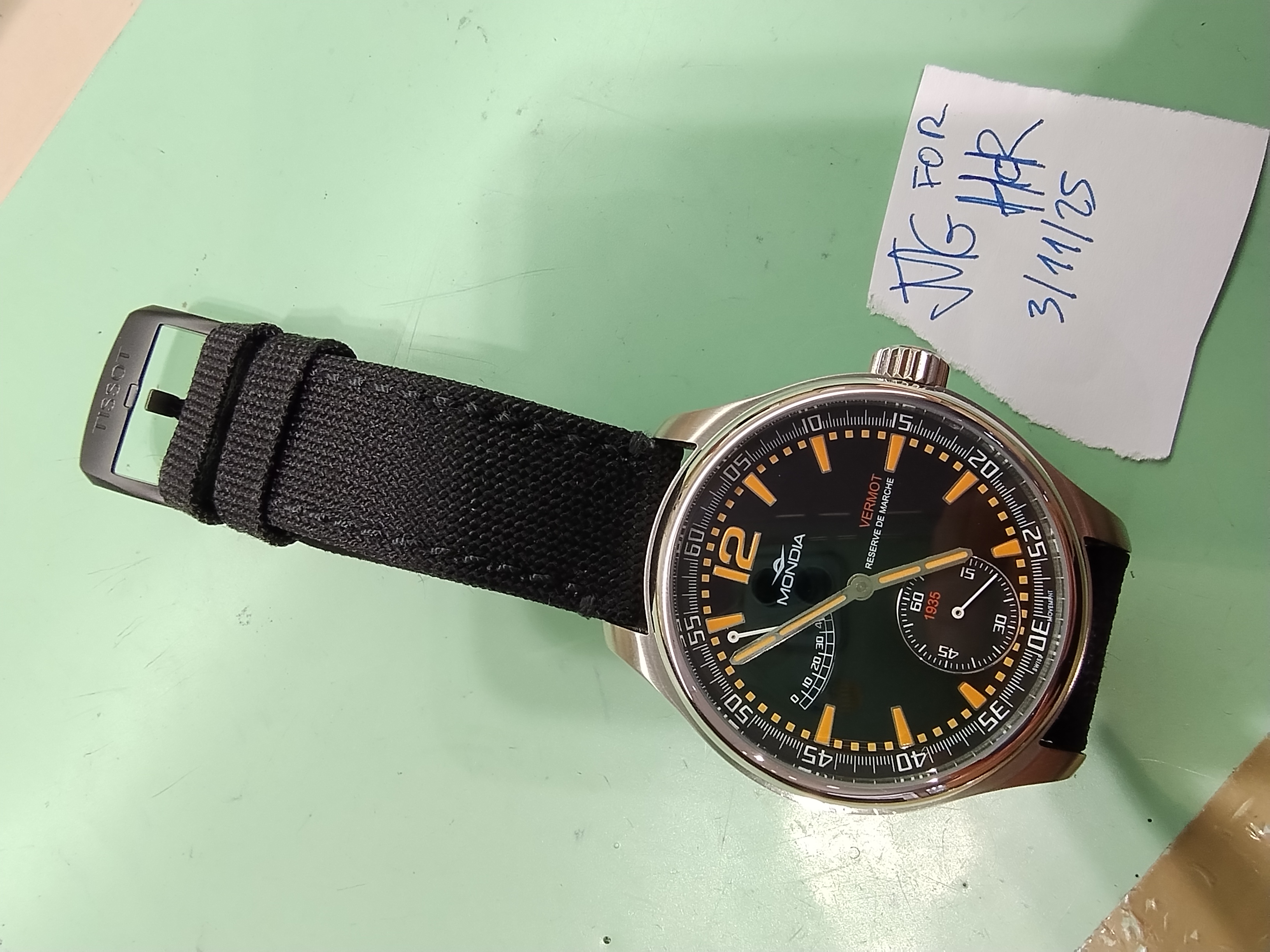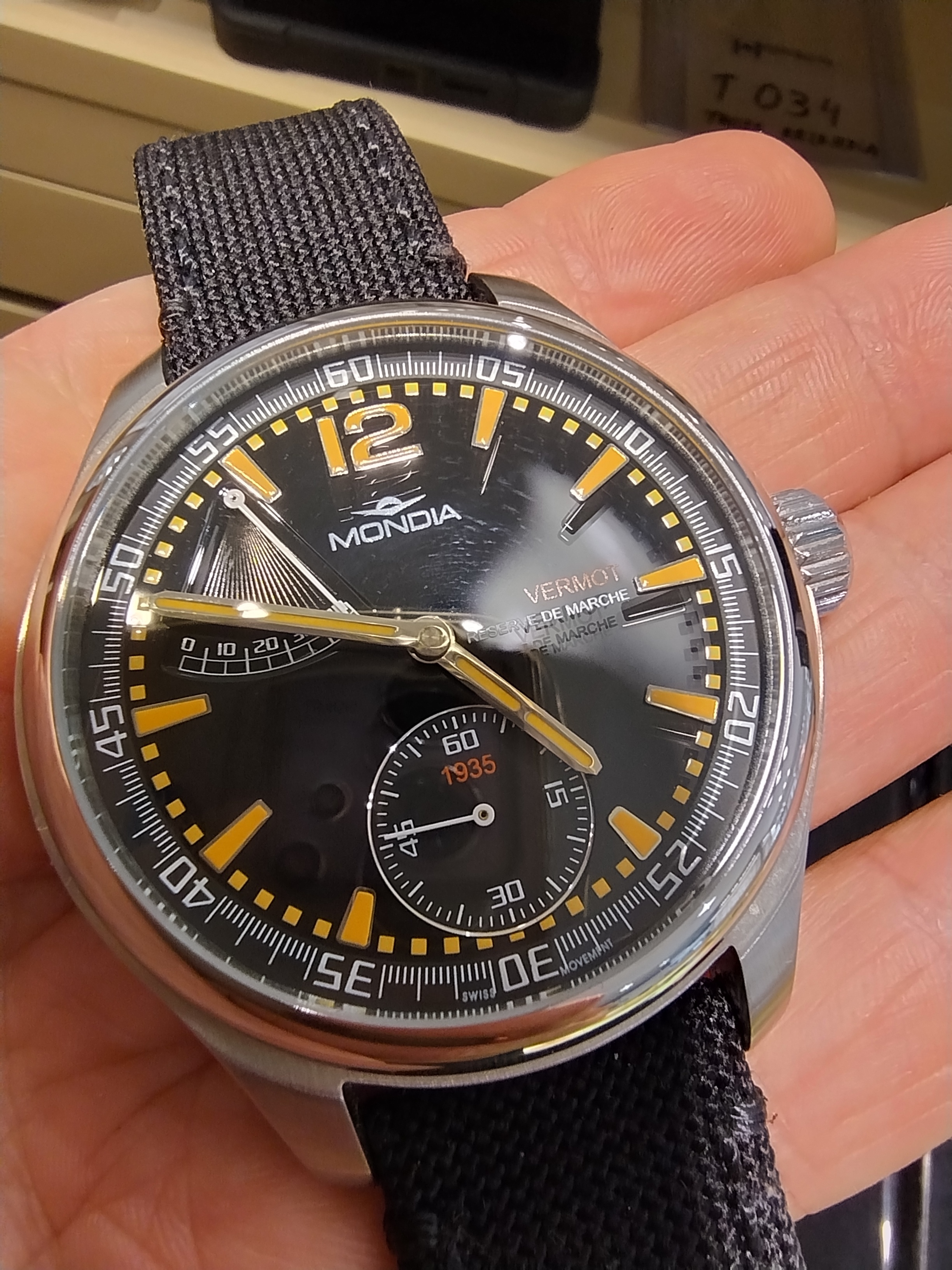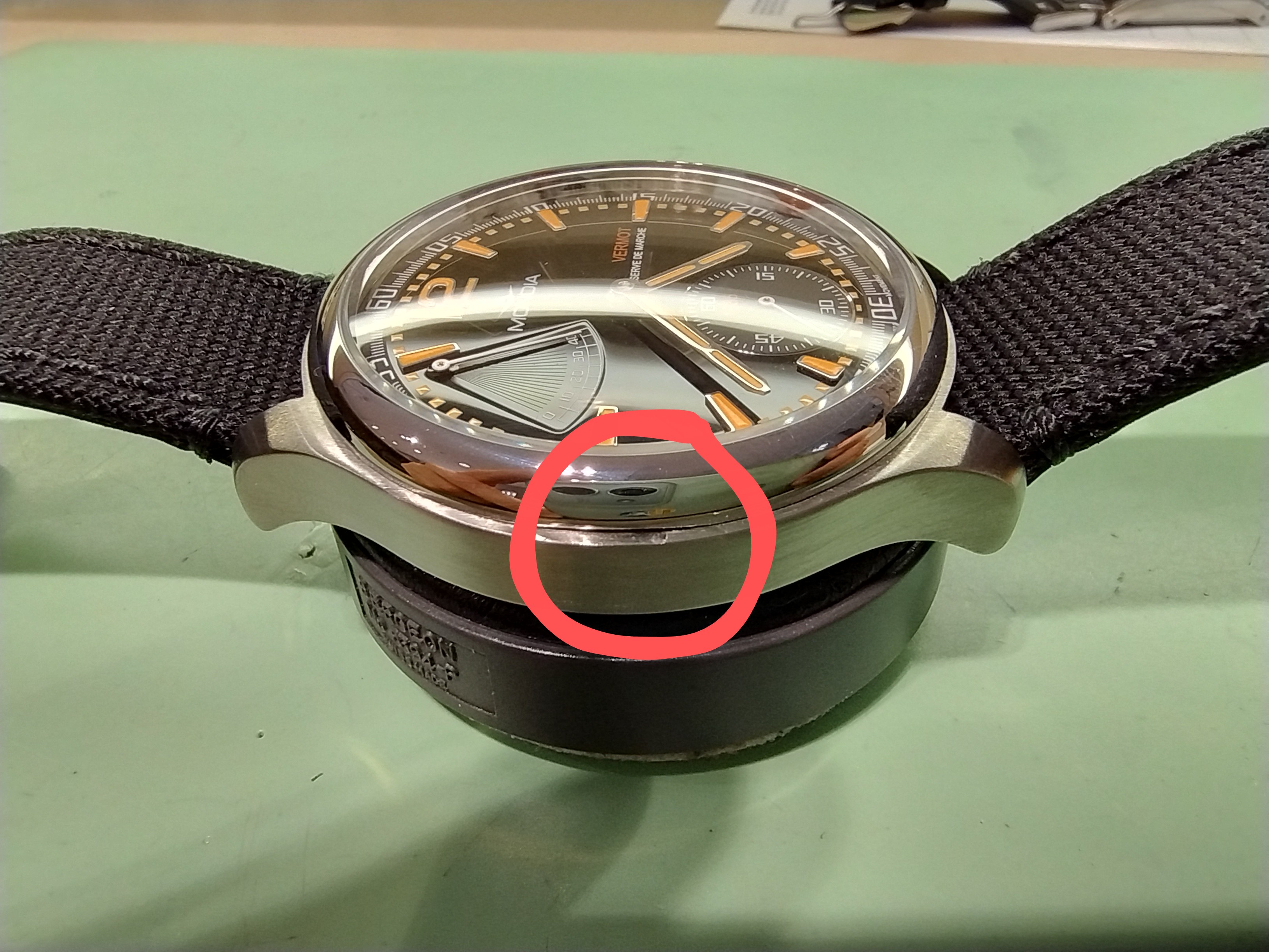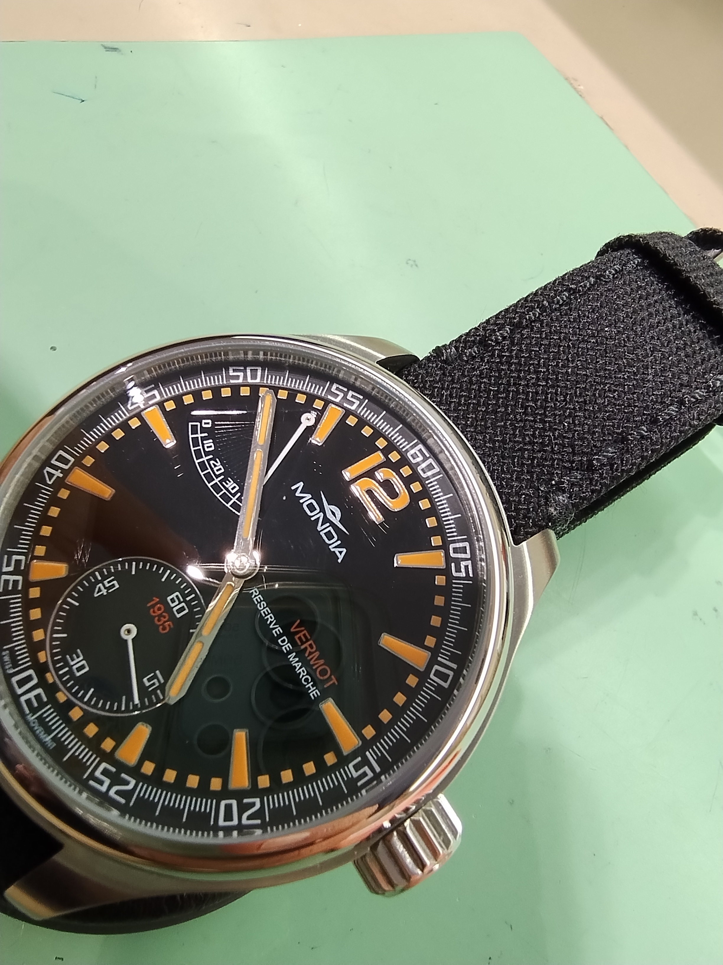 El reloj está en muy buen estado general, poco uso, tiene un mínimo picotazo en cristal debajo de la palabra mondia, y buscando mucho al trasluz y con claridad y lupa parece que el cristal está algo sucio por dentro, pero es muy mínimo y es buscando a conciencia. La caja tiene una marquita también donde.indico con otra foto.