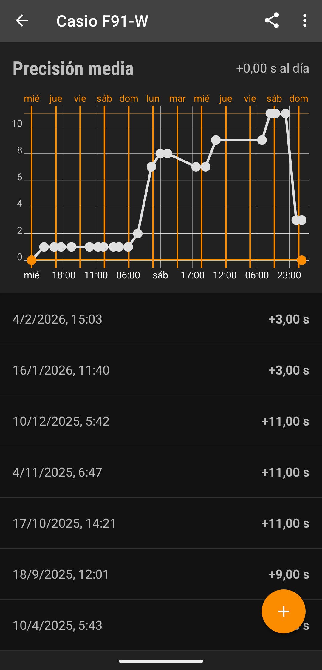 Los míos están uno a +0,4 s/d, el otro a + 0,1 s/d. A temperatura de muñeca, pasan a +0,3 s/d y ±0,0 s/d. Hice un cálculo en un hilo de otro foro, me autocito aquí: