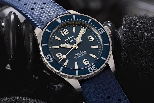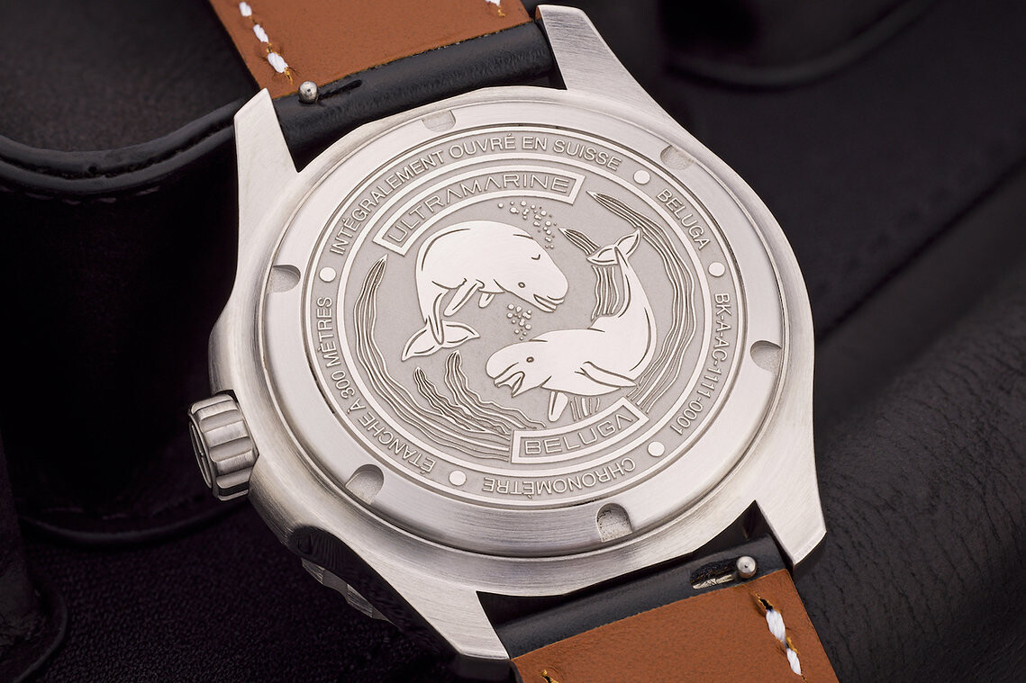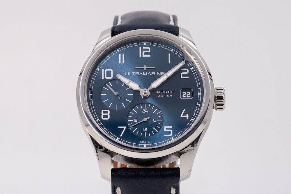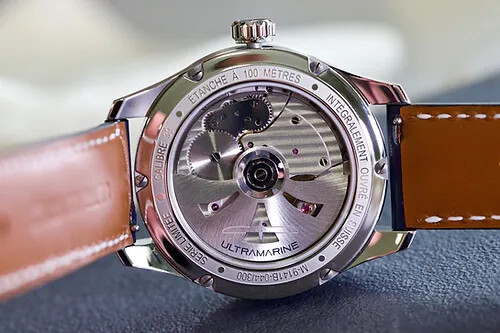 Los franceses de Ultramarine, que montaban calibres Eterna y ahora Kenissi, usan el “I.O.E.S.”, (“Intégralement ouvré en Suisse”, Fabricado íntegramente en Suiza).