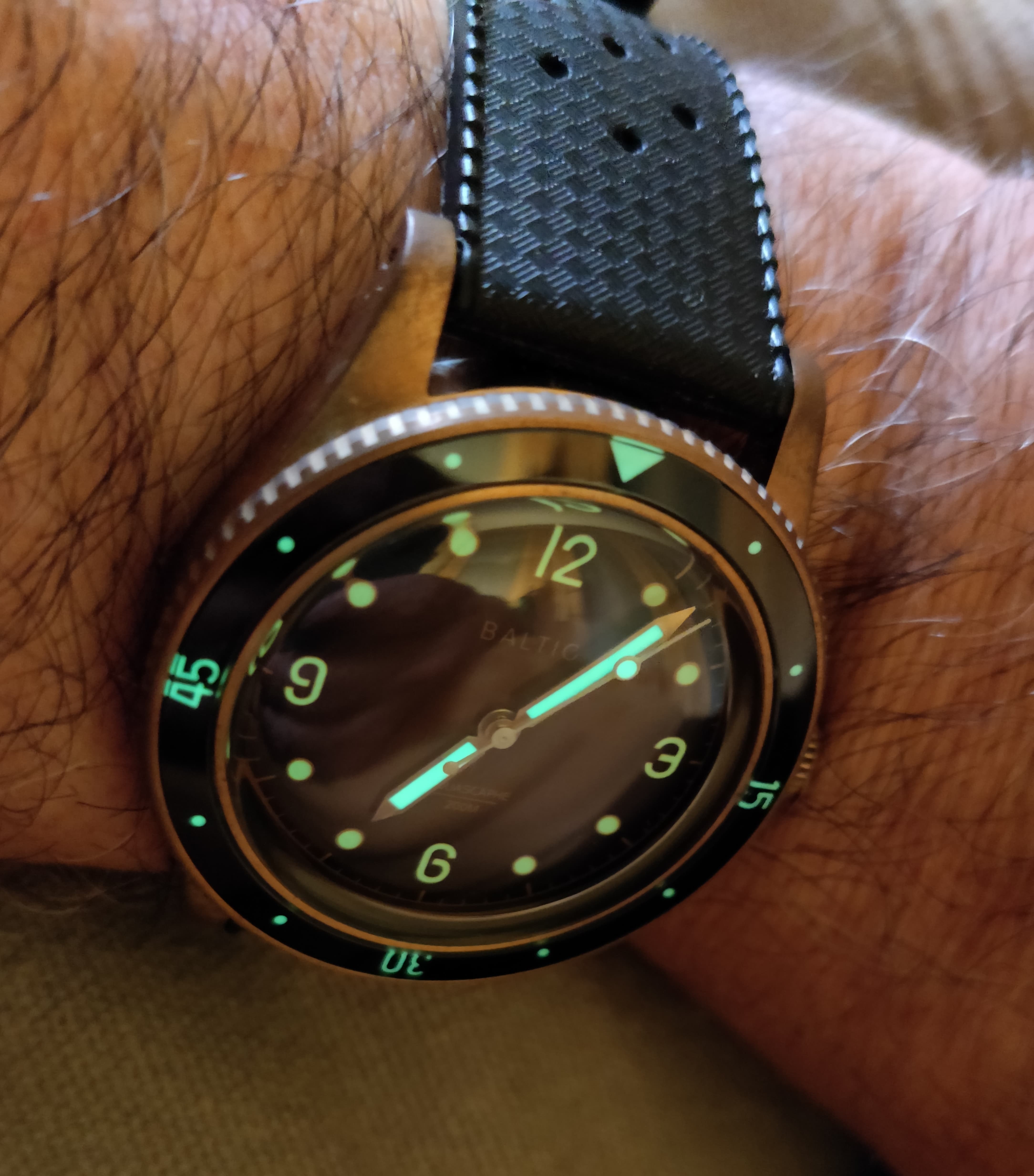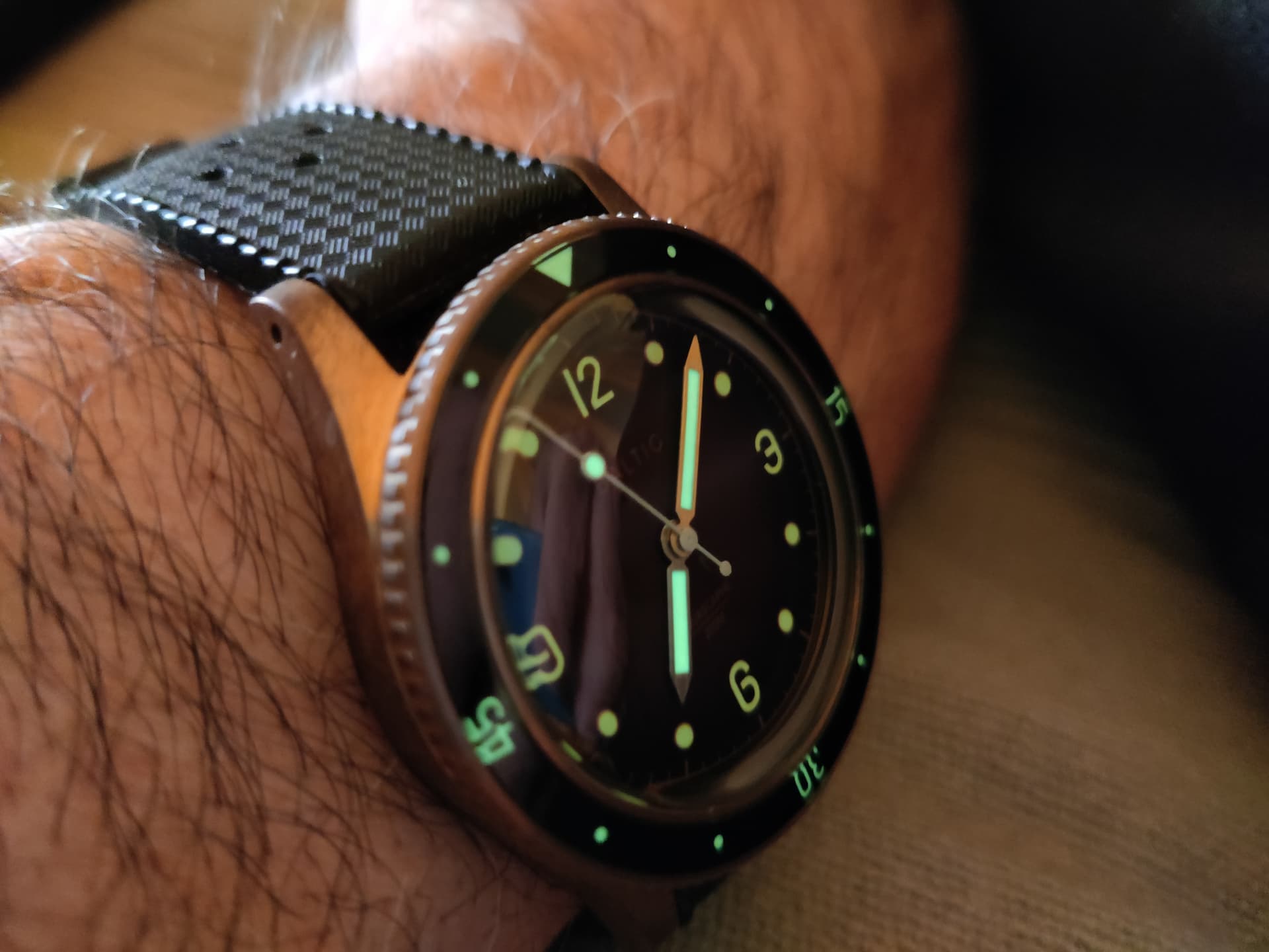 El reloj , me encanta, por el tamaño contenido, el estilo vintage, la aleación bronce aluminio, que le da una tonalidad más de barco, como digo yo, que el bronce estaño, la esfera degradada, el bisel con el inserto de zafiro,y porque no, también por el calibre Miyota, creo que está bien, que no es de los modelos más básicos de Miyota, por lo que he leído, y alguno de vosotros mé comentó . Las agujas y los índices, con cuatro numerales, y con el cristal de zafiro abovedado, cuando da la luz, es una pasada como refleja.