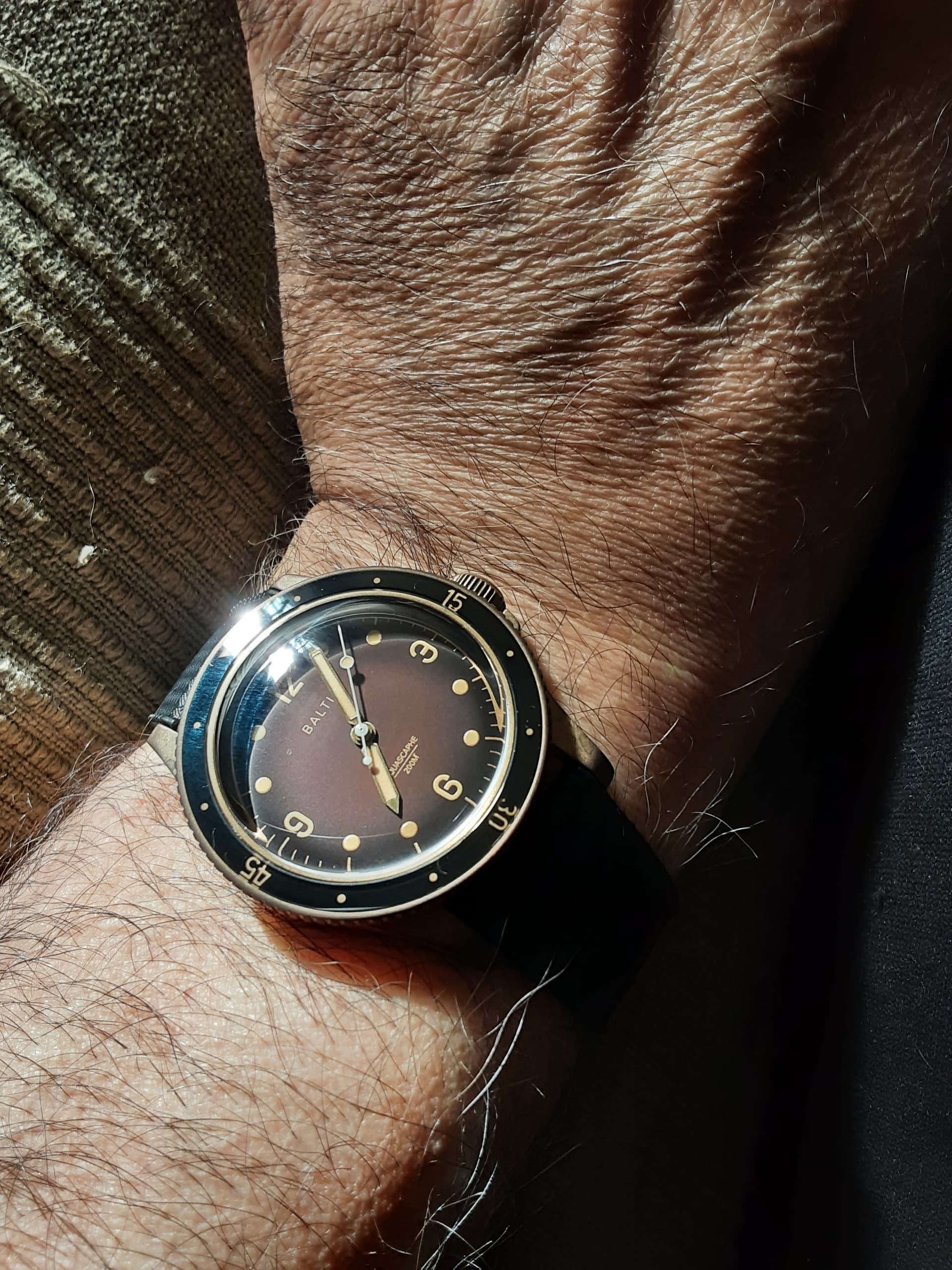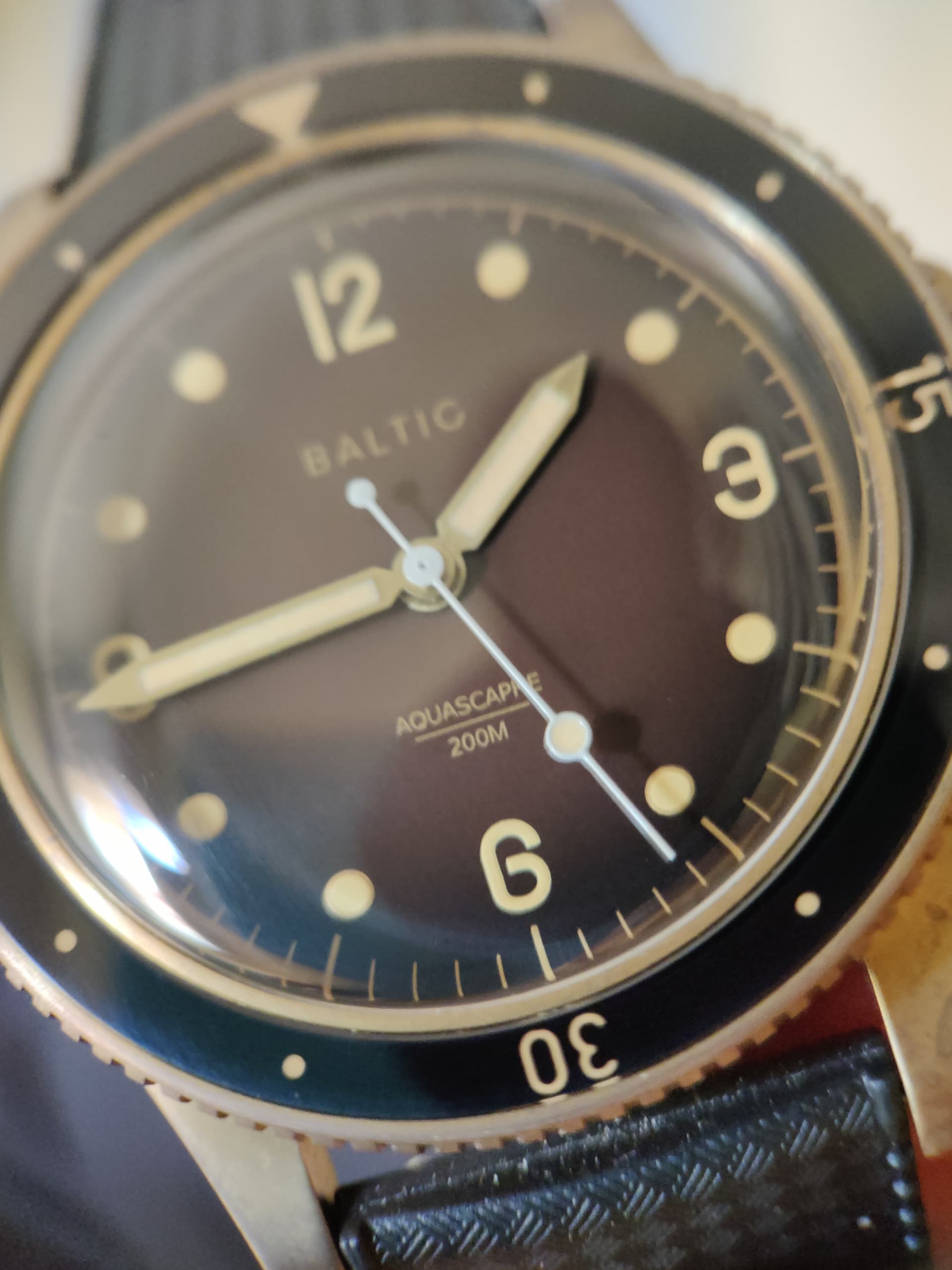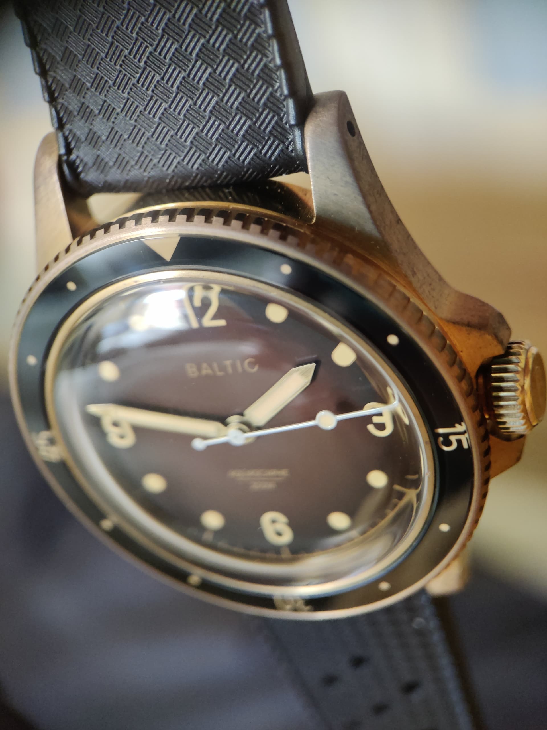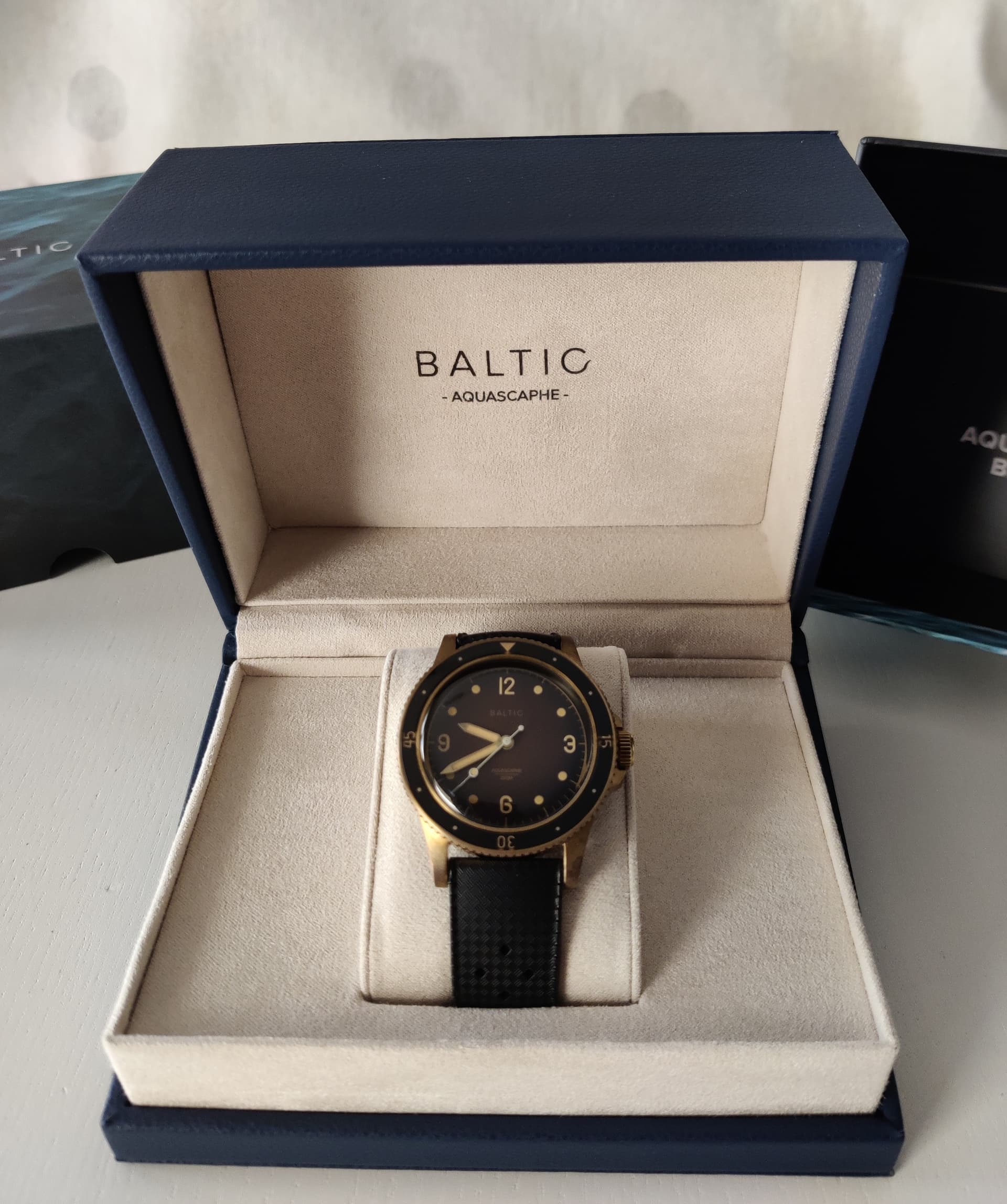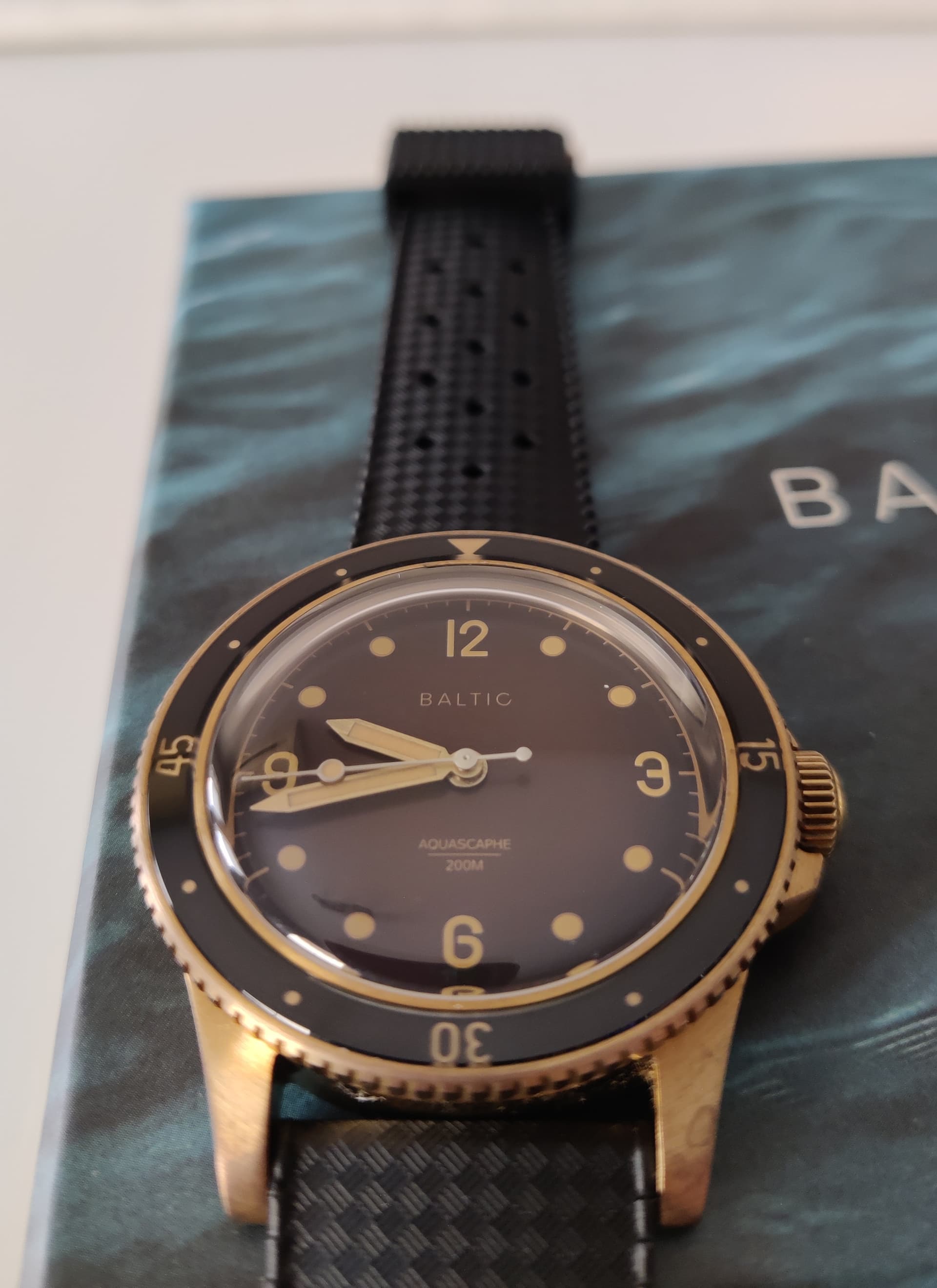 Se trata del Baltic Aquascaphe Bronze Brown. Este reloj ya me iba por la cabeza hace bastante, desde el abril 2023, cuando se presentó, y no he podido resistirme a la tentación, después de leer comentarios sobre él, positivos y algunos negativos, basándose principalmente éstos, en el precio y otros, por el movimiento que lo hace latir, el Miyota 9039.
