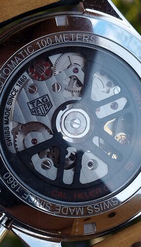 Aquí os pongo un detalle de su trasera, donde es el único sitio, donde aparece la marca Tag Heuer, al completo y donde se pueden ver la rueda de pilares, arriba, remarcada en rojo.