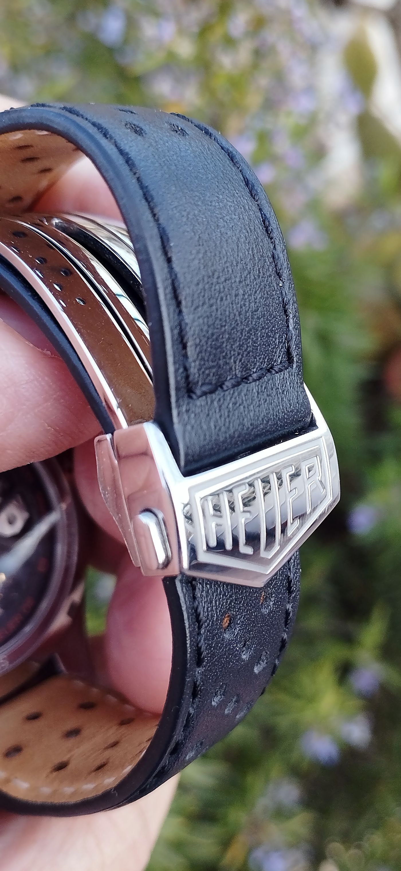 En mi caso, y gracias a su anterior dueño, lo llevo con una correa racing, con su deployante Heuer, muy cómodo y que me gusta bastante