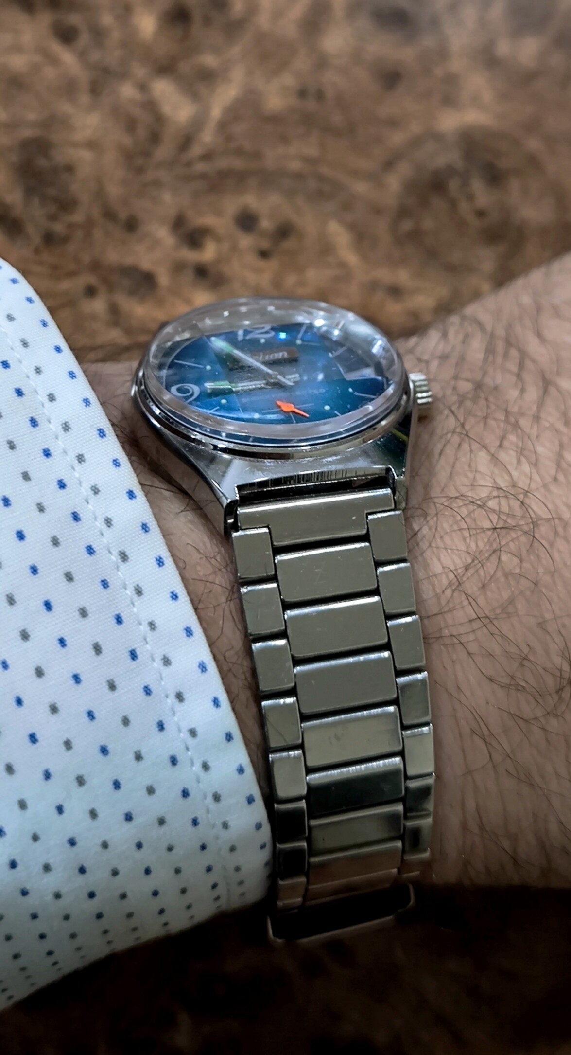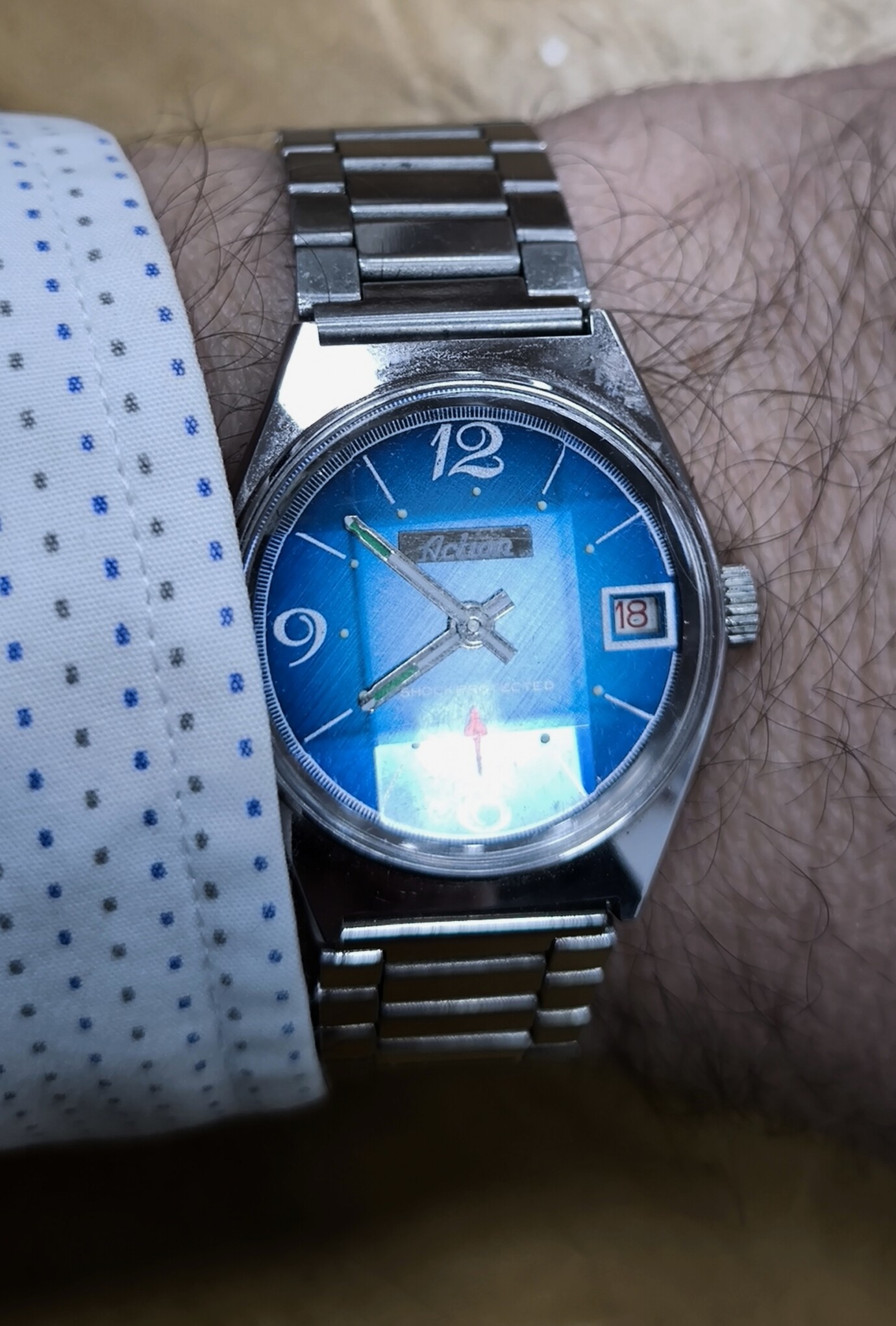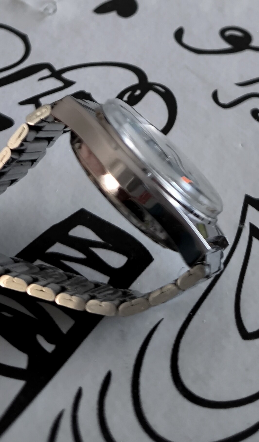 Aunque el cristal está bastante rayado deja ver una esfera y manecillas bastante vistosas, en mi muñeca de 18.5 queda tal que así