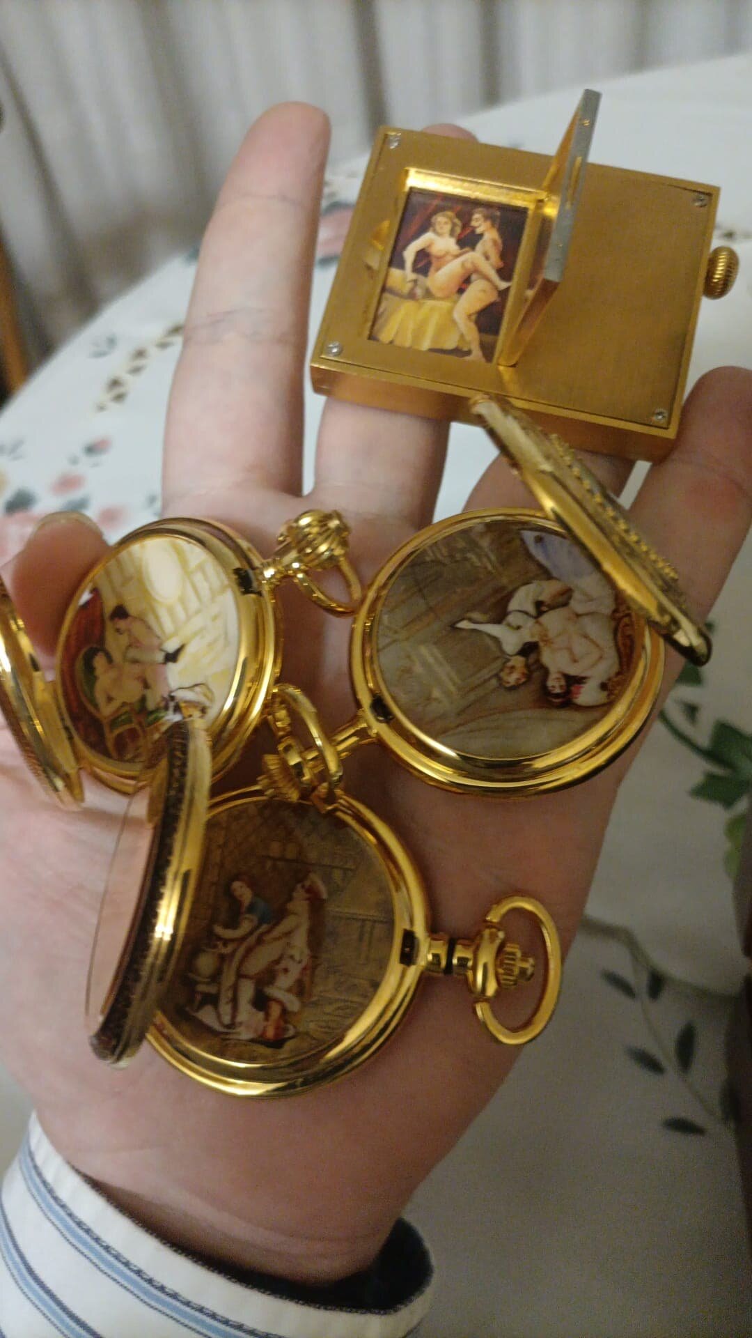 Pues… que ocultos tras unas tapas vemos unas imágenes que en tiempos serían consideradas escandalosas o prohibidas. Los relojes de bolsillo que mostraba esa vendedora en su puesto eran, como se llamaba en su día en el argot relojero, “conversacionales”. O “picarescos”, como los cuentos de Honoré de Balzac.
