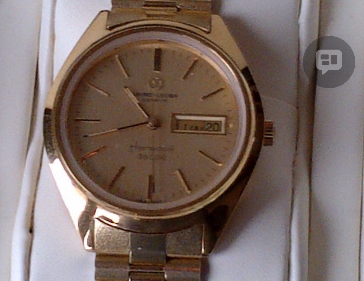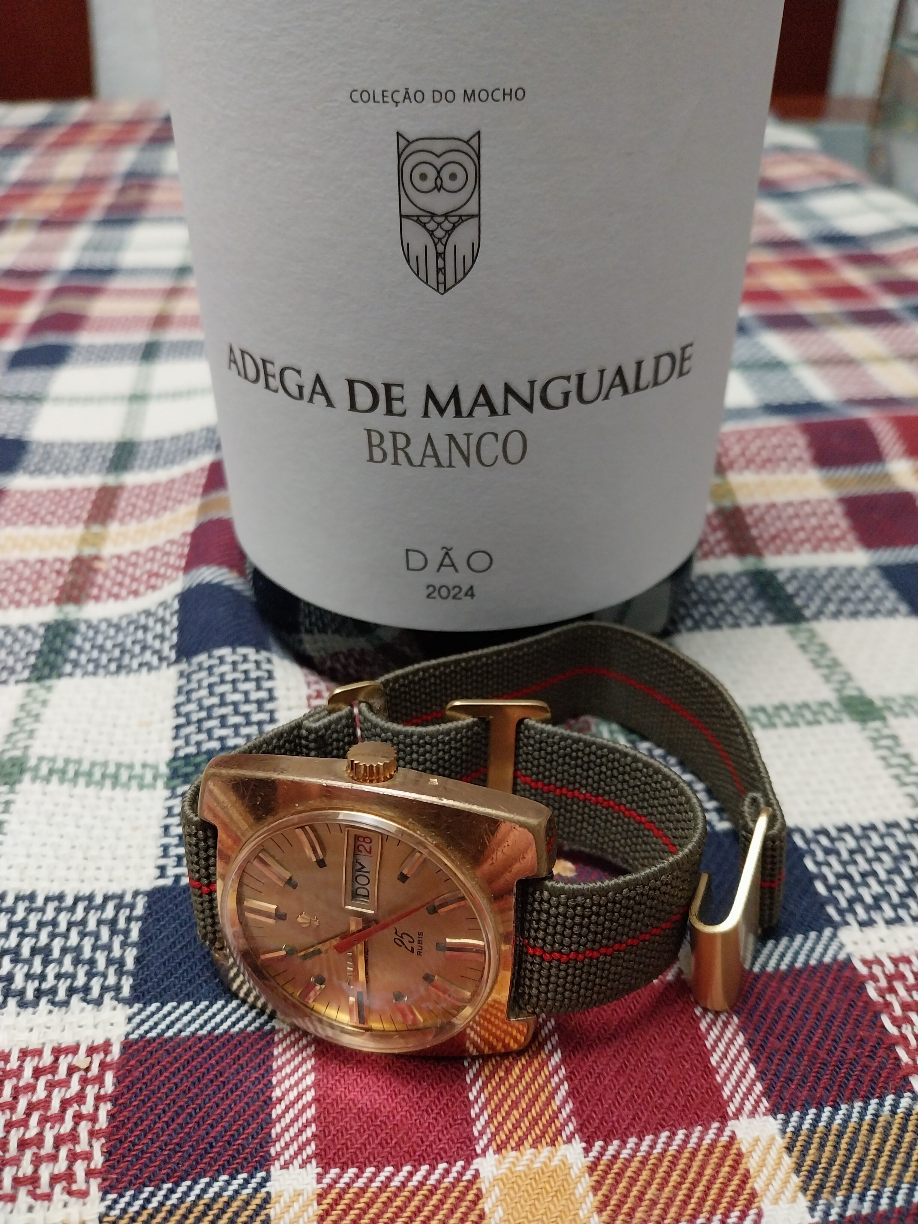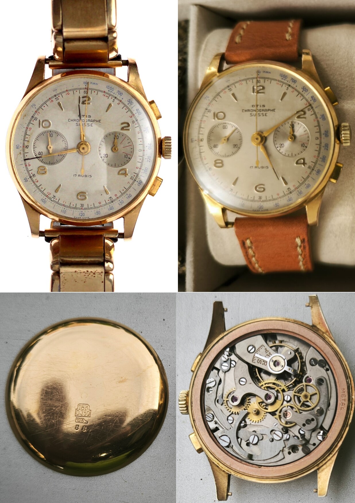 Se trata de mi “Cronógrafo Suizo” de manual. Es decir, 4 y pico gramos de oro de 18k en una caja como el papel de fumar de fina, y su Landerón 48. Pero ni un bollo reseñable. Es de la marca “OTIS” de la cual, por más que he buscado, no he encontrado nada, salvo una reseña en Mikrolisk.de (si alguien puede dar información adicional, se lo agradecería enormemente). Me costó bastante menos de 400€, sin funcionar pero limpísimo. Lo llevé a arreglar y resulta que había una chapilla de metal interpuesta entre los engranajes. Me dijo el relojero que, probablemente, su anterior propietario no había aceptado el presupuesto del arreglo y el relojero en cuestión se lo “capó” de esa manera. Le compré un muelle real nuevo en Yankilandia, y se lo puse también. Total, por otros 50€ más ya lo tengo latiendo con una fuerza que da gusto oírlo. Además, es de los de tapa del fondo en oro, que los hay con tapa de hierro y a mí me parecen algo menos meritorios. Estoy encantadísimo con él porque no hay colección de clásicos que se precie que no posea su “Chronographe Suisse”, pues, por muy modesto que sea, que lo es, es también un icono total. La correa que tiene actualmente es como la segunda pero ajustándole perfectamente; ésa que se ve me la enviaron equivocada y tuve que devolverla. Ahí va: